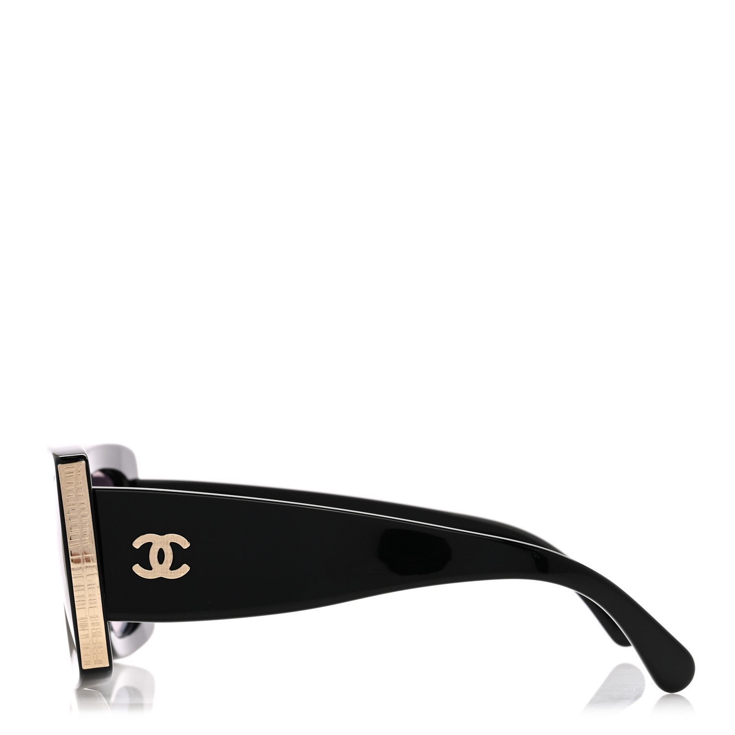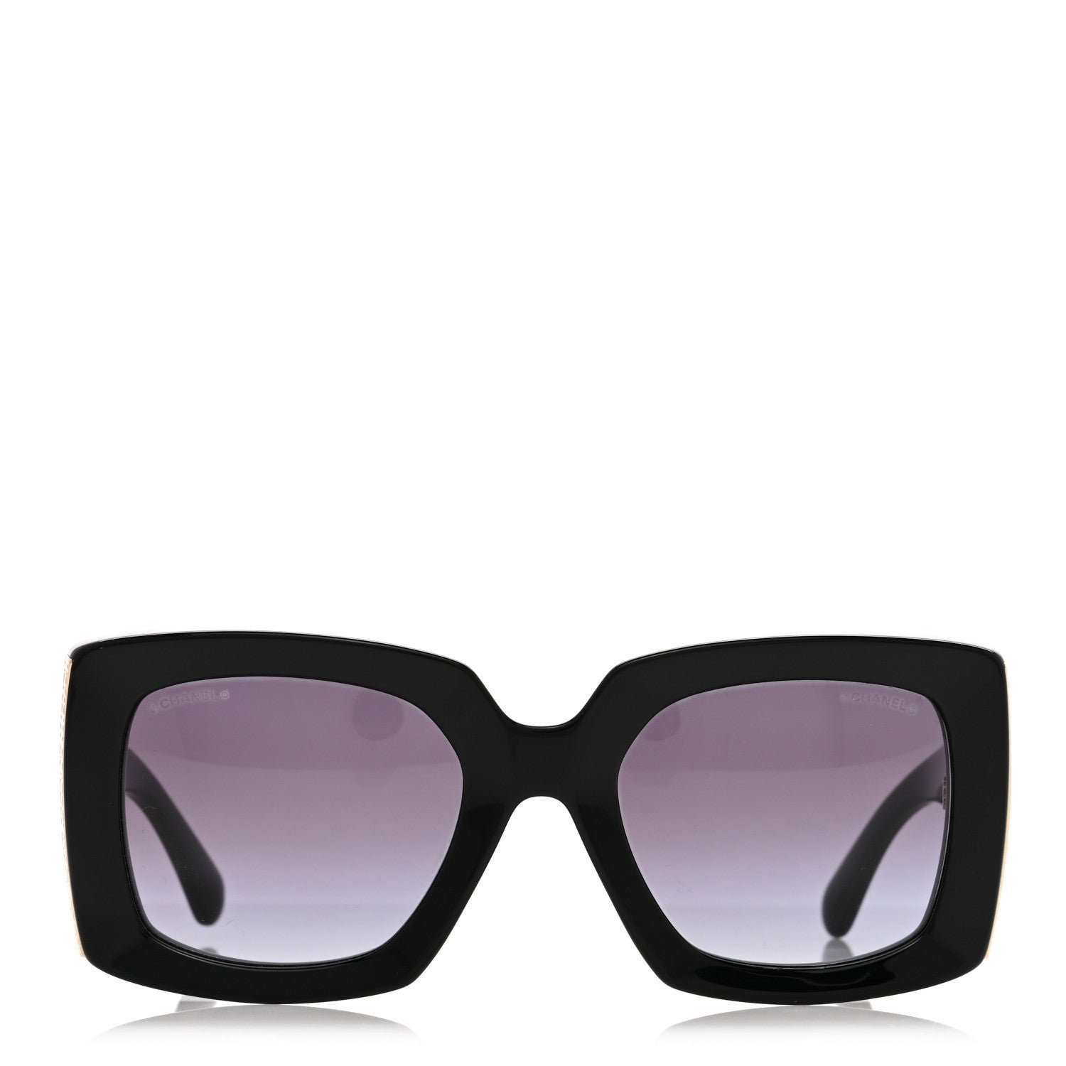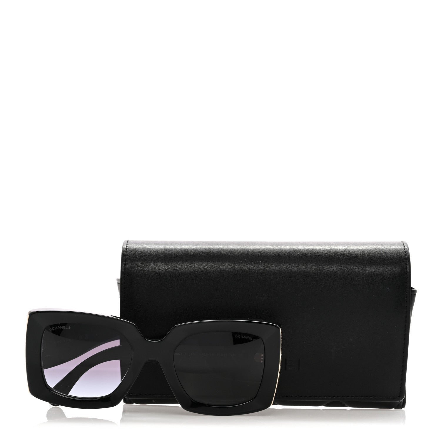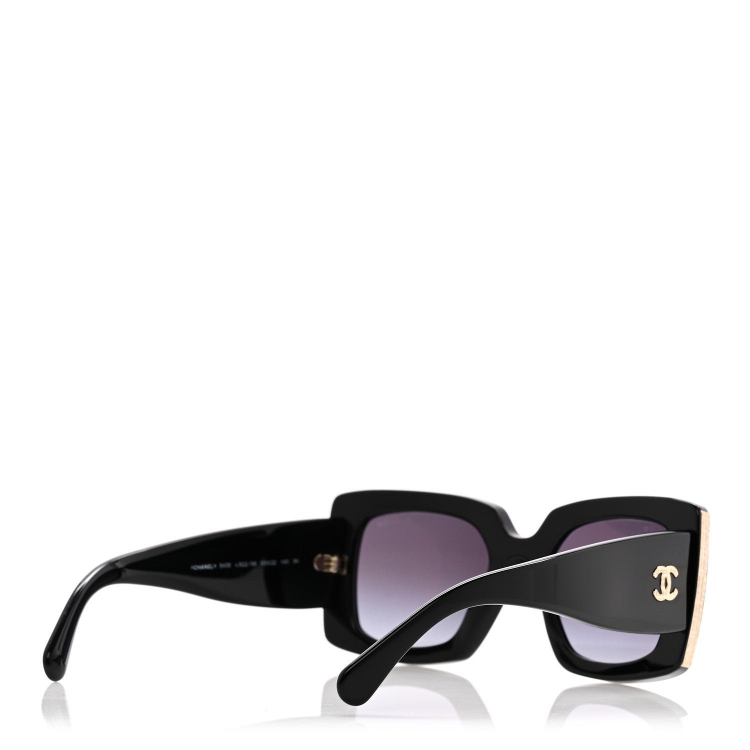 This is an authentic pair of CHANEL Acetate Rectangle Sunglasses 5435 in Black. These stylish sunglasses feature black rectangular frames with black lenses, gold accents at the sides of the frame, and small gold CCs on each hinge.