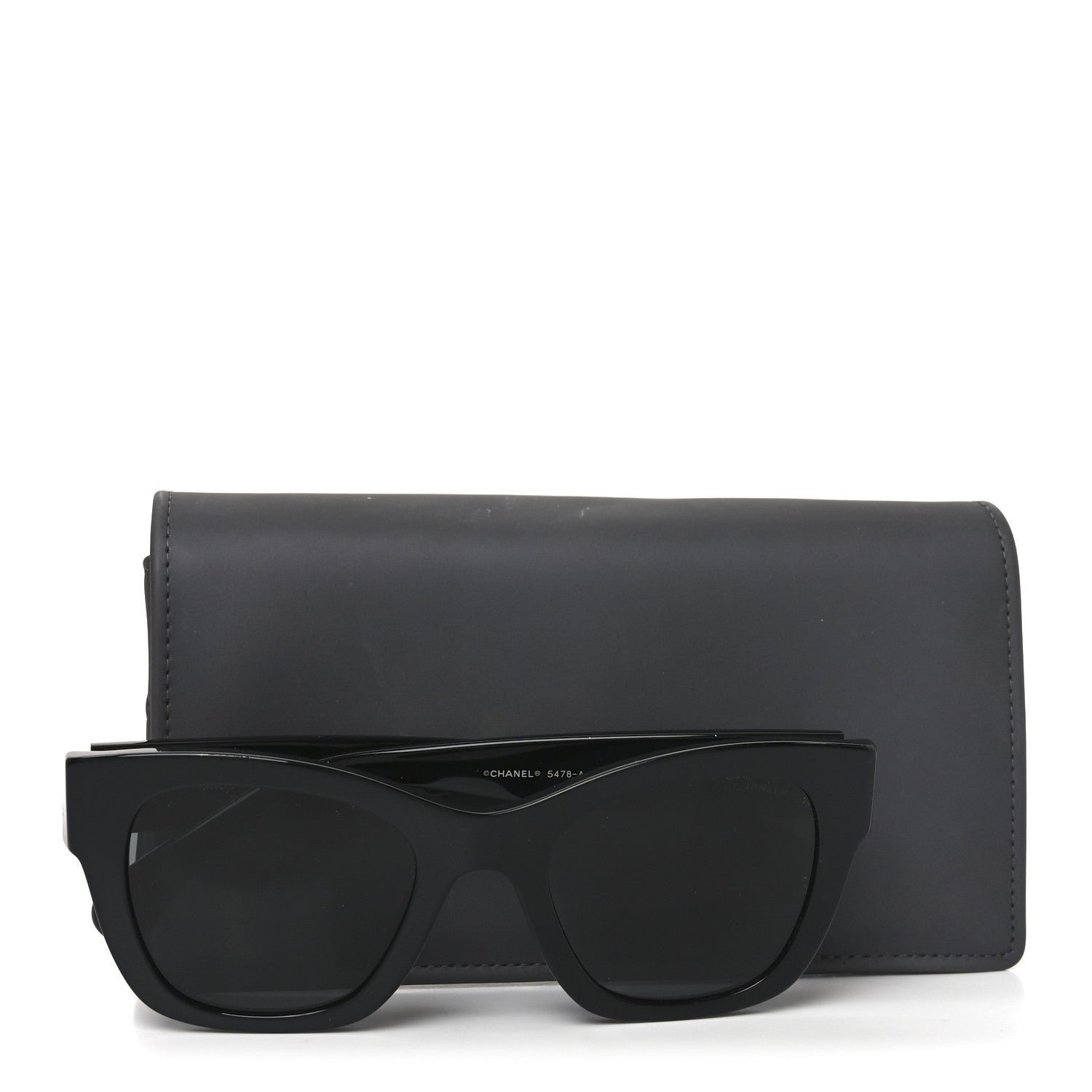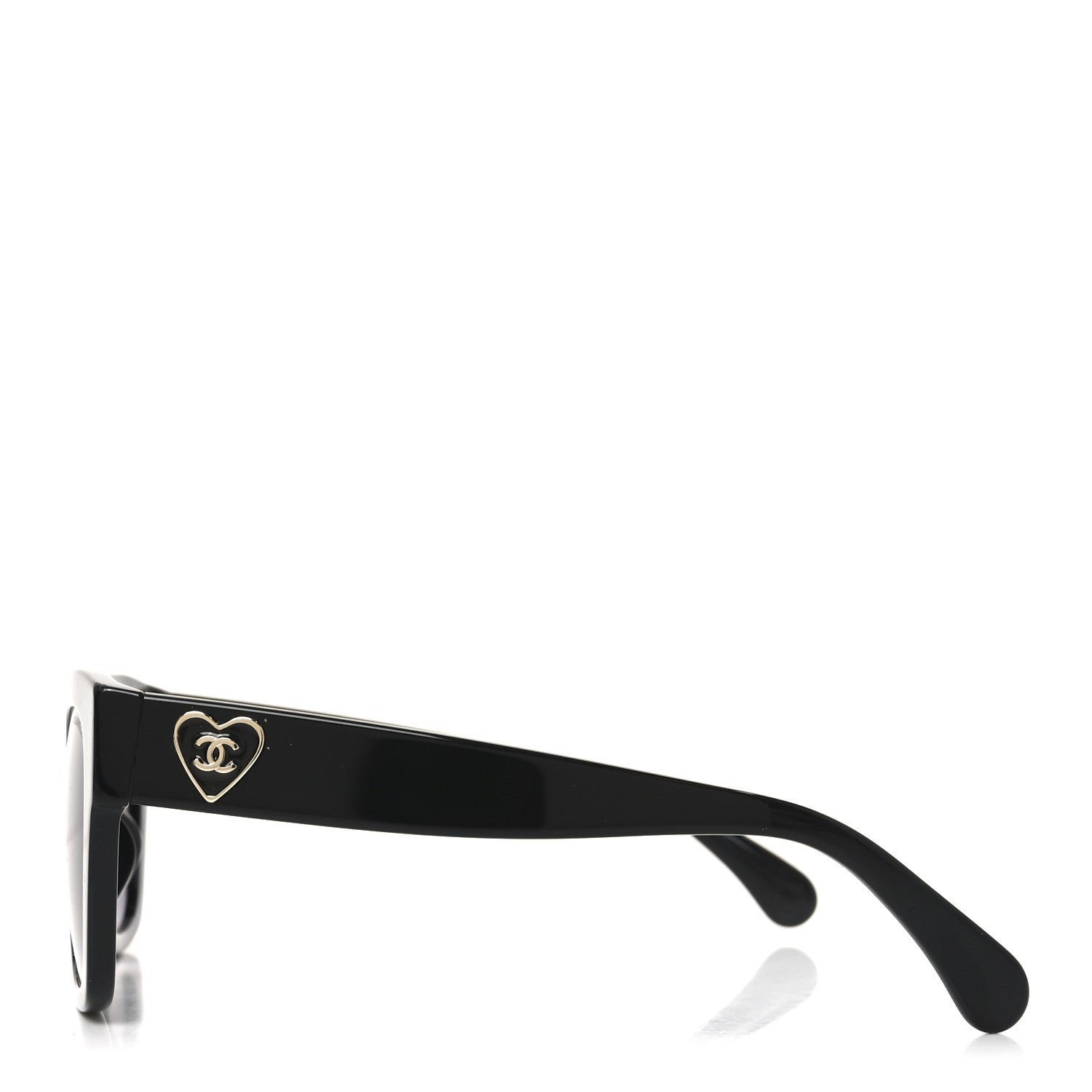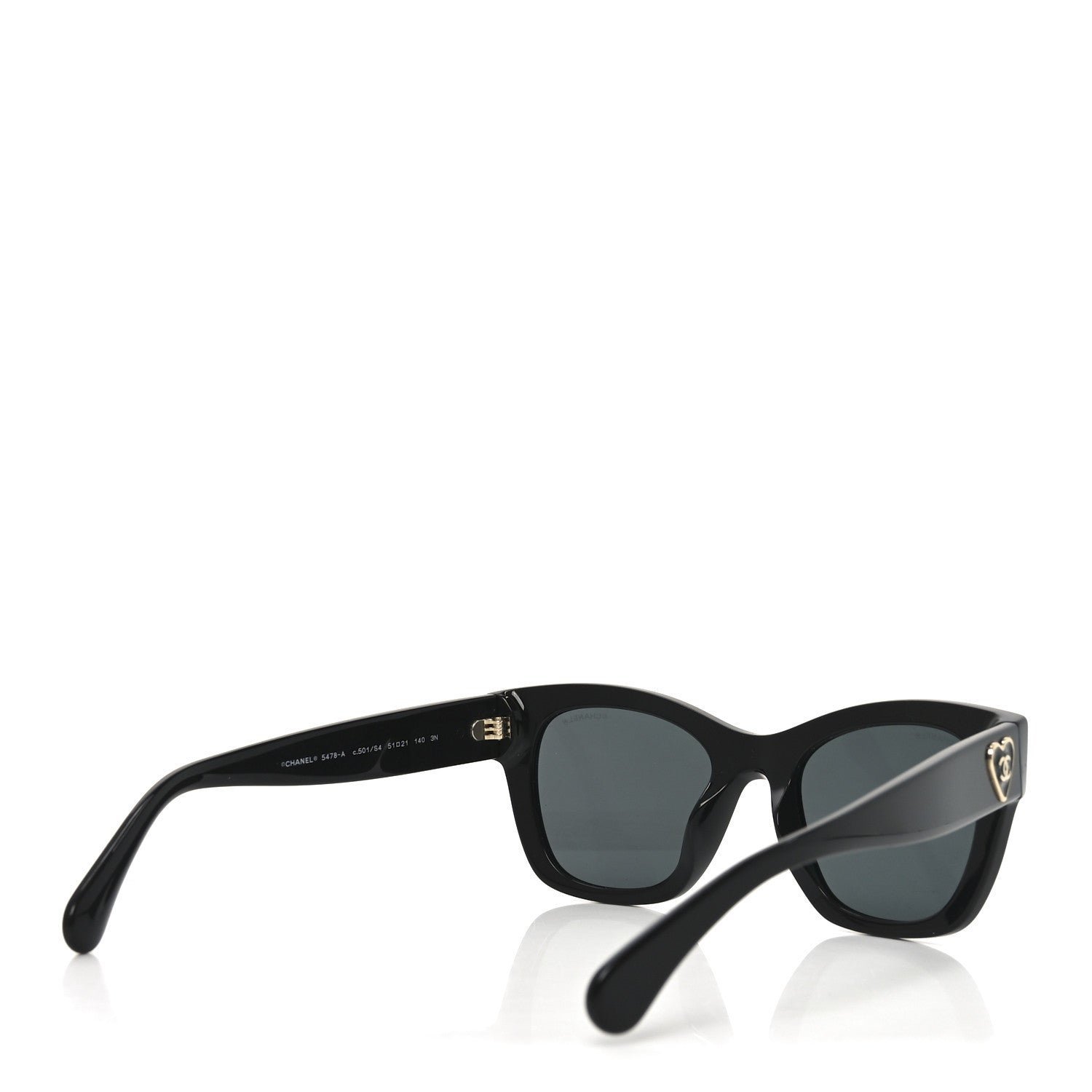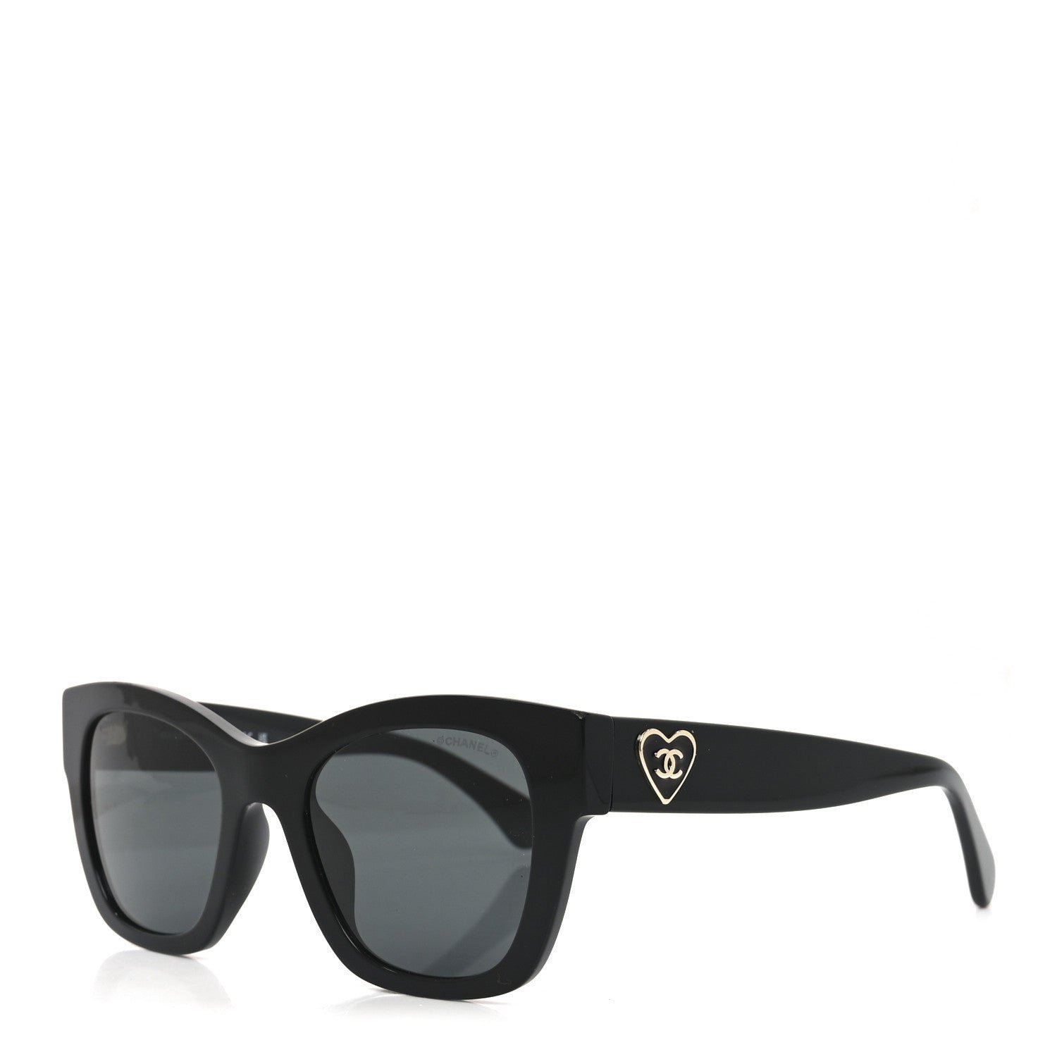 This is an authentic pair of CHANEL Acetate Square CC Heart Sunglasses 5478-A in Black. These classic sunglasses have a black frame with black lenses. The temples feature CC heart logos in gold.