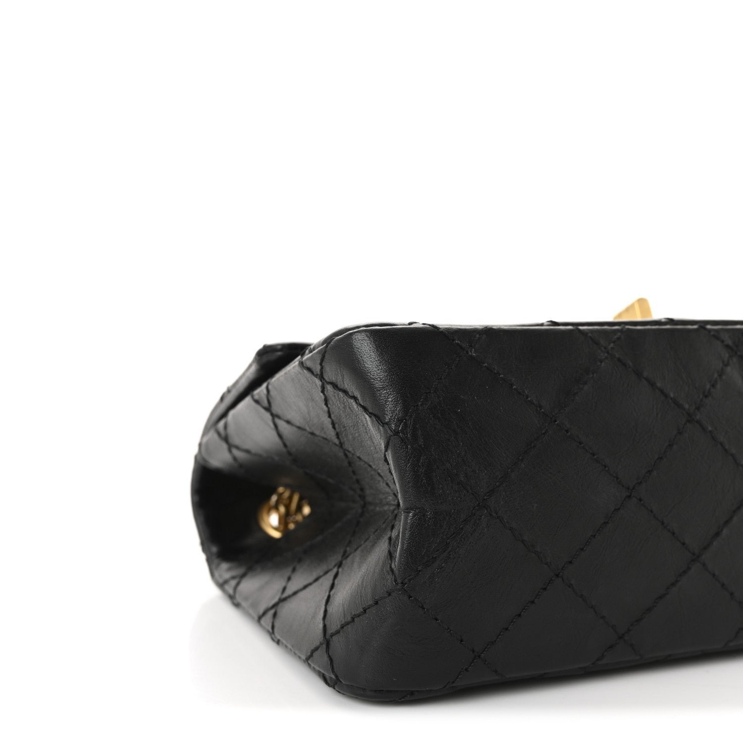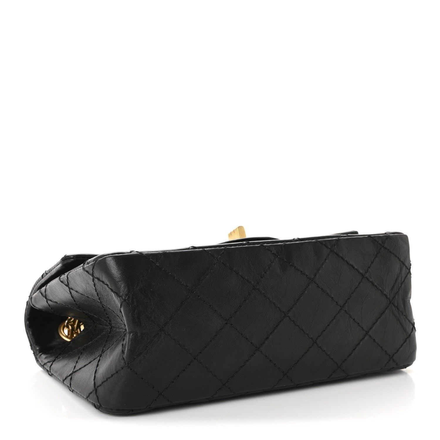 This specific model is crafted from black aged calfskin leather, a material chosen for its distinctive “wrinkled” or distressed finish that authentically replicates the appearance of the original bag carried by Gabrielle Chanel. It features the iconic diamond quilting, a signature House code inspired by the quilted jackets worn by stableboys and jockeys. The signature design element is the “Mademoiselle” turn-lock closure, a rectangular clasp named in reference to Coco Chanel’s status as an unmarried woman.