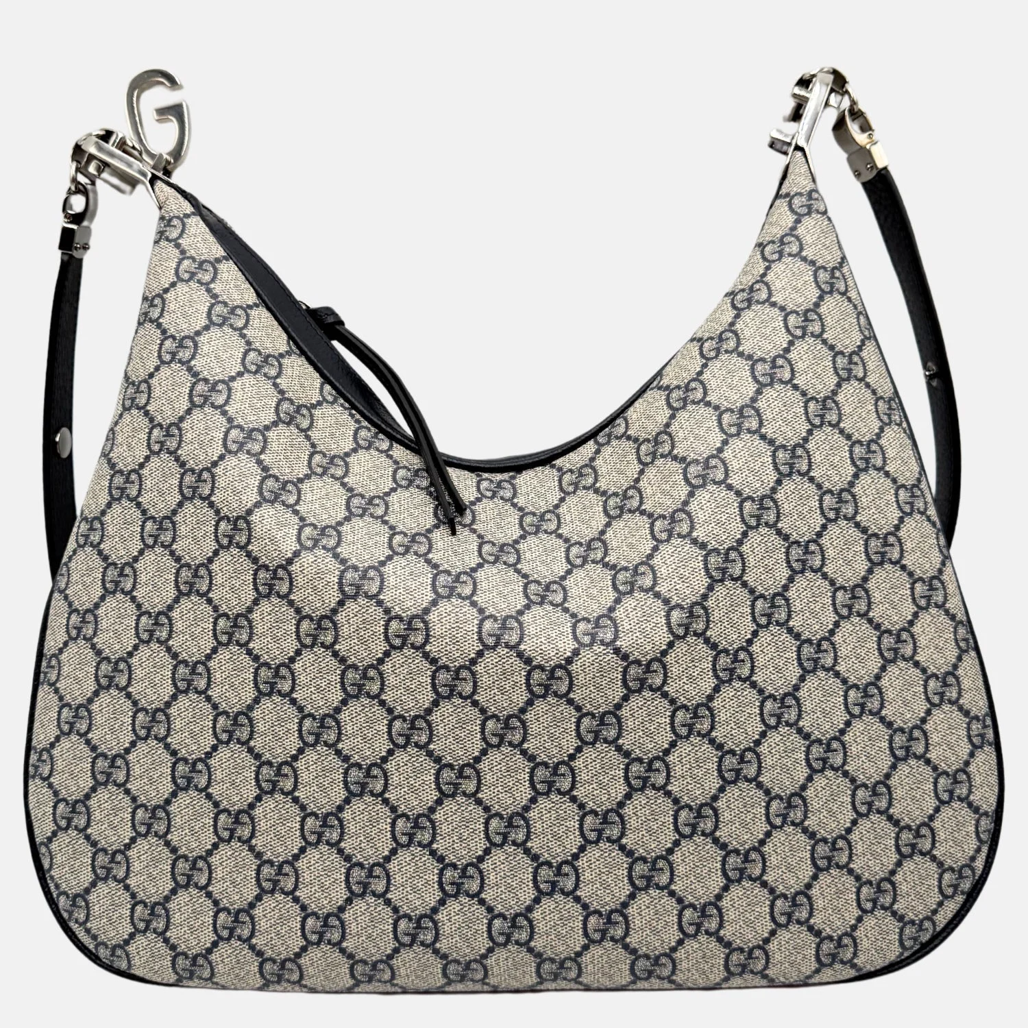The Gucci Attache Shoulder Bag Beige GG Supreme Canvas Large is a bold revival of a house archive silhouette, reimagined with sculptural curves and modern hardware. Crafted in GG Supreme canvas with black leather trim, this slouchy hobo-style design features a standout G-hook clasp that joins the two strap ends at the top. The oversized form and soft construction make it an effortless statement for everyday wear, blending vintage influence with contemporary edge.