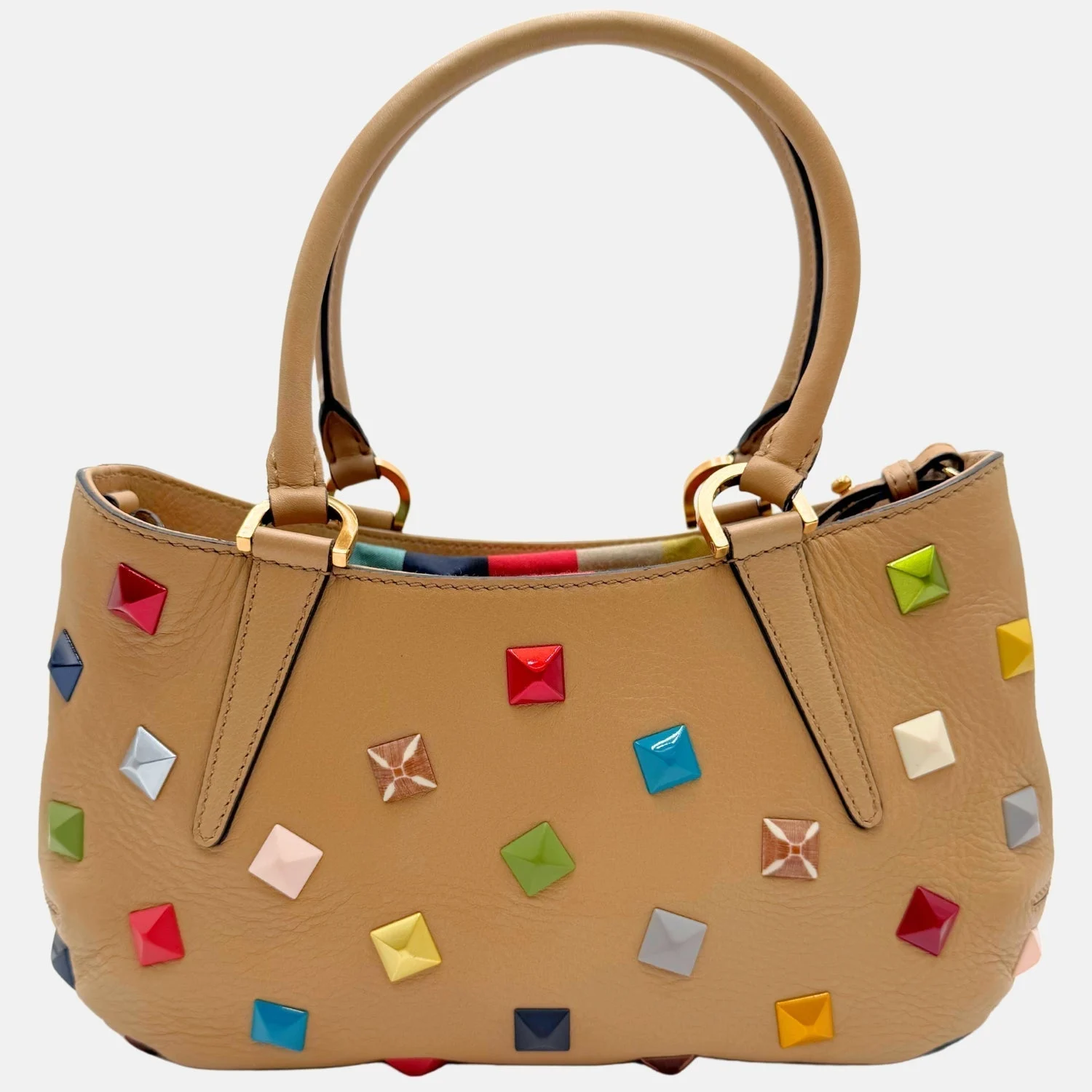 The Fendi B. Fab Studded Bag Small is a bold, statement-making accessory that made waves on the runway and quickly captured the attention of editorial photographers. The bag features a multicolored Pequin striped drawstring pouch inside, complete with a strap for shoulder wear, while the exterior is adorned with vibrant, multicolored lacquered pyramid studs for an edgy and playful design. With a compact, structured shape and detachable chain strap, it offers versatile wear as a shoulder or crossbody bag. The discreet Fendi logo on the front adds a subtle touch of branding. Stylish and functional, this bag covers numerous trends and is sure to be loved for many seasons to come. Retail price: $2840.