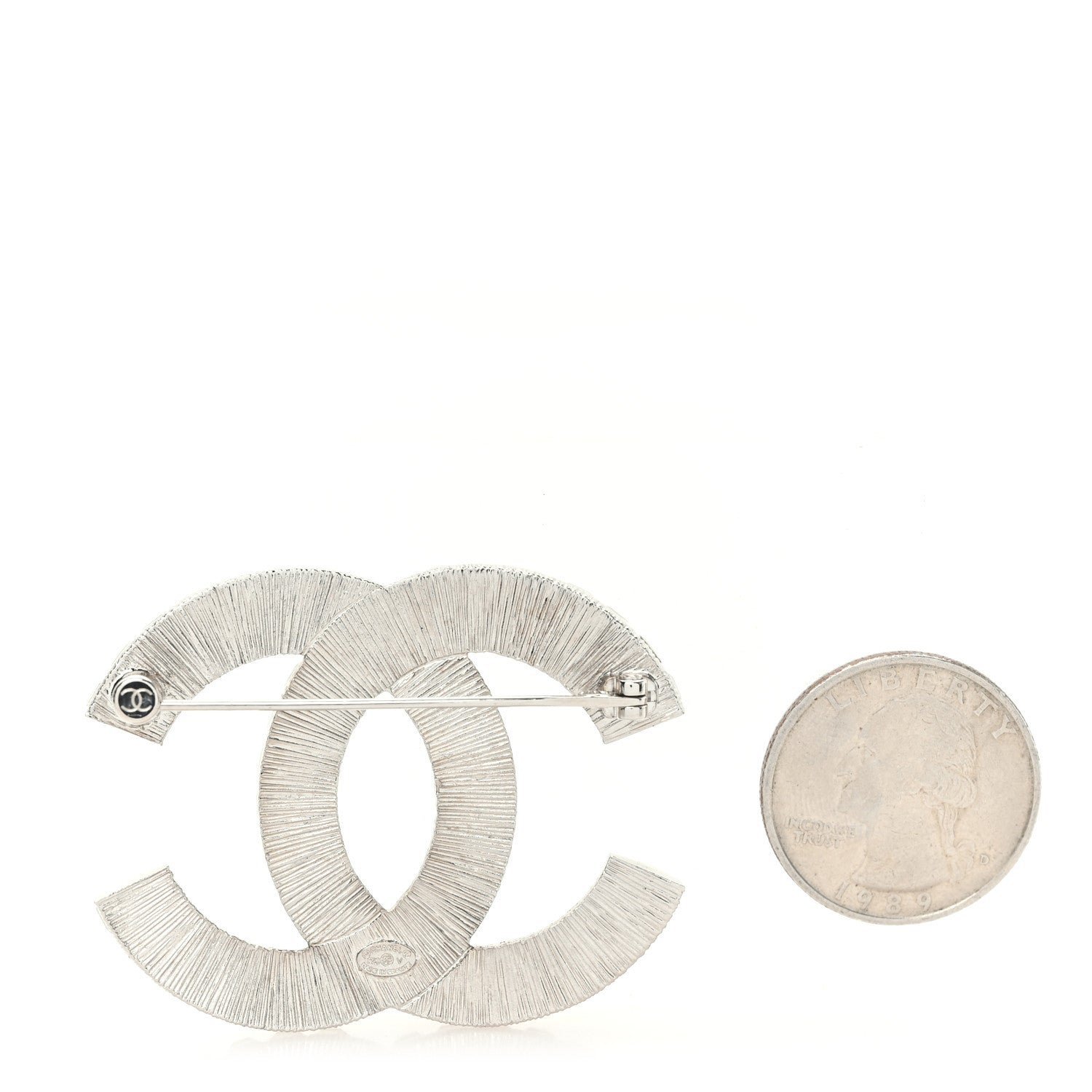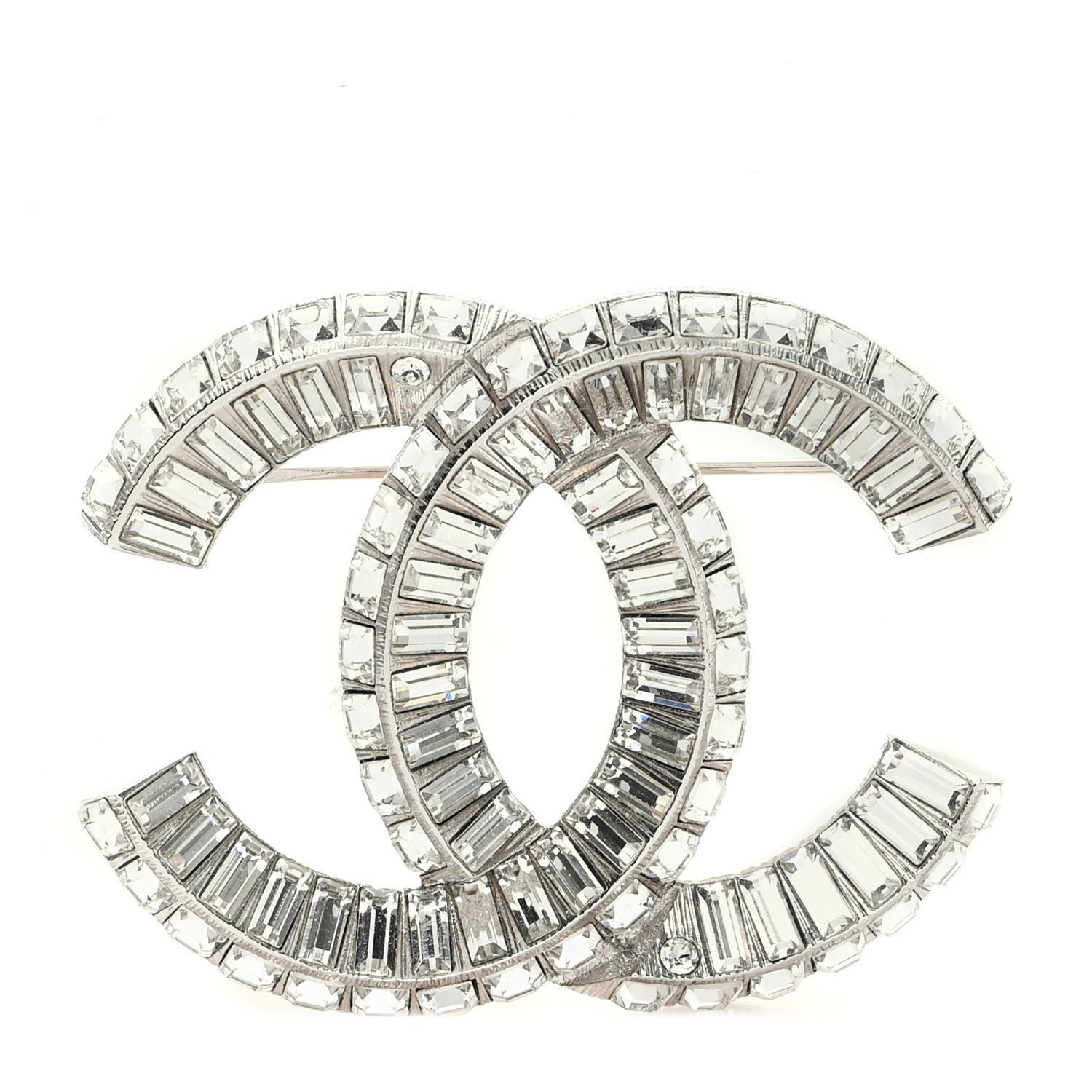 This is an authentic CHANEL Baguette Crystal CC Brooch in Silver. This brooch is a large silver Chanel CC logo lined with baguette crystals.