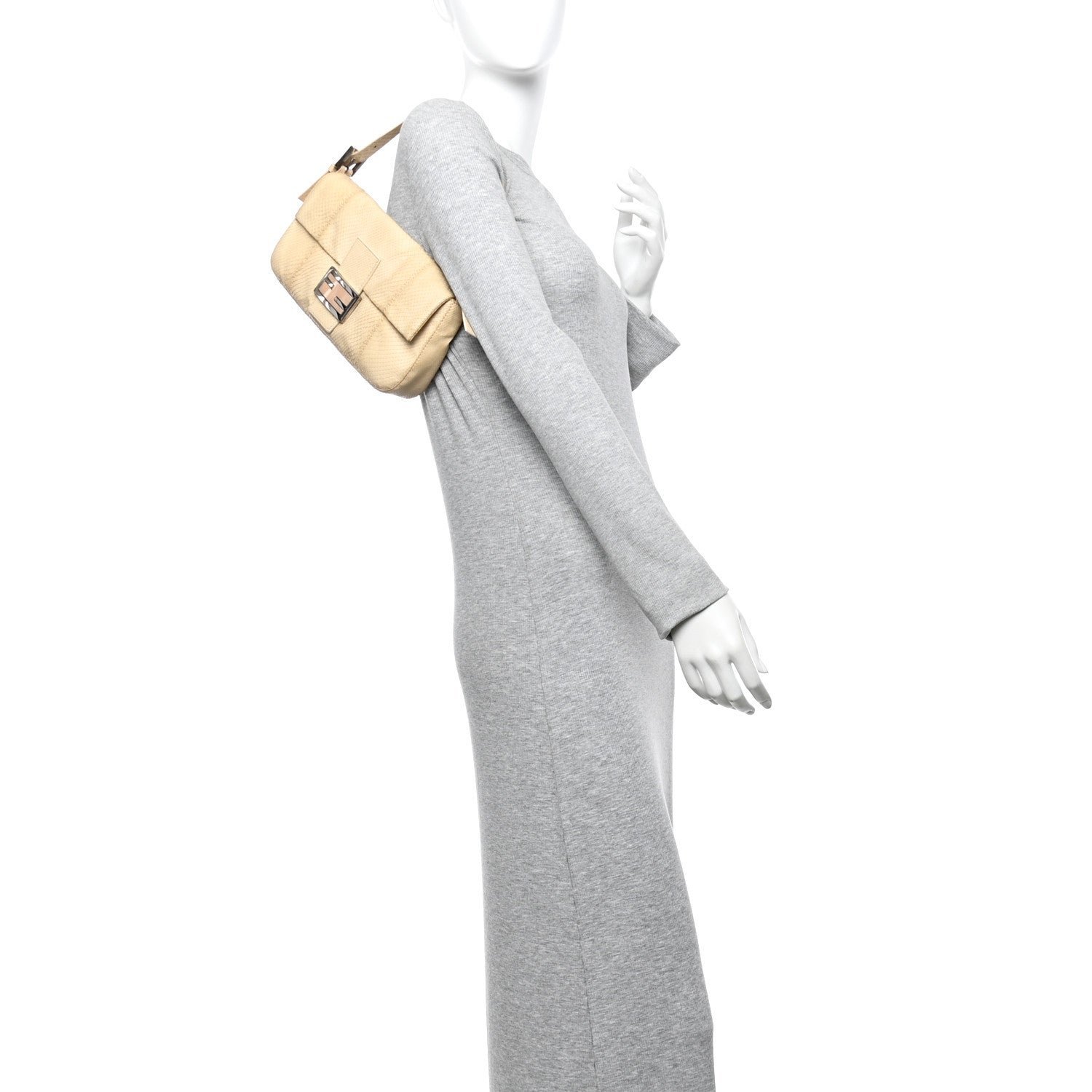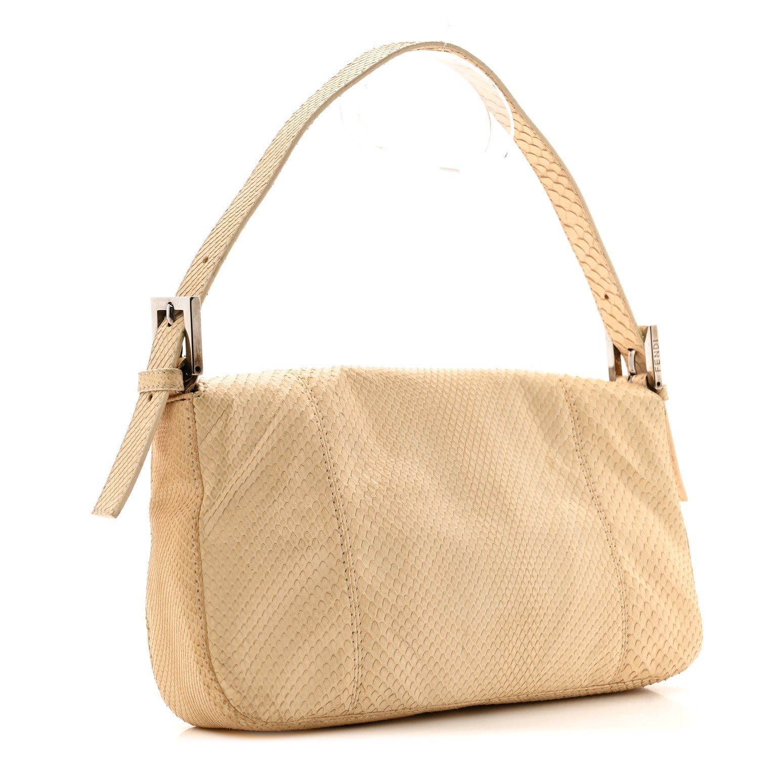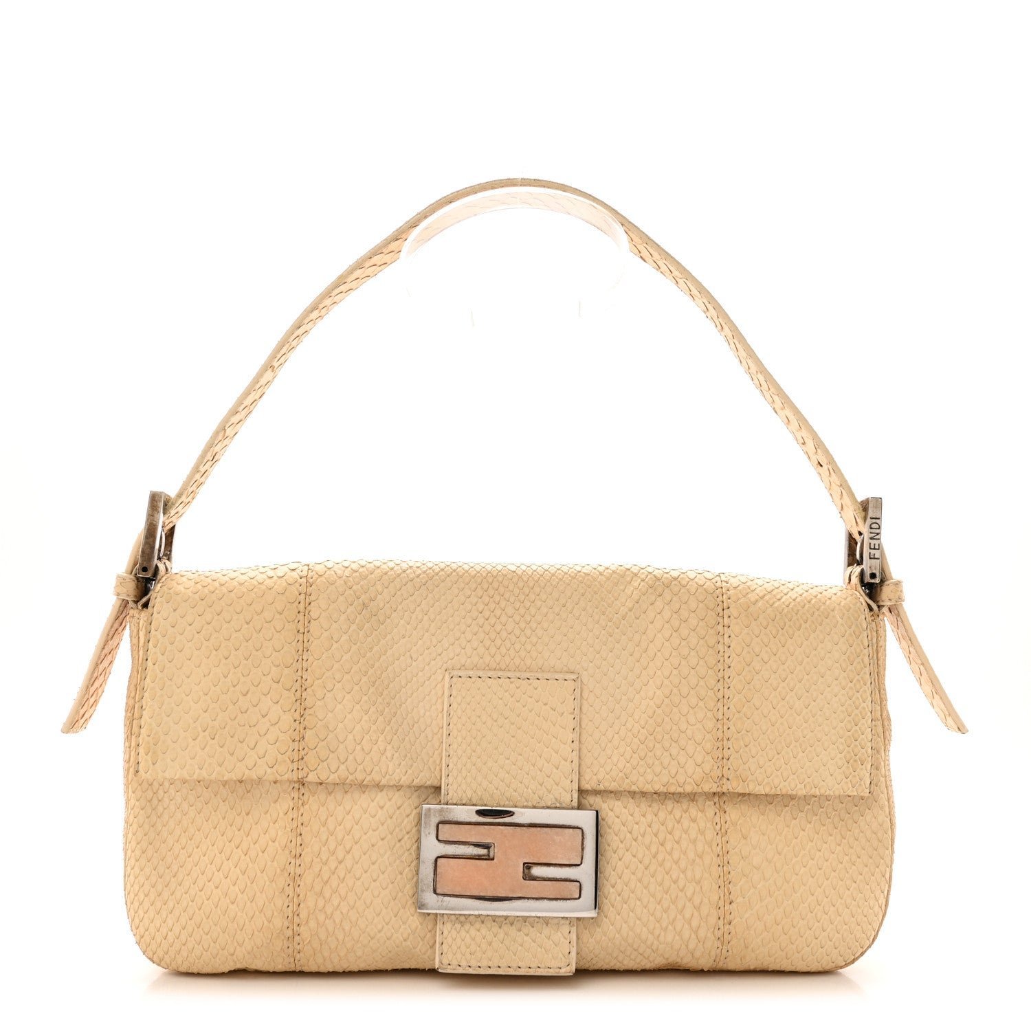 A collector’s piece from the House of Fendi, this Baguette bag is meticulously crafted from premium python snakeskin in a soft, light beige hue. The natural variations of the python scales provide a unique, organic texture that elevates the bag’s minimalist rectangular shape.