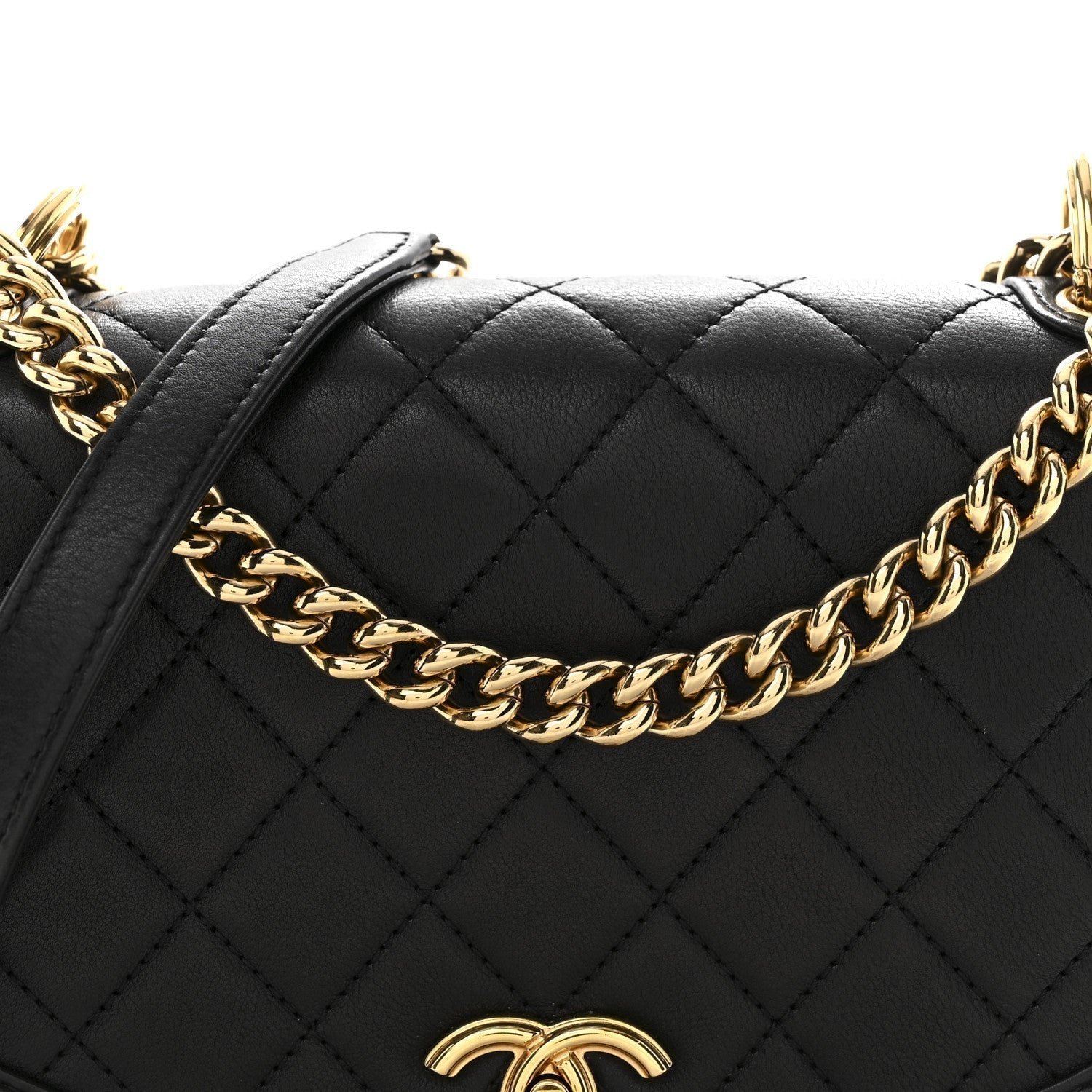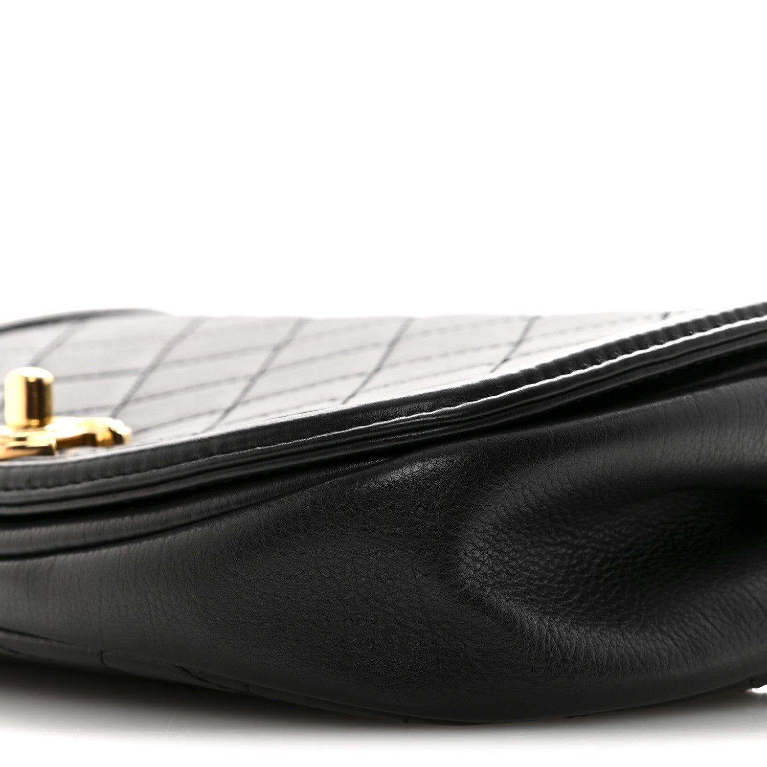 This specific model is crafted from black quilted calfskin leather, featuring a sleek and refined texture that offers more durability than traditional lambskin. Introduced in the 2019 collection, the “Underline” flap is defined by its clean, modern silhouette that pays homage to the House’s classic codes while offering a contemporary edge. The signature design element is the “underlined” base, which provides a structured, slightly curved foundation that distinguishes it from the flat bottom of the Classic Flap.