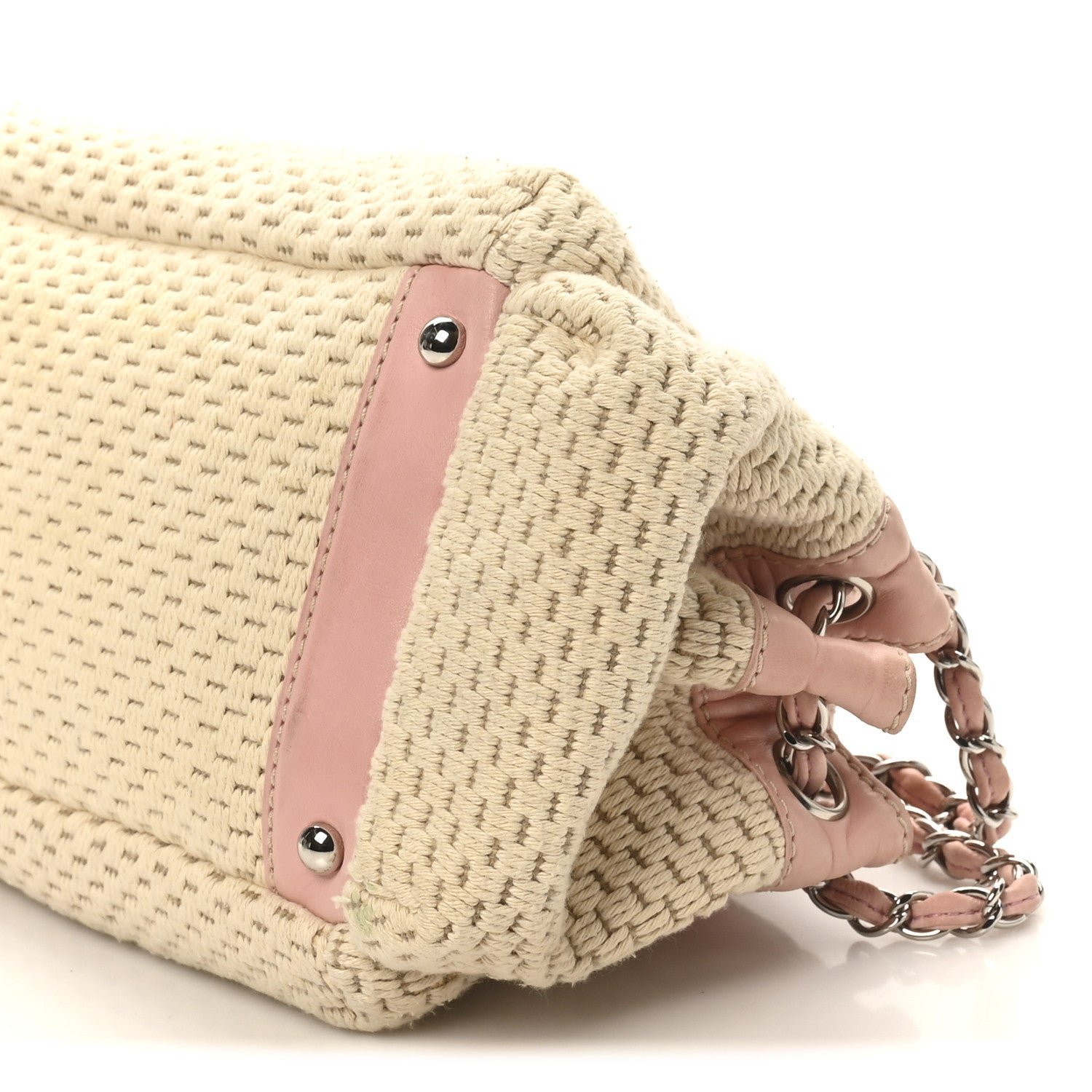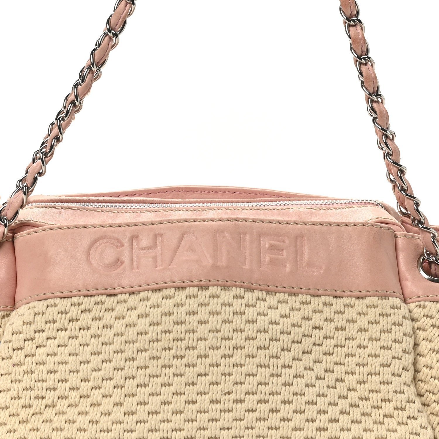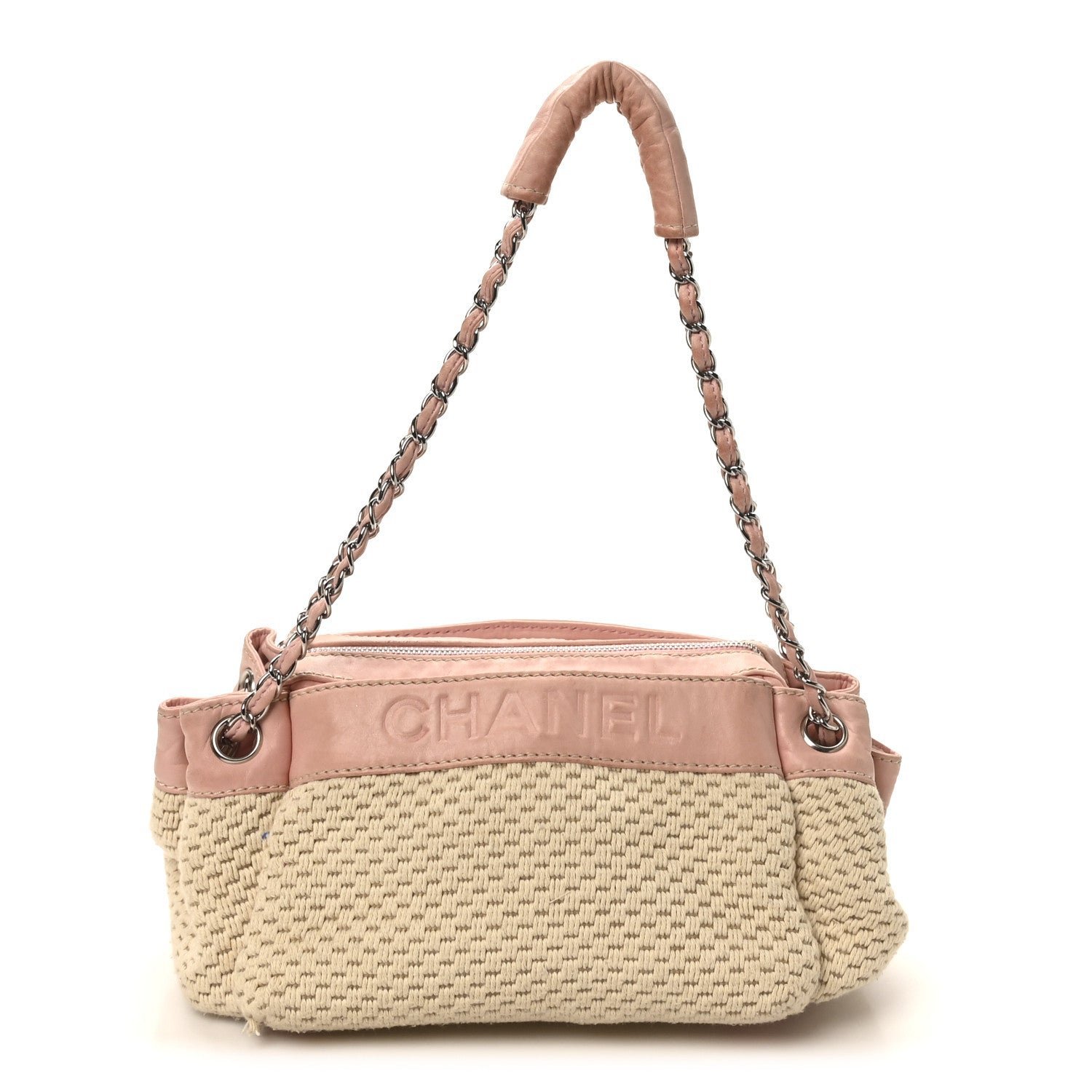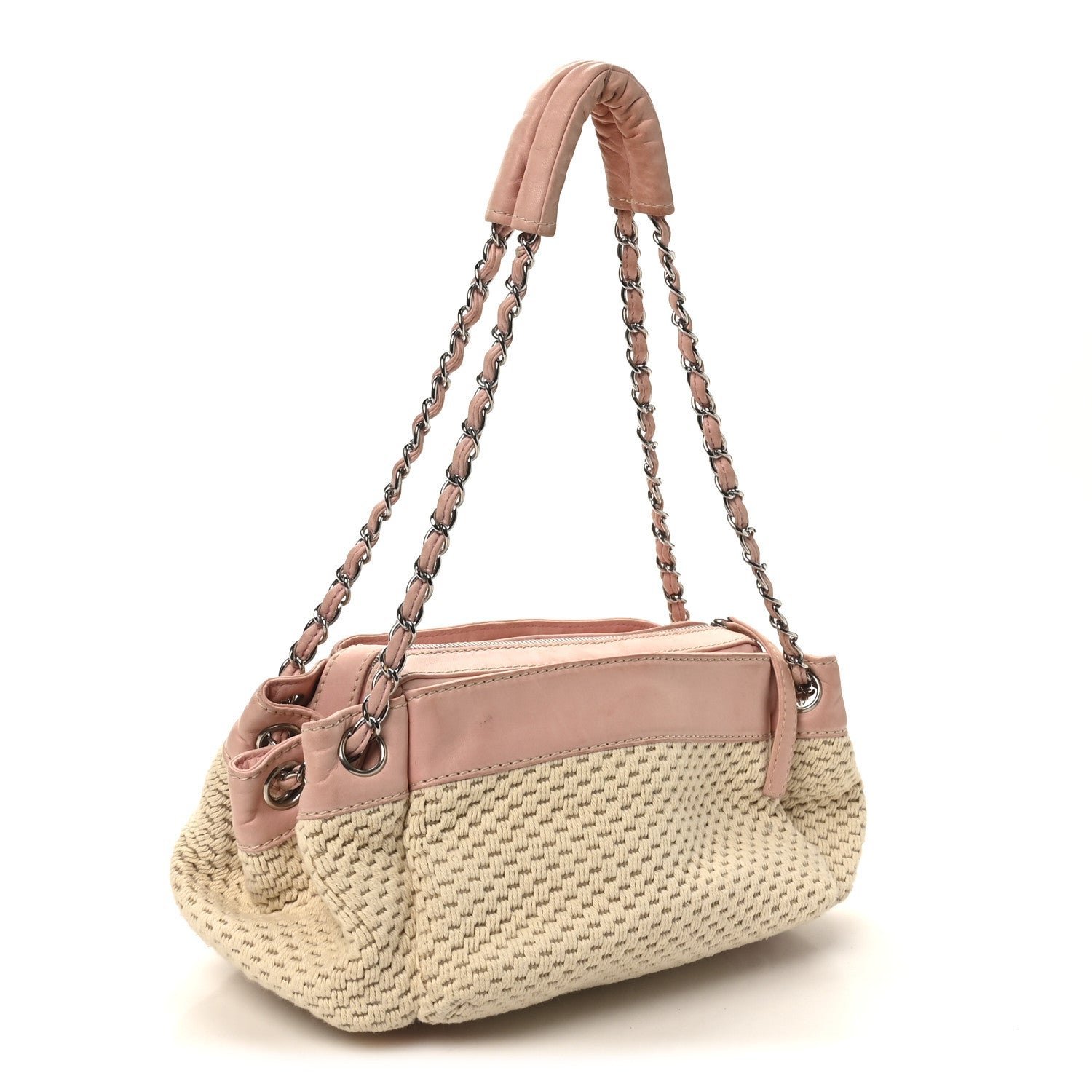 Designed for comfortable, everyday wear, the hobo features a single interwoven silver-tone chain and pink leather shoulder strap with a padded leather section at the top for added comfort. The bag typically features a top zipper closure to keep items secure and opens to a tonal fabric interior equipped with a zippered pocket and a mobile phone slot. Its mix of neutral canvas and soft pastel leather makes it a quintessential “resort” style piece from the early-to-mid 2000s era.