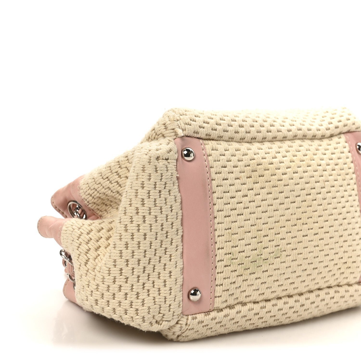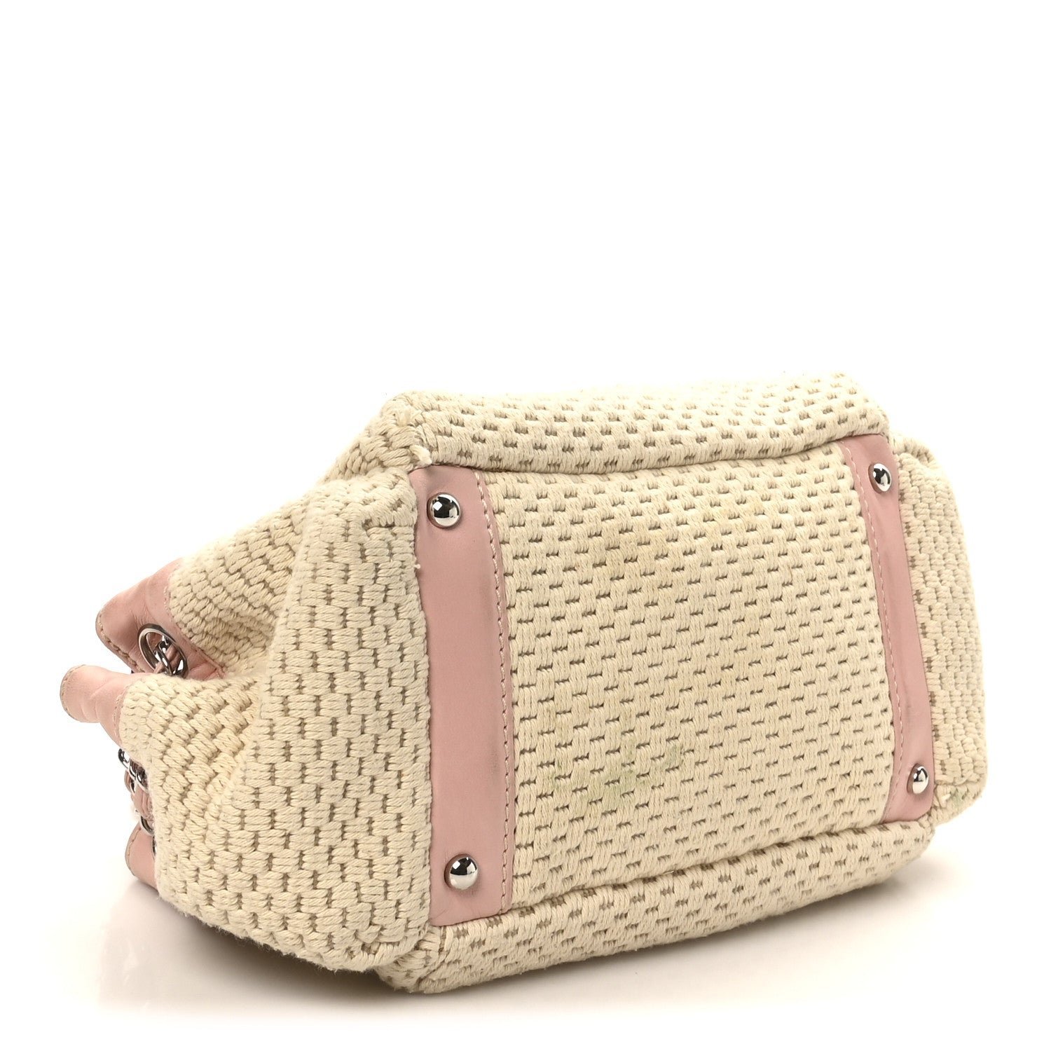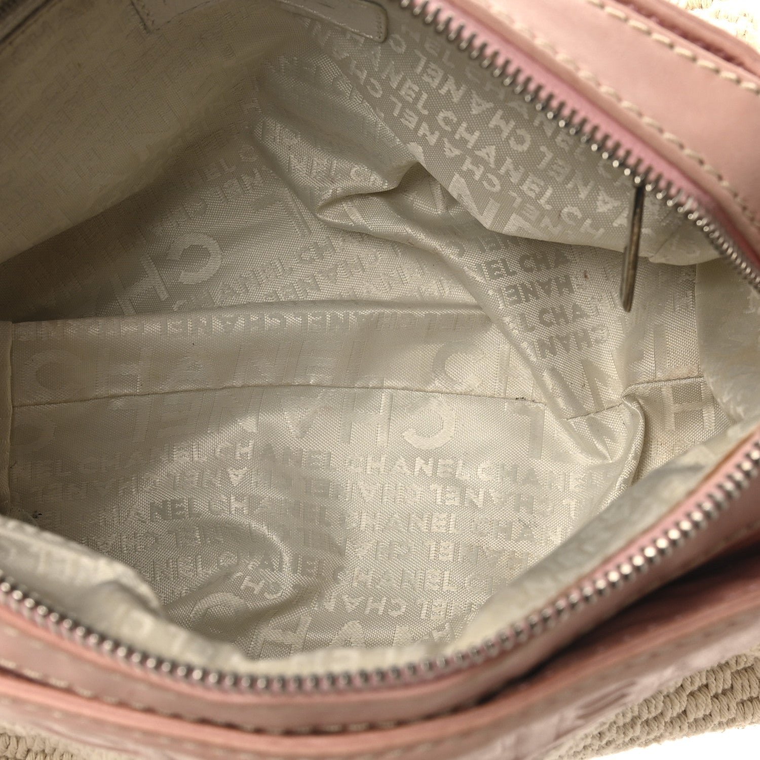 Designed for comfortable, everyday wear, the hobo features a single interwoven silver-tone chain and pink leather shoulder strap with a padded leather section at the top for added comfort. The bag typically features a top zipper closure to keep items secure and opens to a tonal fabric interior equipped with a zippered pocket and a mobile phone slot. Its mix of neutral canvas and soft pastel leather makes it a quintessential “resort” style piece from the early-to-mid 2000s era.