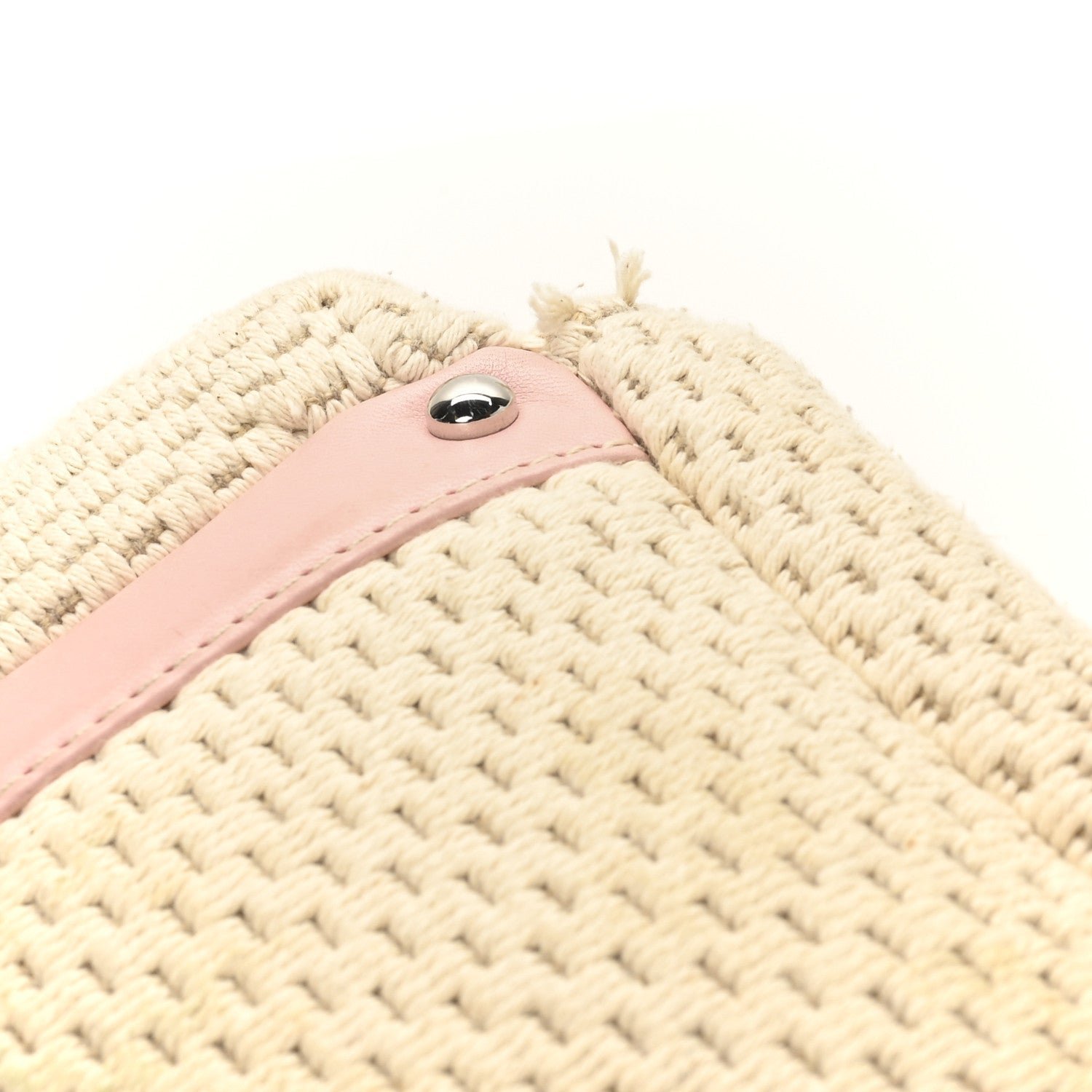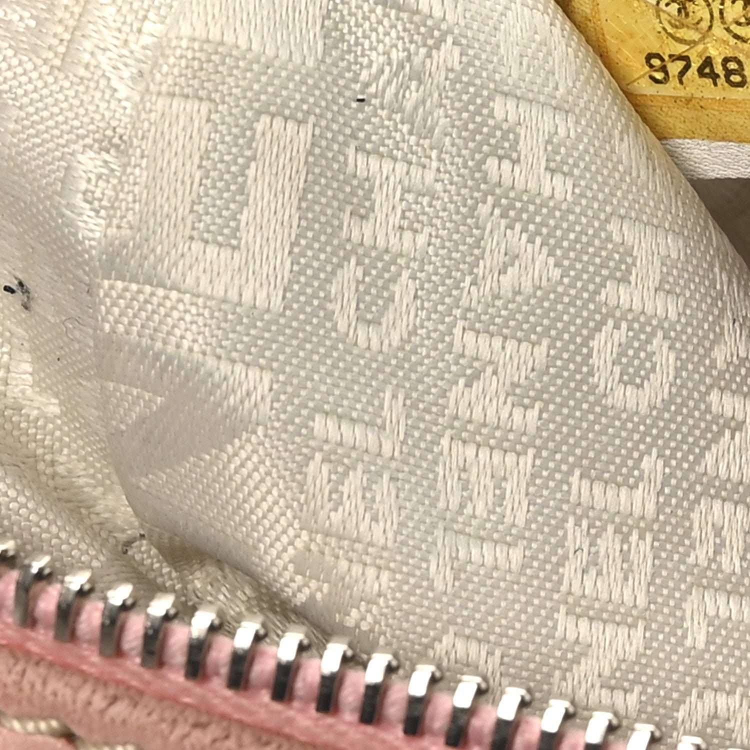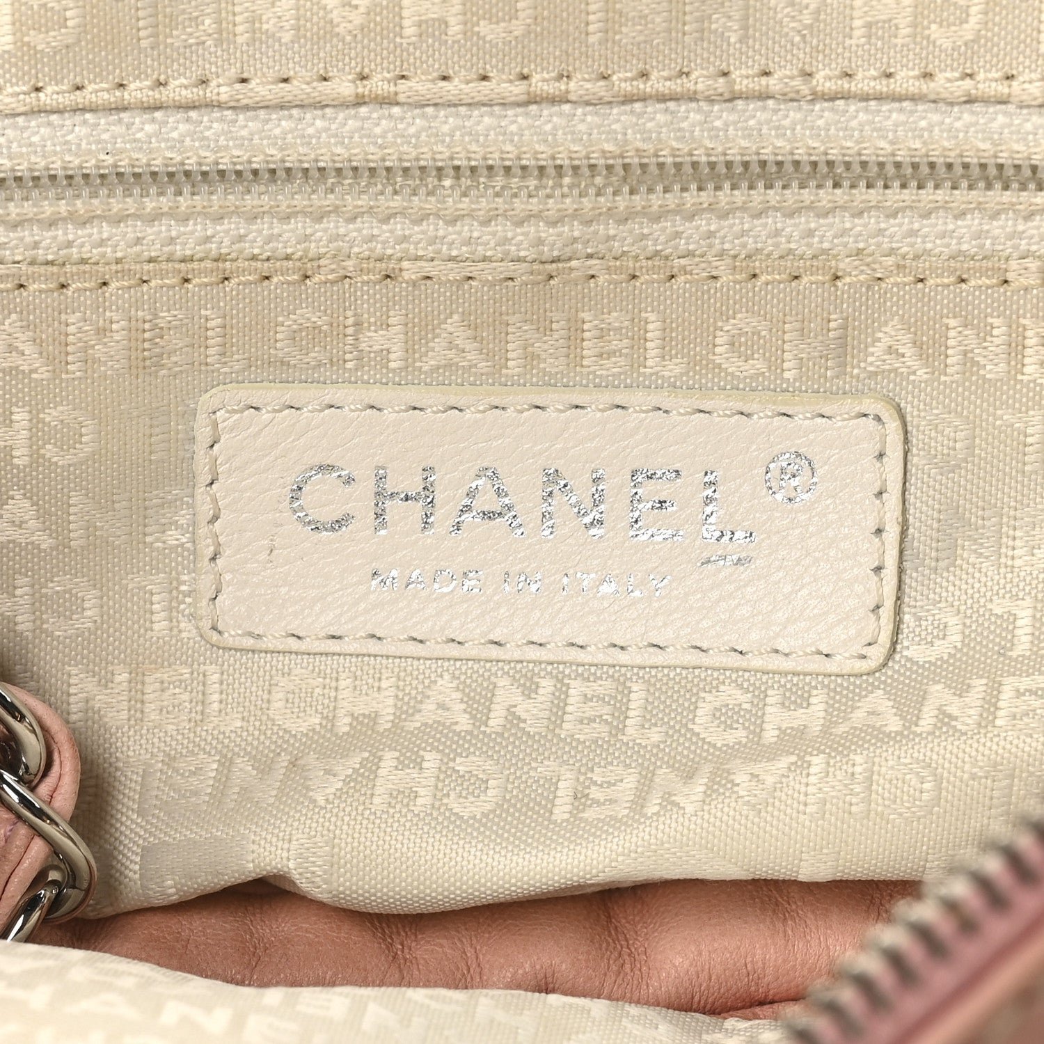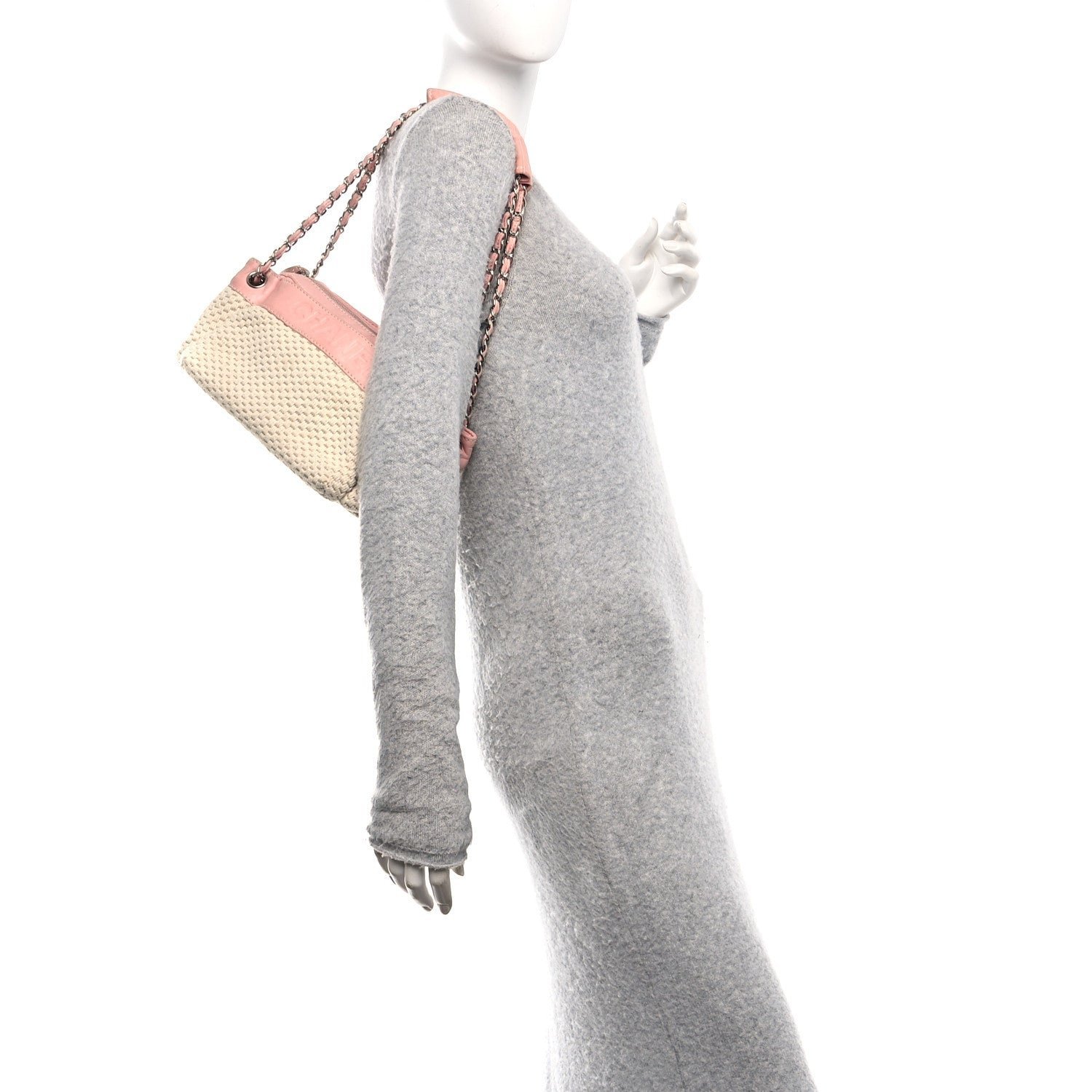 Designed for comfortable, everyday wear, the hobo features a single interwoven silver-tone chain and pink leather shoulder strap with a padded leather section at the top for added comfort. The bag typically features a top zipper closure to keep items secure and opens to a tonal fabric interior equipped with a zippered pocket and a mobile phone slot. Its mix of neutral canvas and soft pastel leather makes it a quintessential “resort” style piece from the early-to-mid 2000s era.