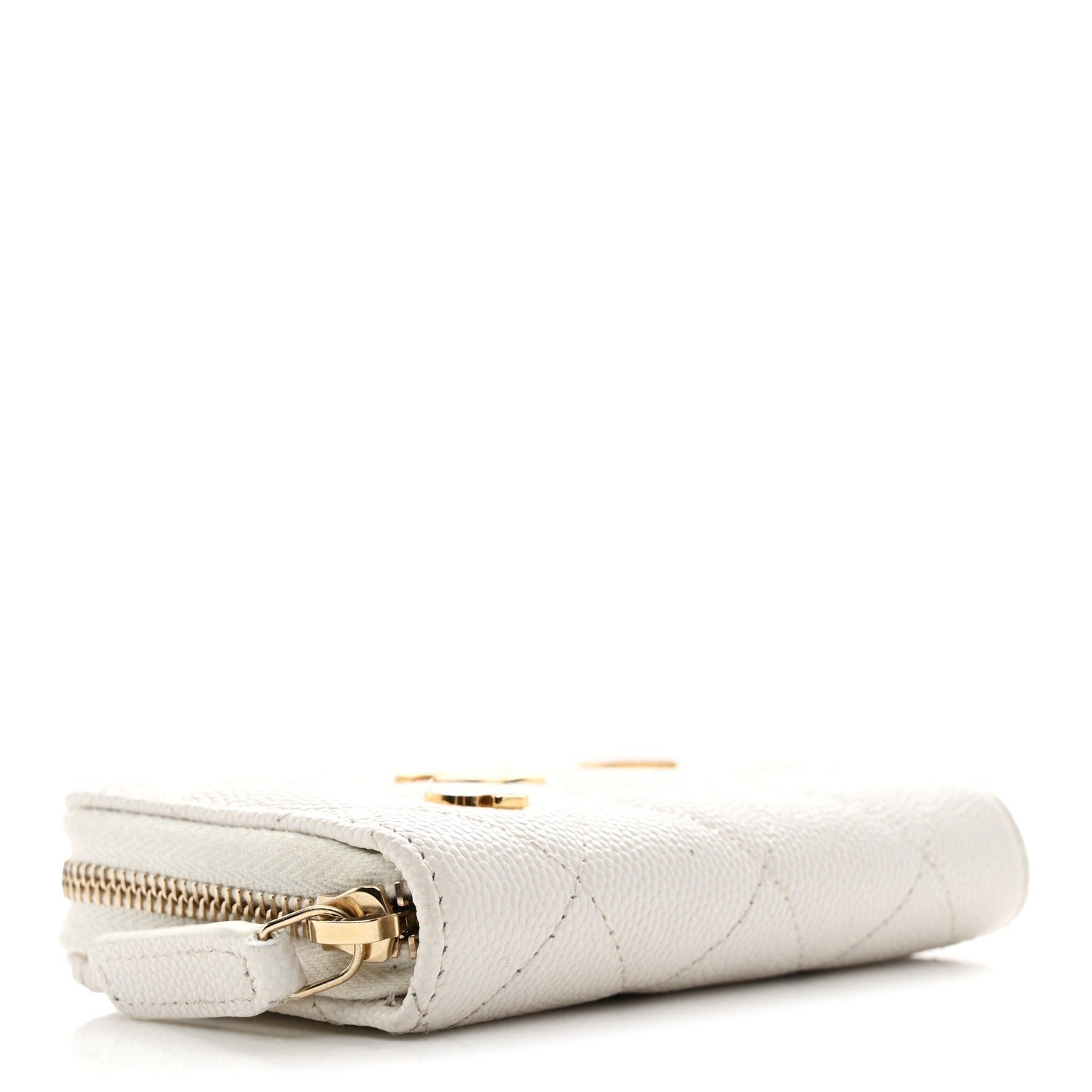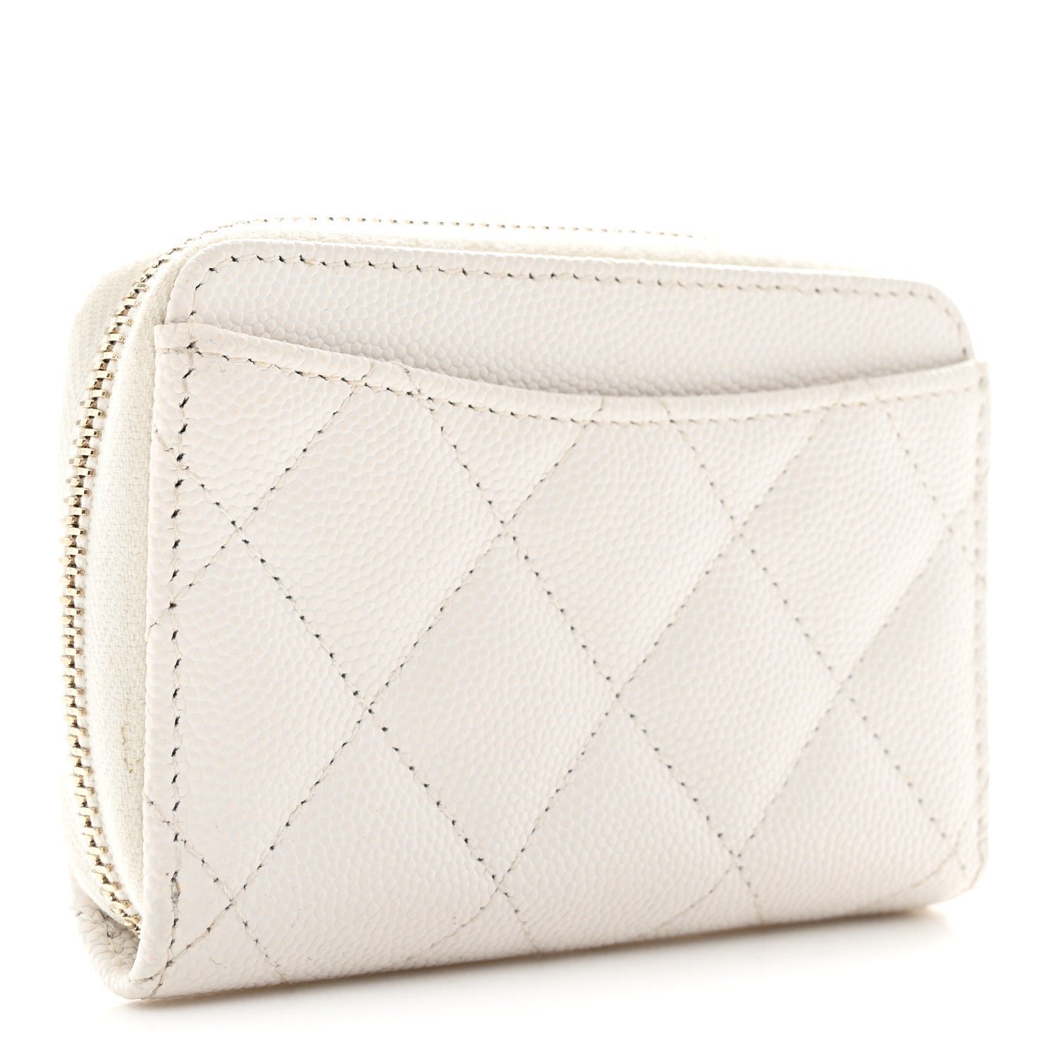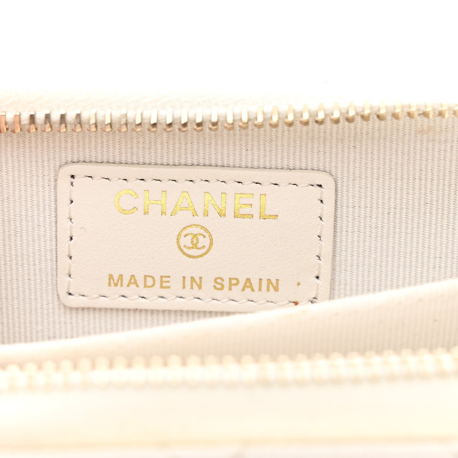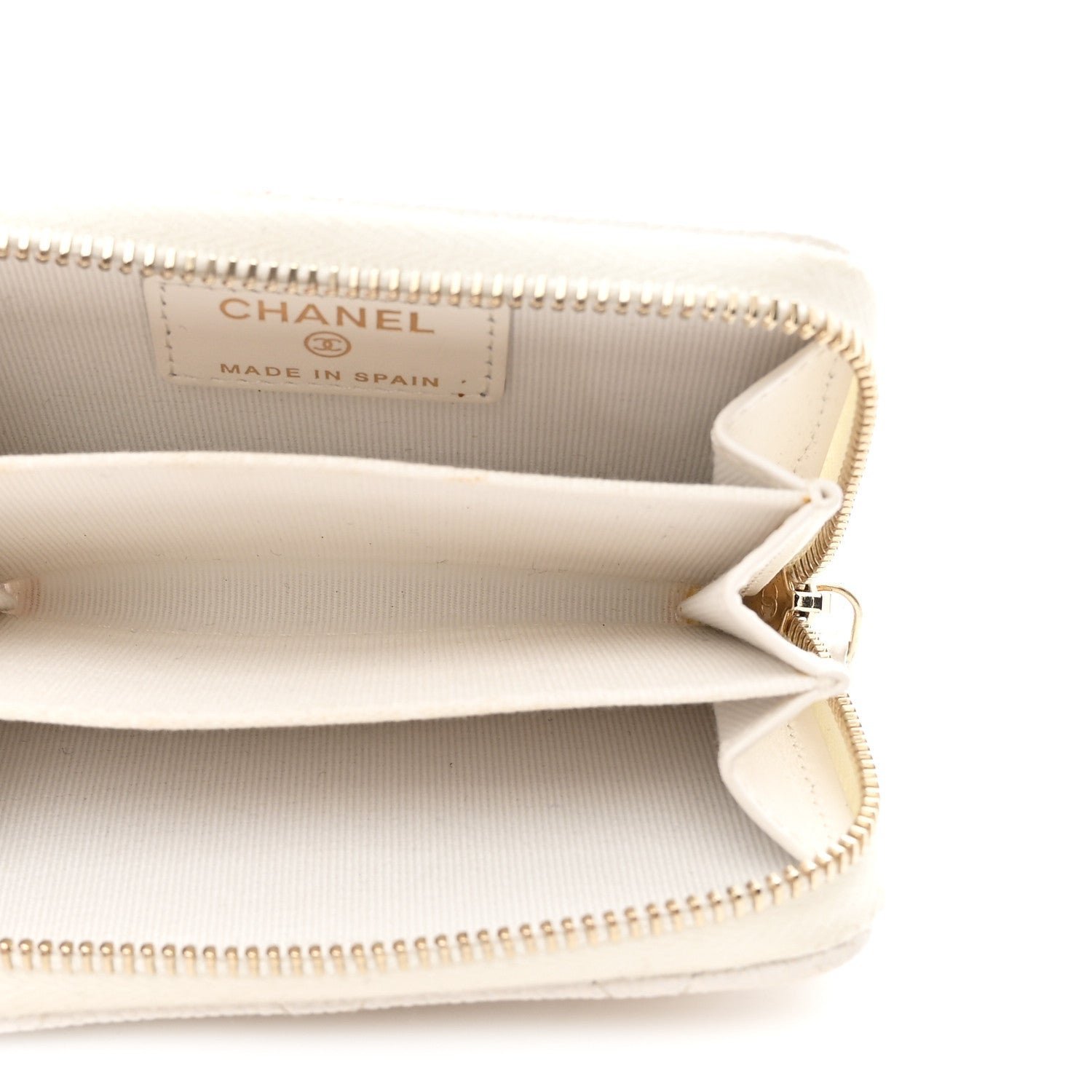Designed for compact organization, this coin purse features a secure wrap-around gold-tone zipper with a leather pull tab. The interior is lined in tonal white fabric and is divided into three separate gusseted compartments, providing ample space for coins, folded bills, and frequently used credit cards. Its small silhouette makes it an ideal “bag within a bag,” fitting easily into even the most petite Chanel flap bags while adding a pop of personality to your small leather goods collection.