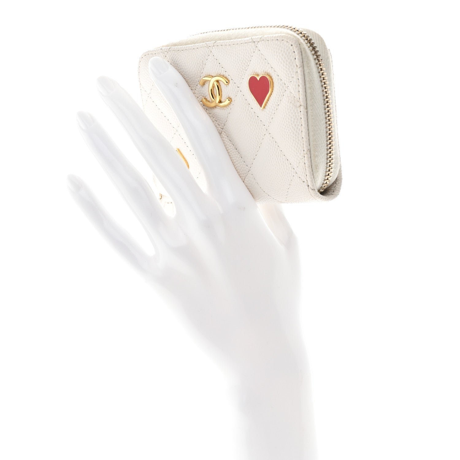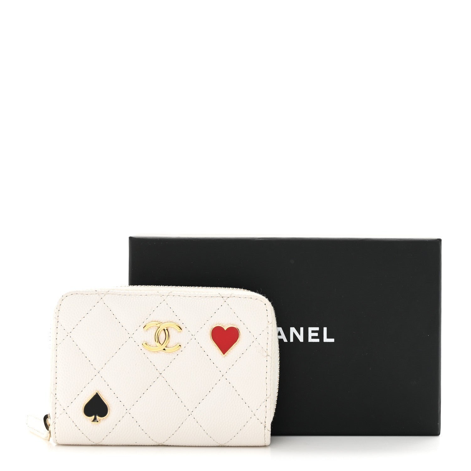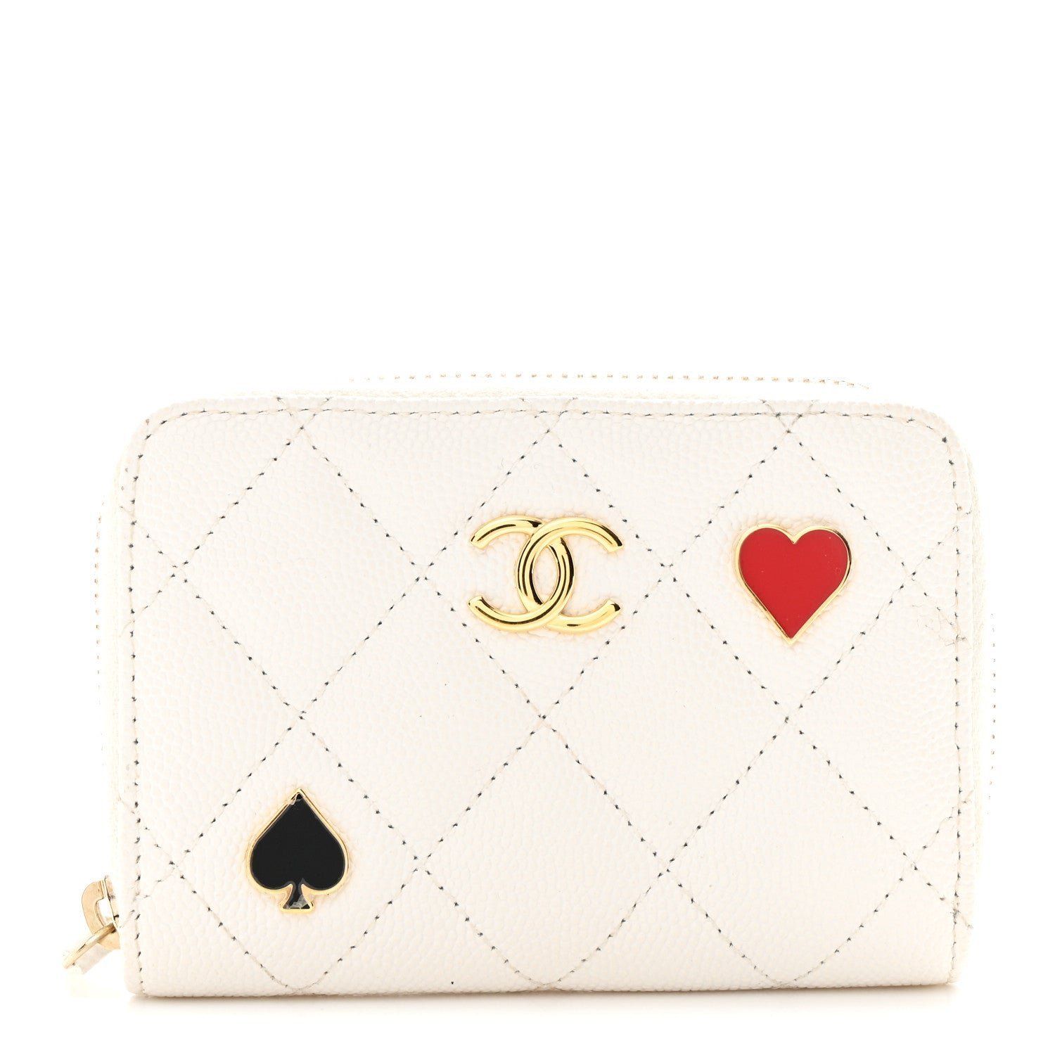 This specific model is crafted from white caviar leather, a robust material prized for its pebbled texture and superior resistance to everyday wear. Part of the Cruise 2017 collection inspired by the glamour of Monte Carlo and Havana, this piece moves away from the House’s minimalist roots to embrace a whimsical, thematic aesthetic. The defining design element is the set of colorful enamel charms including a red heart and a black spade alongside the iconic gold-tone CC logo, all set against classic diamond quilting.