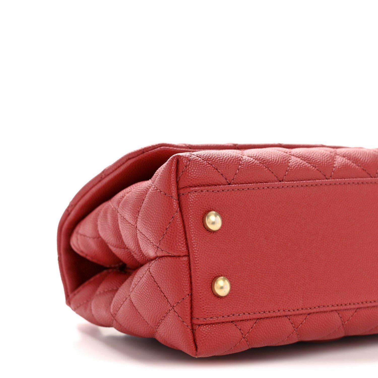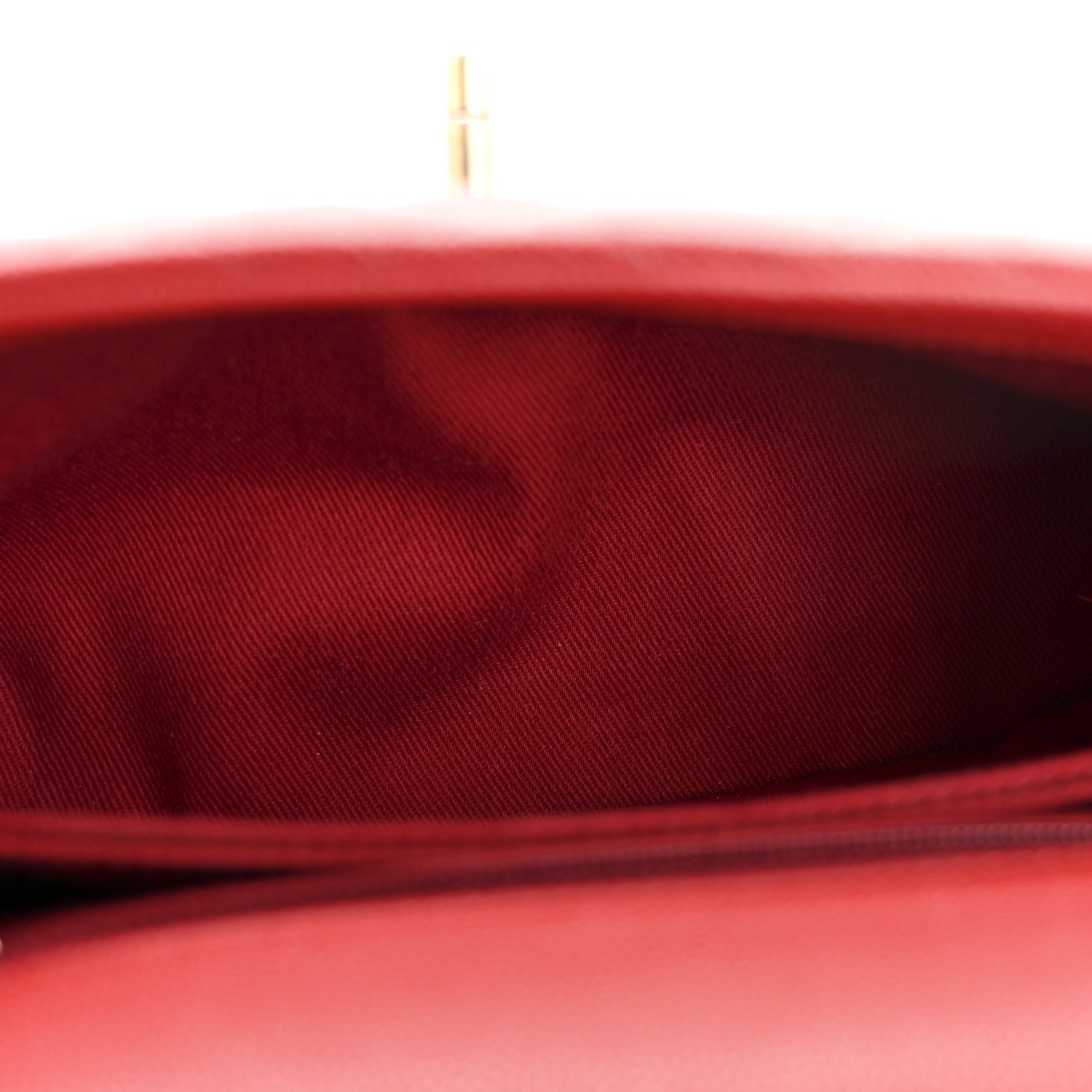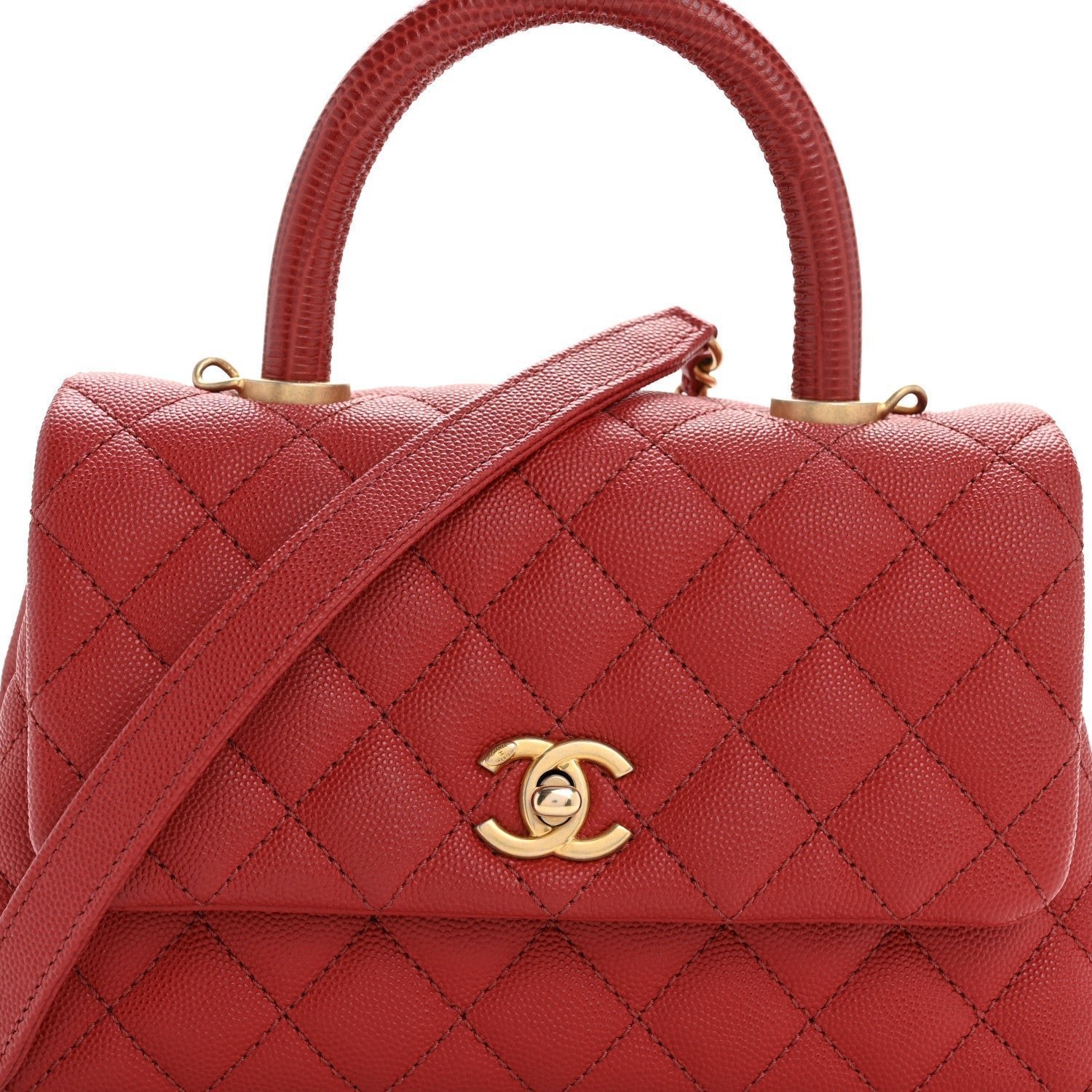This specific model is crafted from red caviar leather, a highly durable and pebbled calfskin prized for its resistance to scratches and its ability to hold a structured shape over time. A standout feature of this edition is the lizard-embossed leather top handle, which provides a luxurious, exotic texture and a subtle tonal or slight contrast to the main body of the bag. The design is finished with the iconic gold-tone interlocking CC turn-lock and matching hardware.