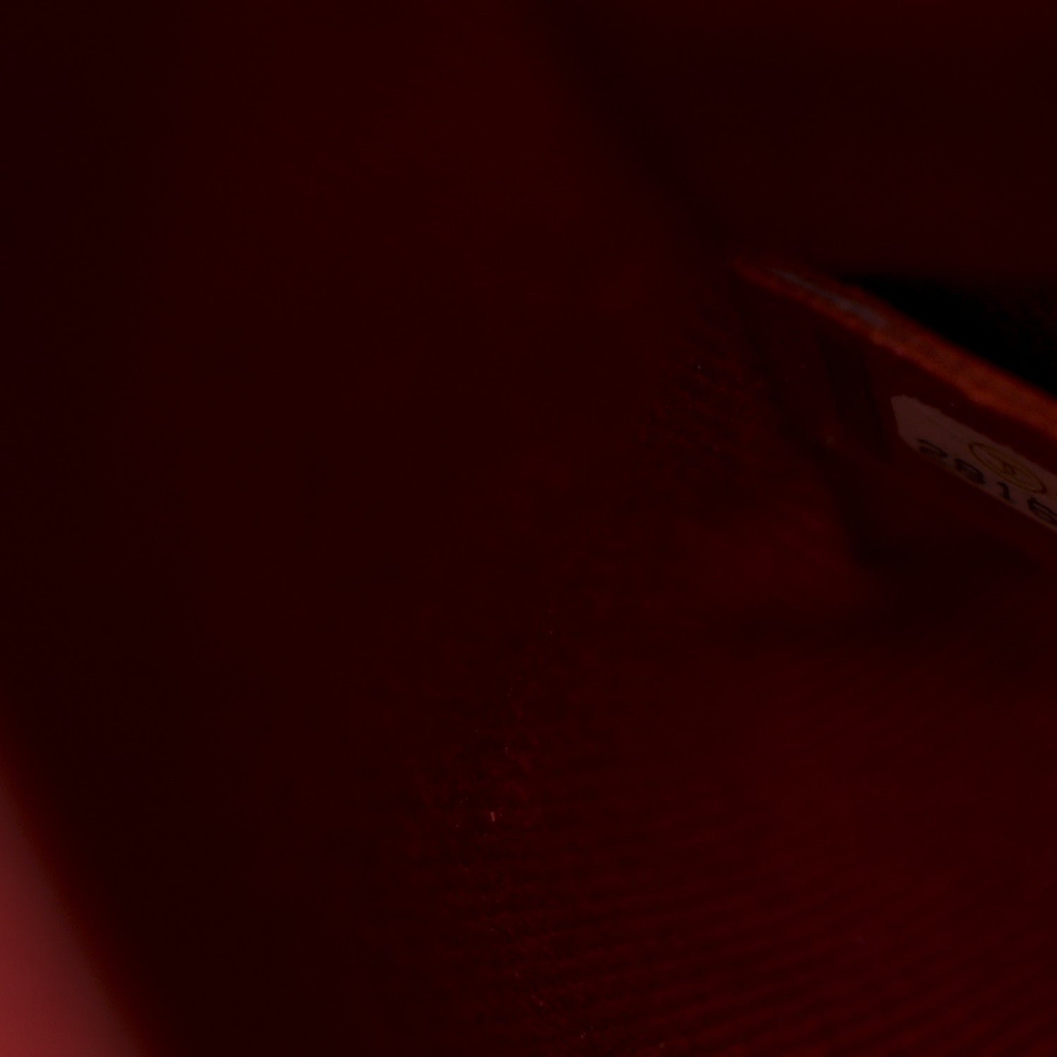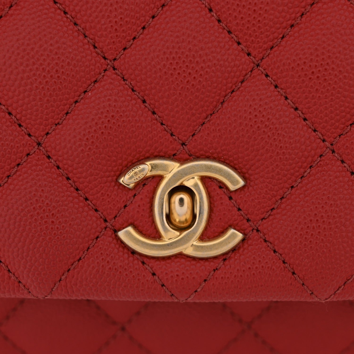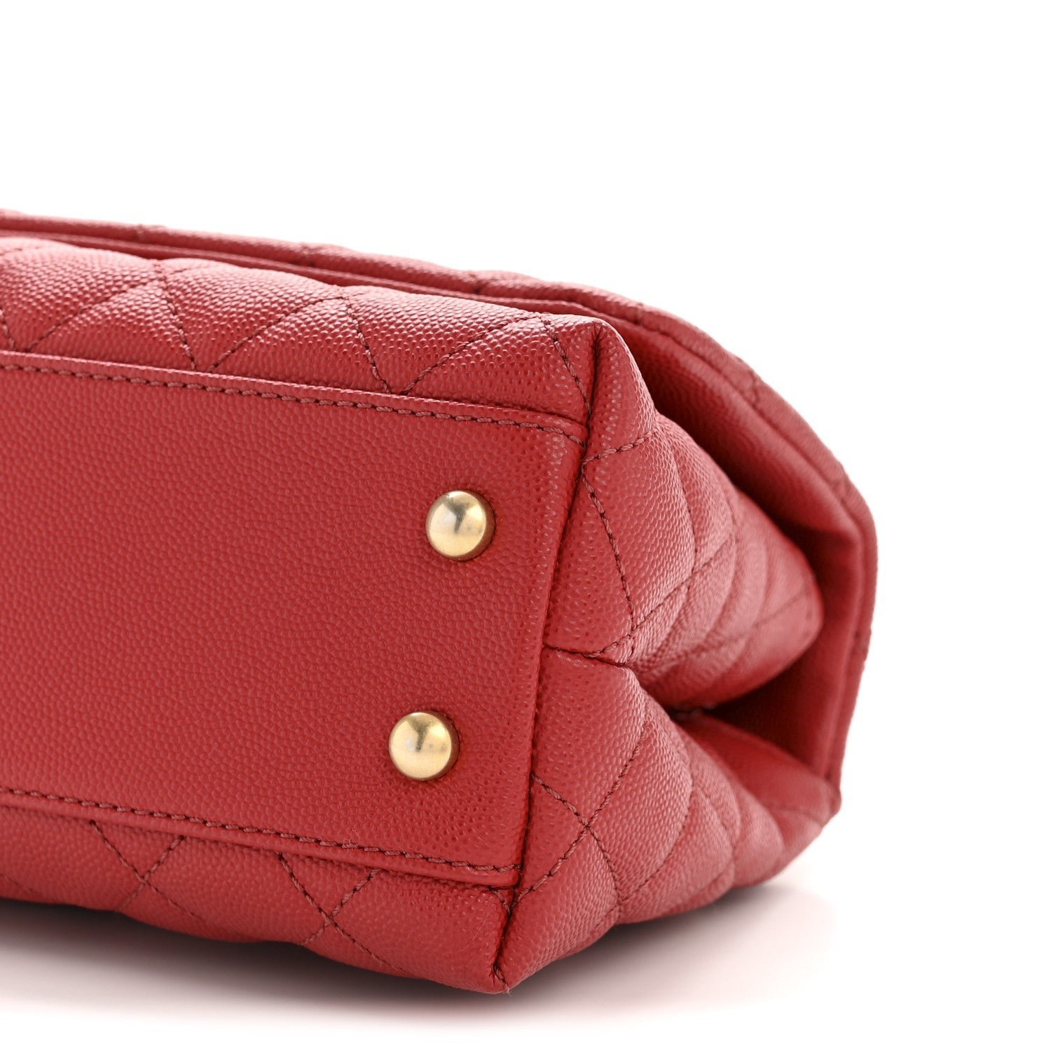 This specific model is crafted from red caviar leather, a highly durable and pebbled calfskin prized for its resistance to scratches and its ability to hold a structured shape over time. A standout feature of this edition is the lizard-embossed leather top handle, which provides a luxurious, exotic texture and a subtle tonal or slight contrast to the main body of the bag. The design is finished with the iconic gold-tone interlocking CC turn-lock and matching hardware.