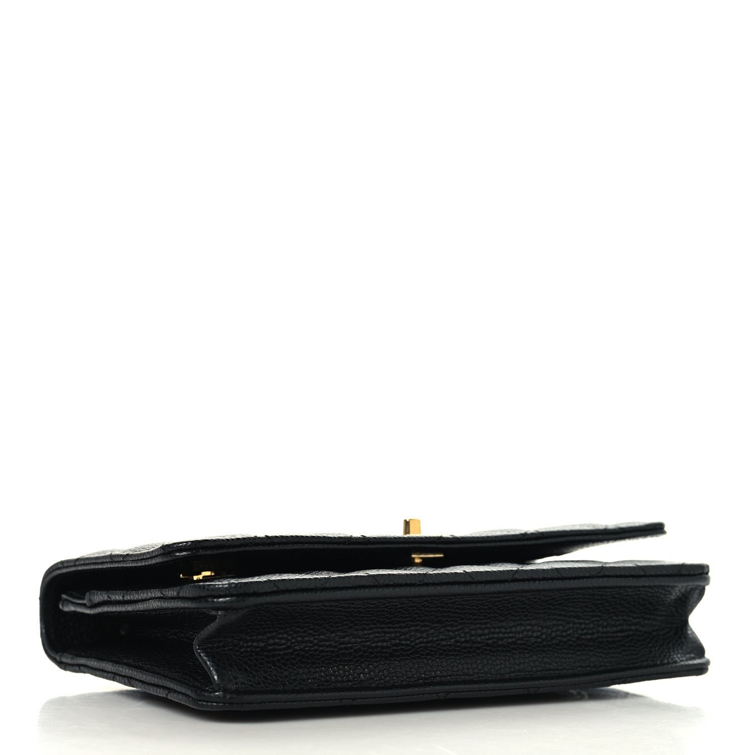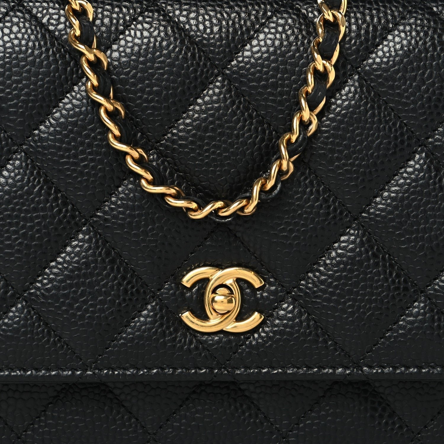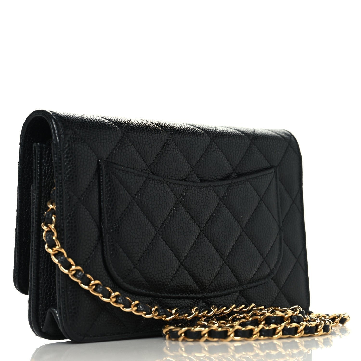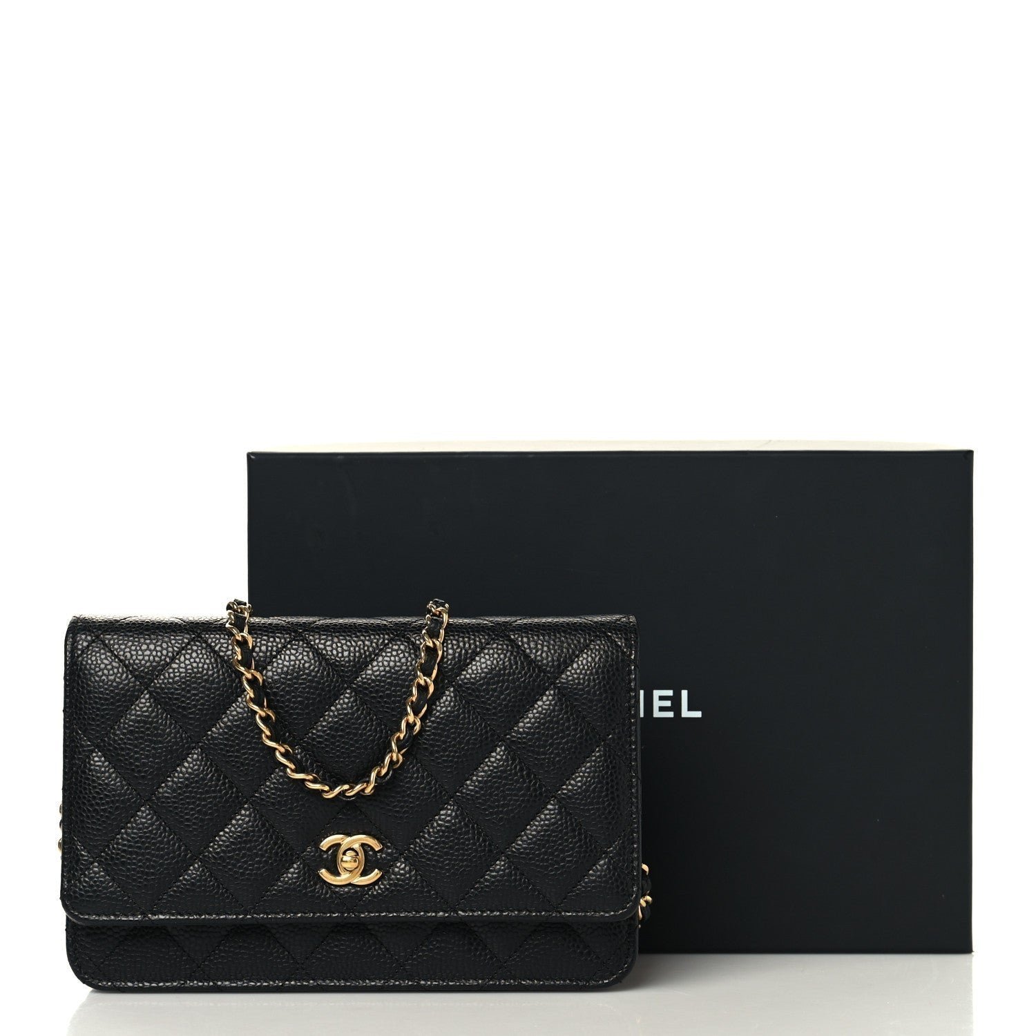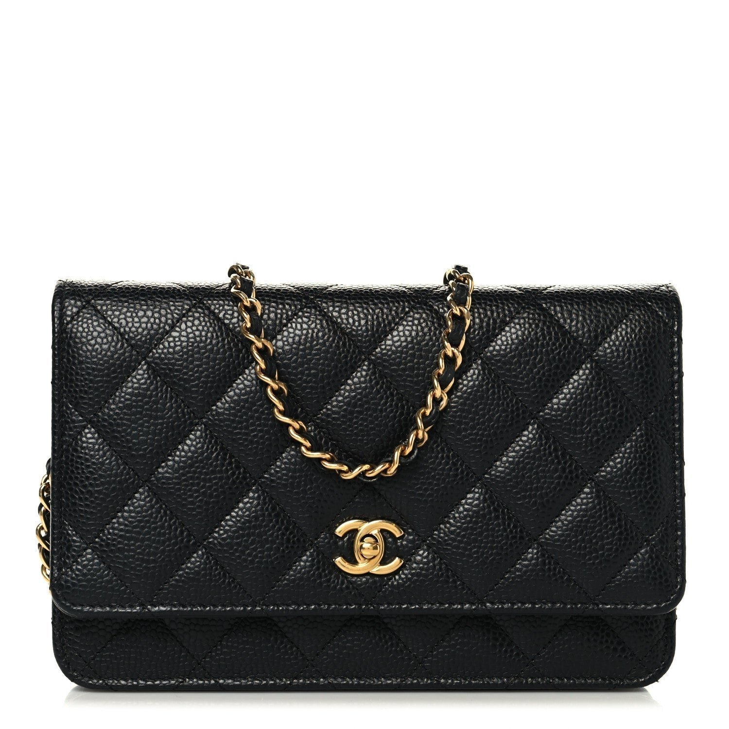 Defining Feature: Unlike the standard WOC which typically uses a snap button, this model is defined by a functional CC turn-lock closure on the front flap. This feature effectively converts the wallet into a “mini bag,” mirroring the look of the larger Classic Flap.