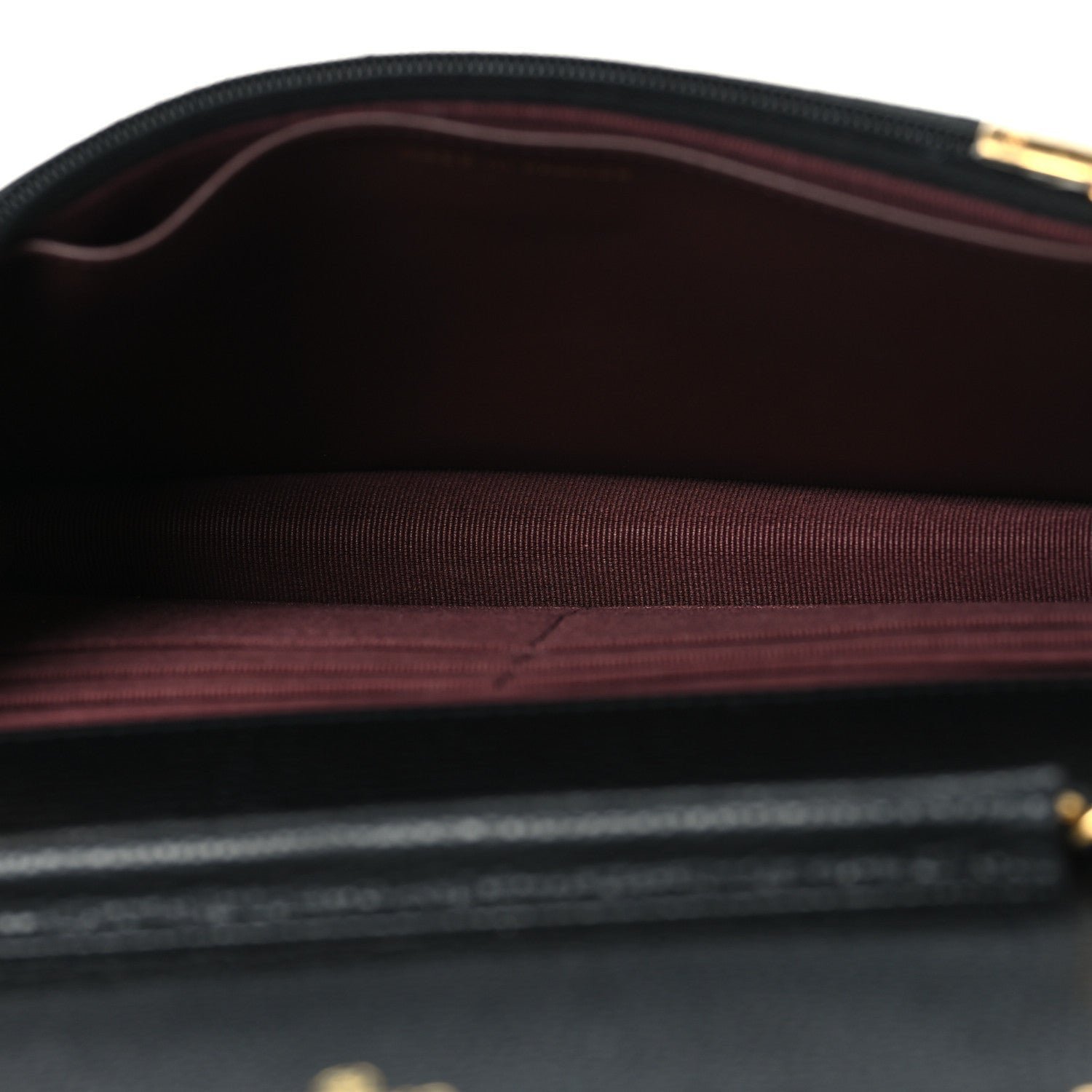 Interior Layout: The bag opens to a well-organized interior, typically lined in burgundy fabric or leather. The functional compartments include: