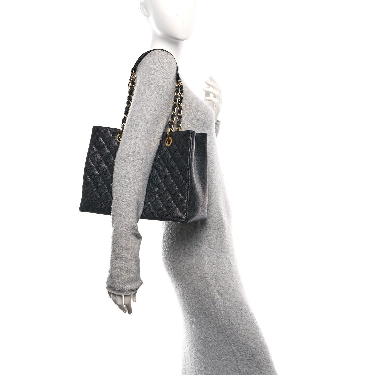 Design and Craftsmanship: This timeless shoulder tote is meticulously crafted from black caviar leather, a signature pebbled calfskin highly regarded for its exceptional durability and resistance to scratches. It features the brand’s iconic diamond-quilted stitching across the exterior, maintaining a sophisticated and classic aesthetic.
