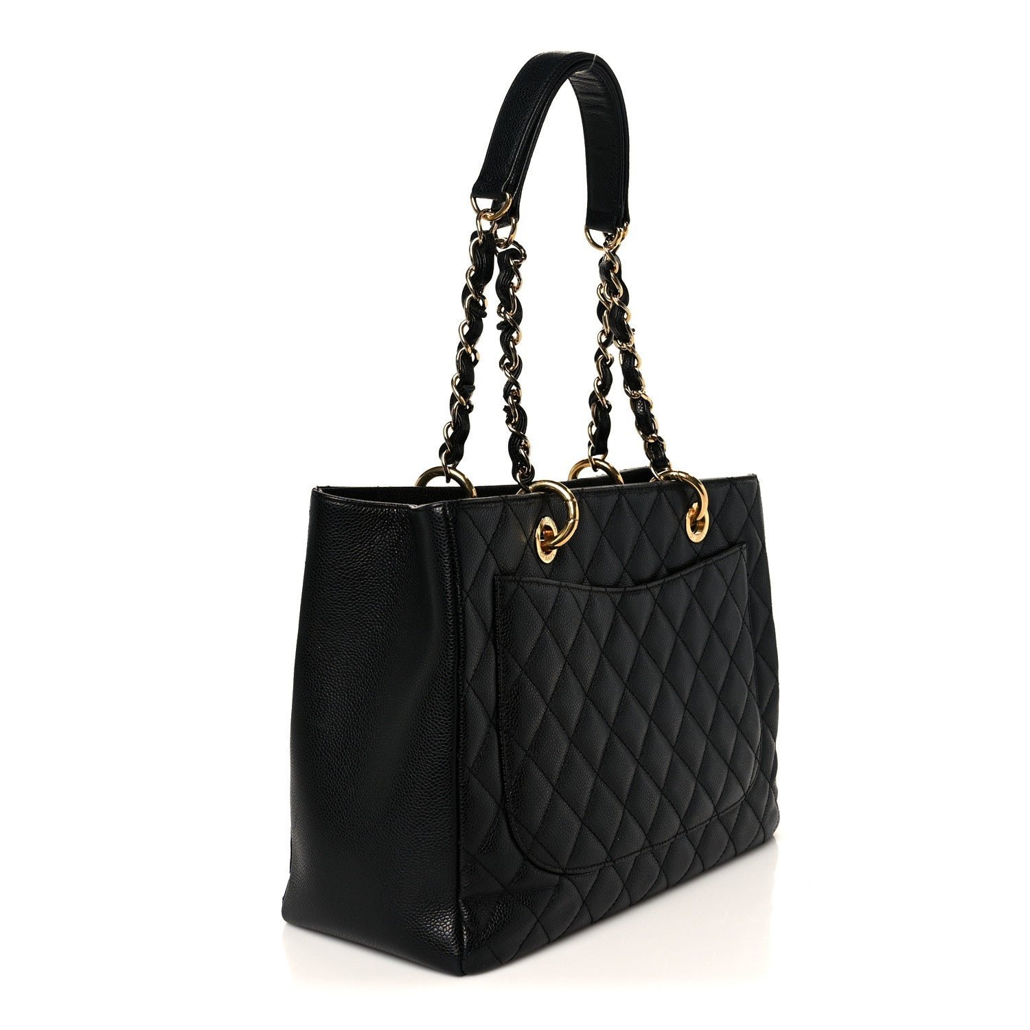 Distinctive Features: The “Grand Shopping Tote” is defined by a large quilted interlocking CC logo prominently featured on the front. It includes a convenient exterior rear flat pocket for quick-access items like a phone or transit card.