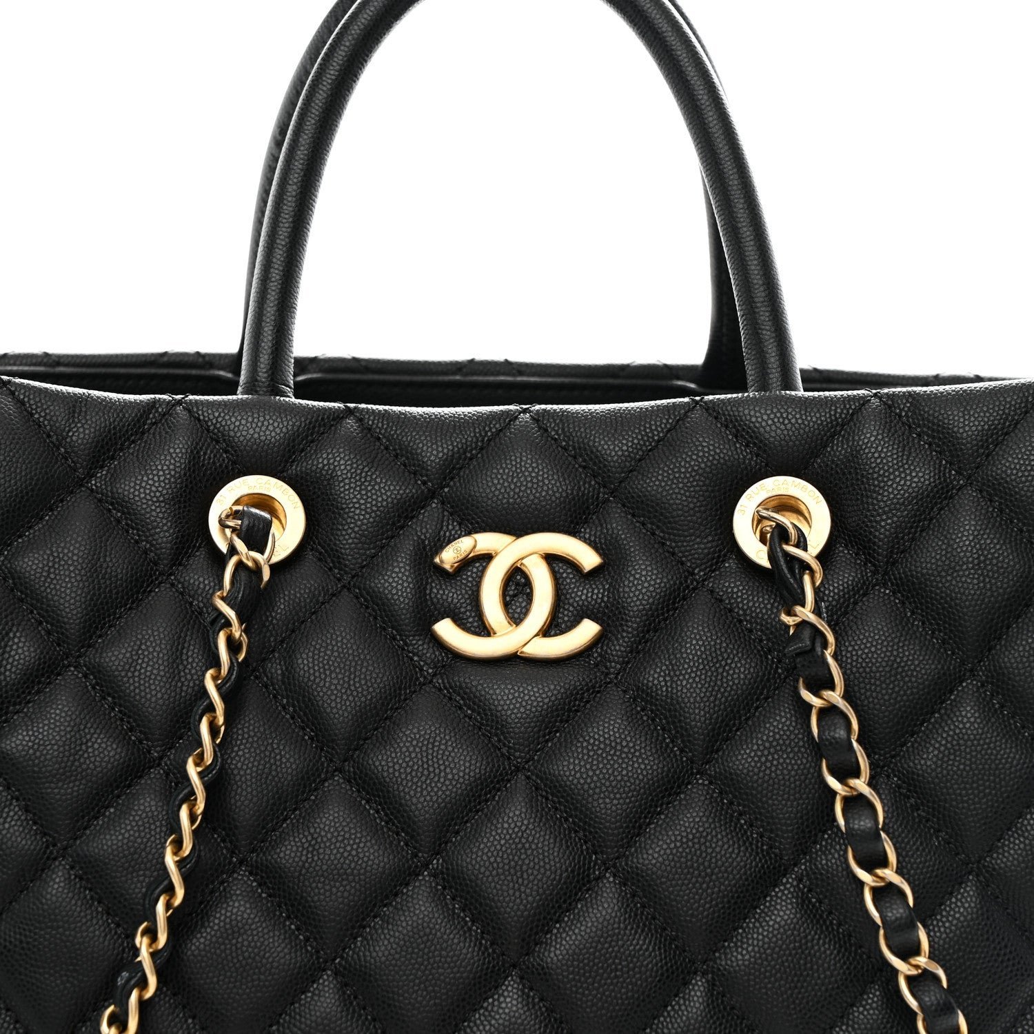 Material: The exterior is crafted from durable black caviar leather (grained calfskin) with signature diamond quilting.