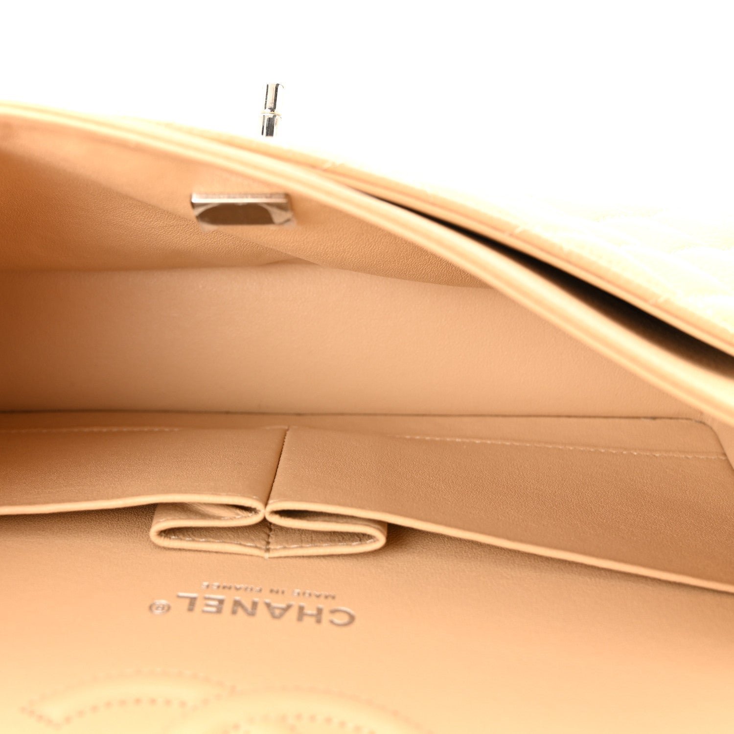 Color & Material: Crafted from signature beige clair caviar leather (grained calfskin). Beige Clair is one of Chanel’s most famous neutral shades, often described as a soft, creamy beige with subtle blush or pink undertones.