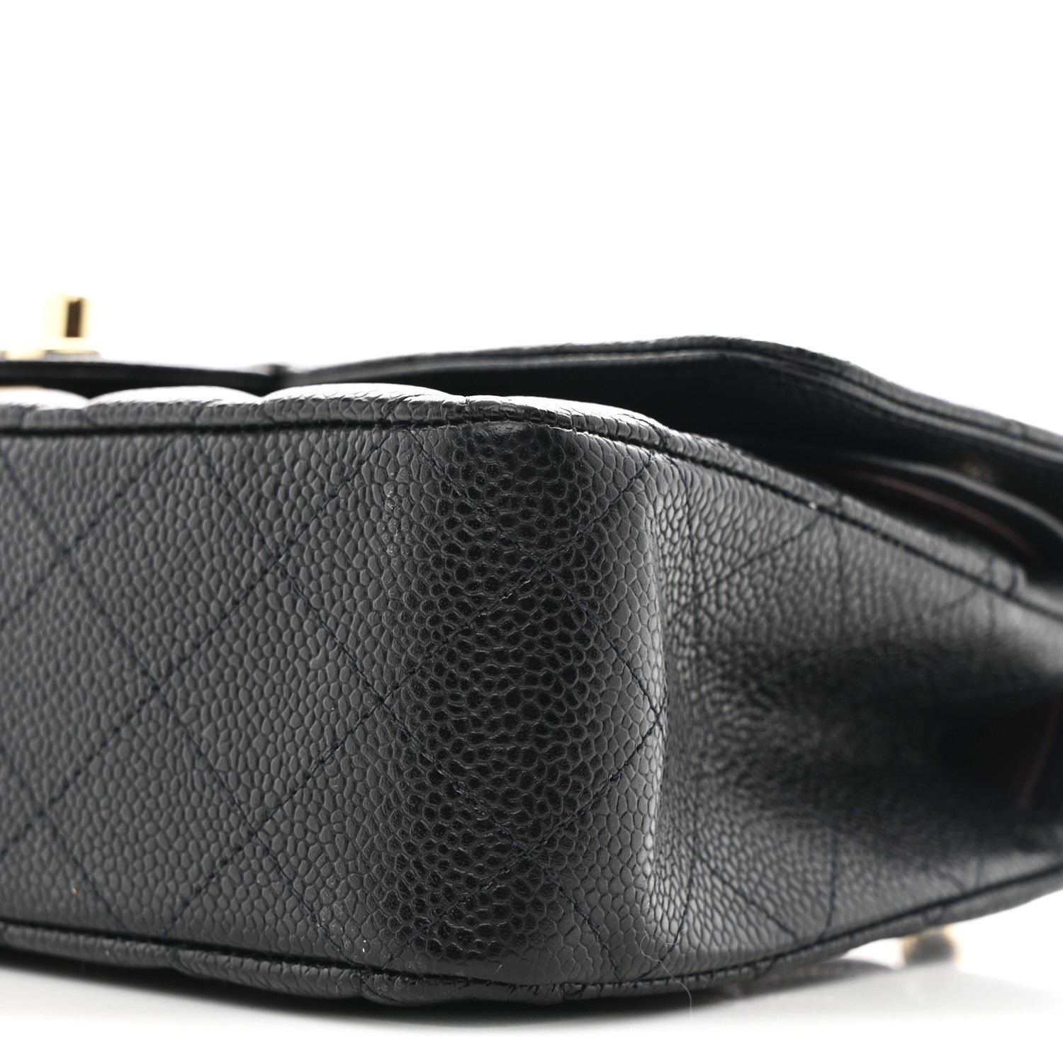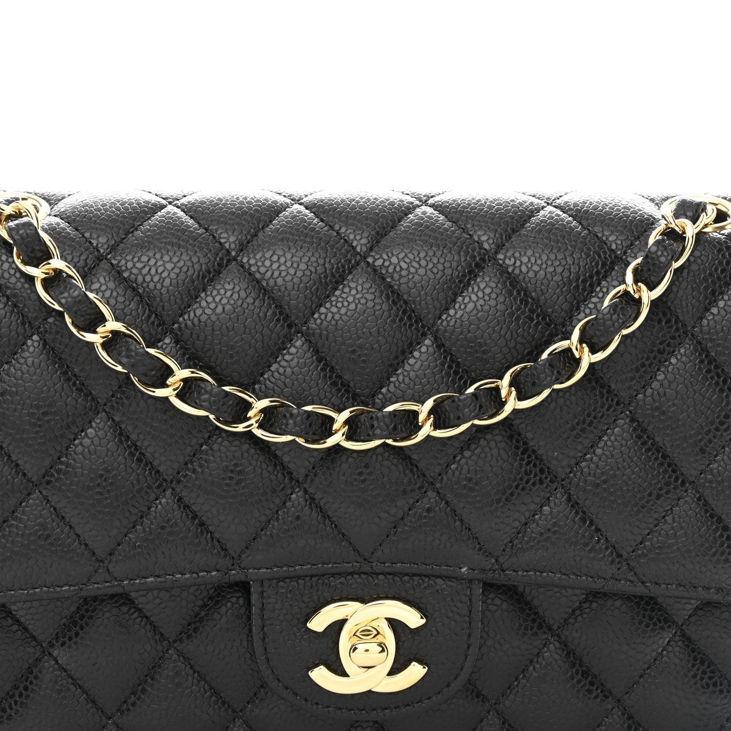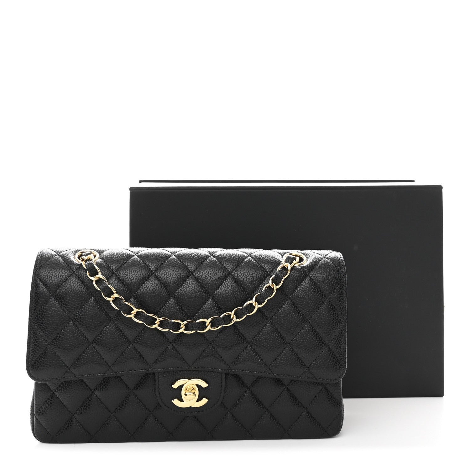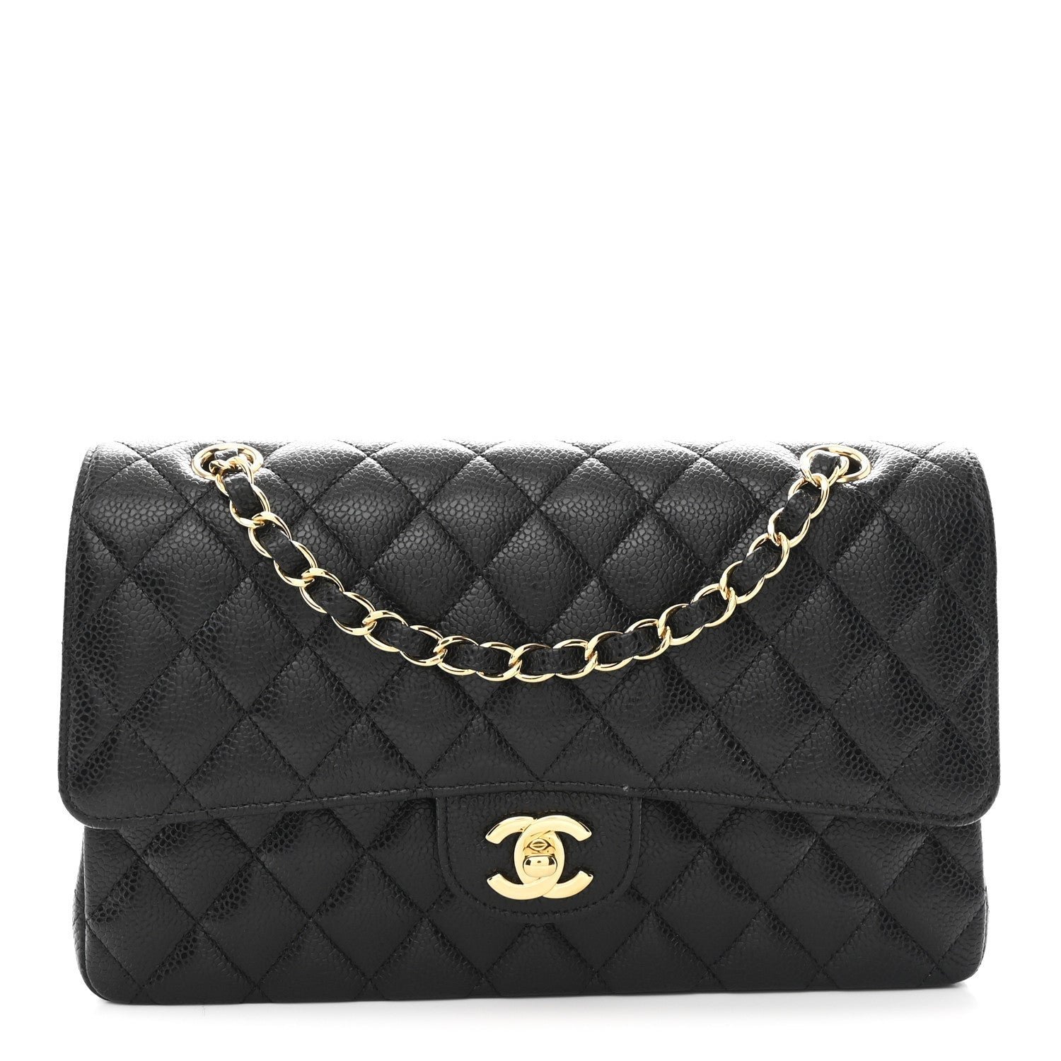 Hardware and Closure: The front flap is secured by the iconic polished gold-tone metal interlocking CC turn-lock closure.