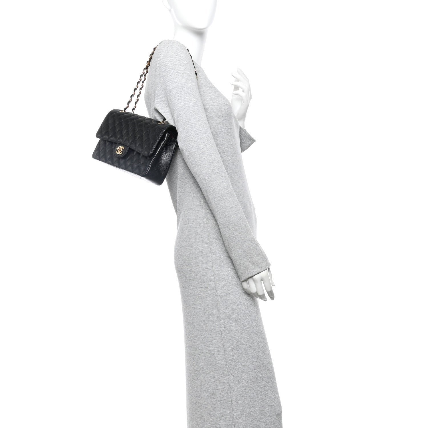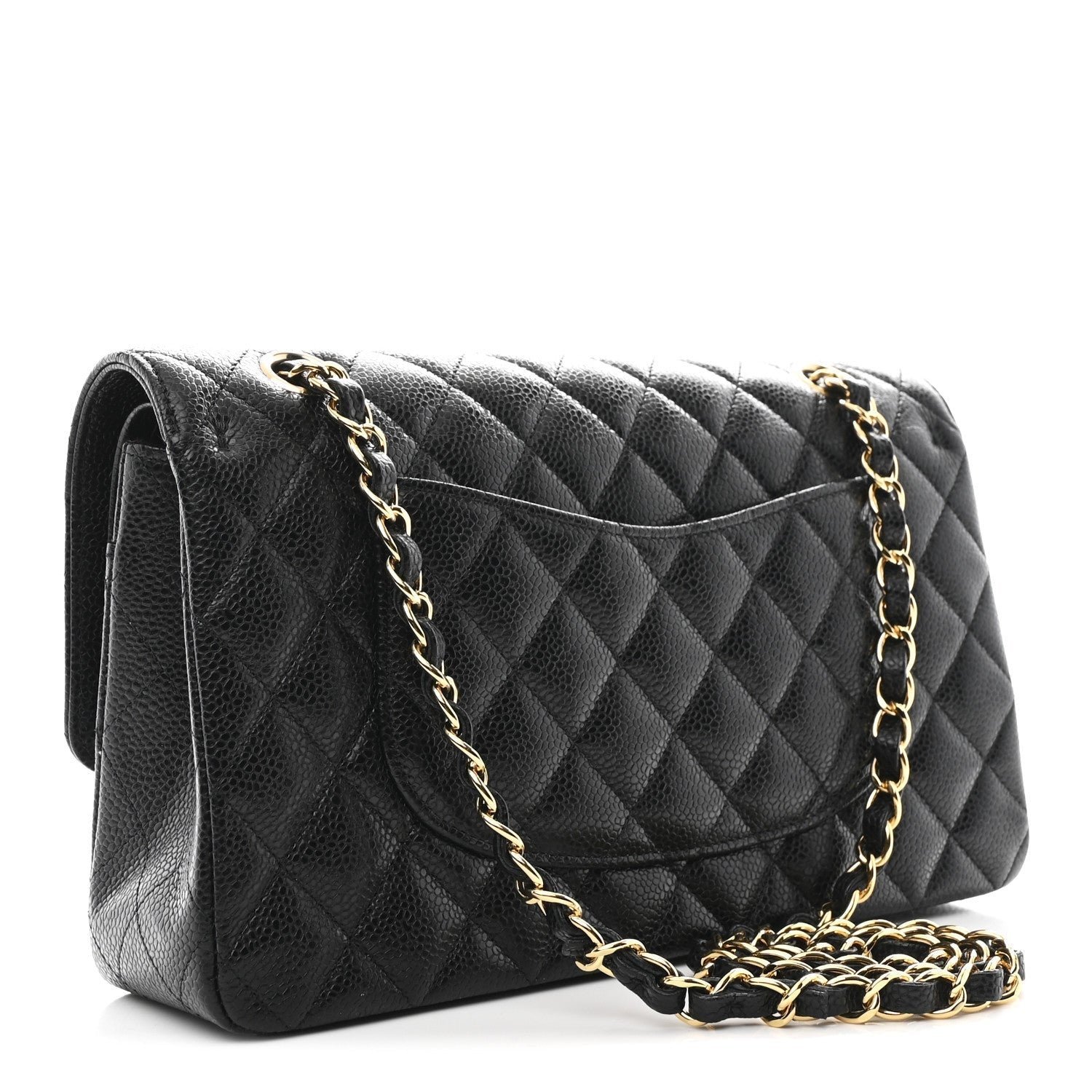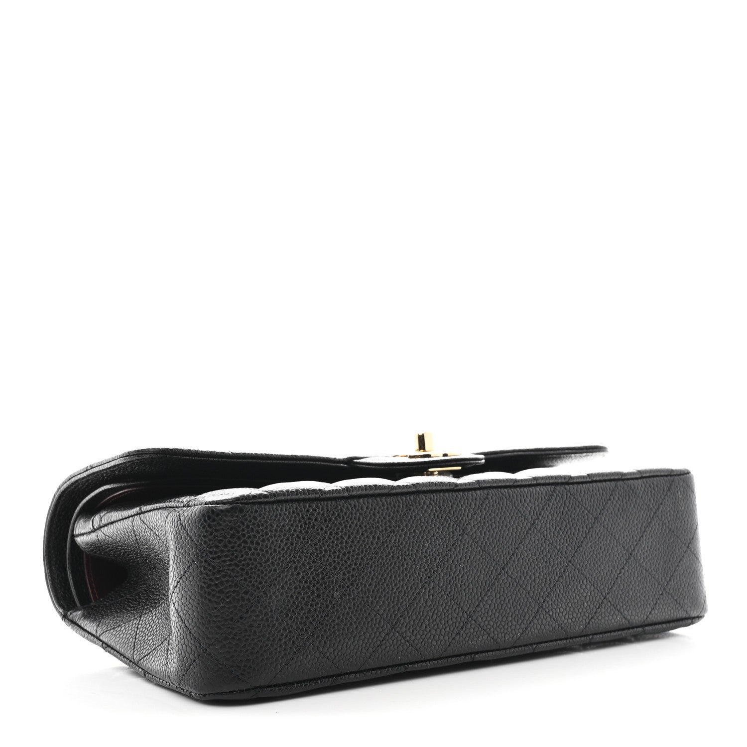 Material and Texture: The exterior is meticulously crafted from signature black caviar leather (grained calfskin), known for its pebbled texture and scratch-resistant finish. It features the legendary diamond-quilted stitching that characterizes the brand’s classic line.