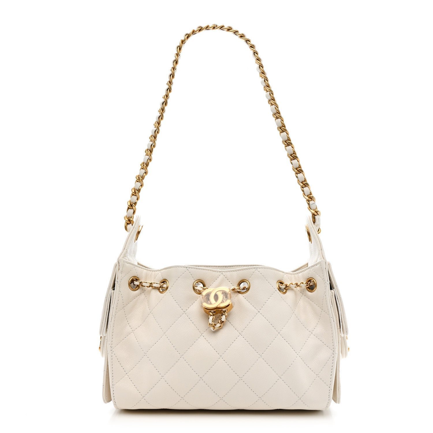 Material: It is crafted from white quilted caviar leather (grained calfskin), a durable and scratch-resistant material prized for its pebbled texture.