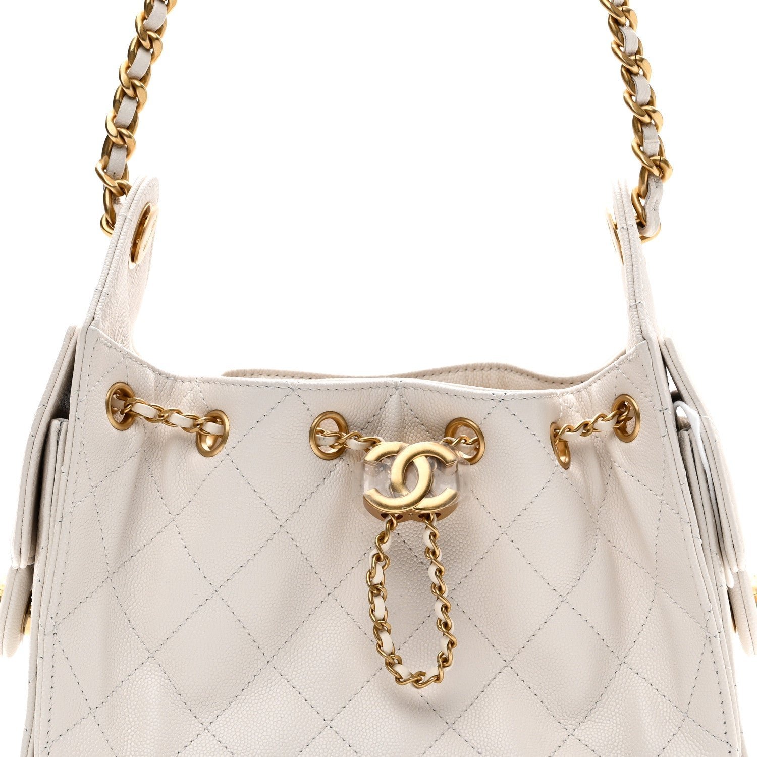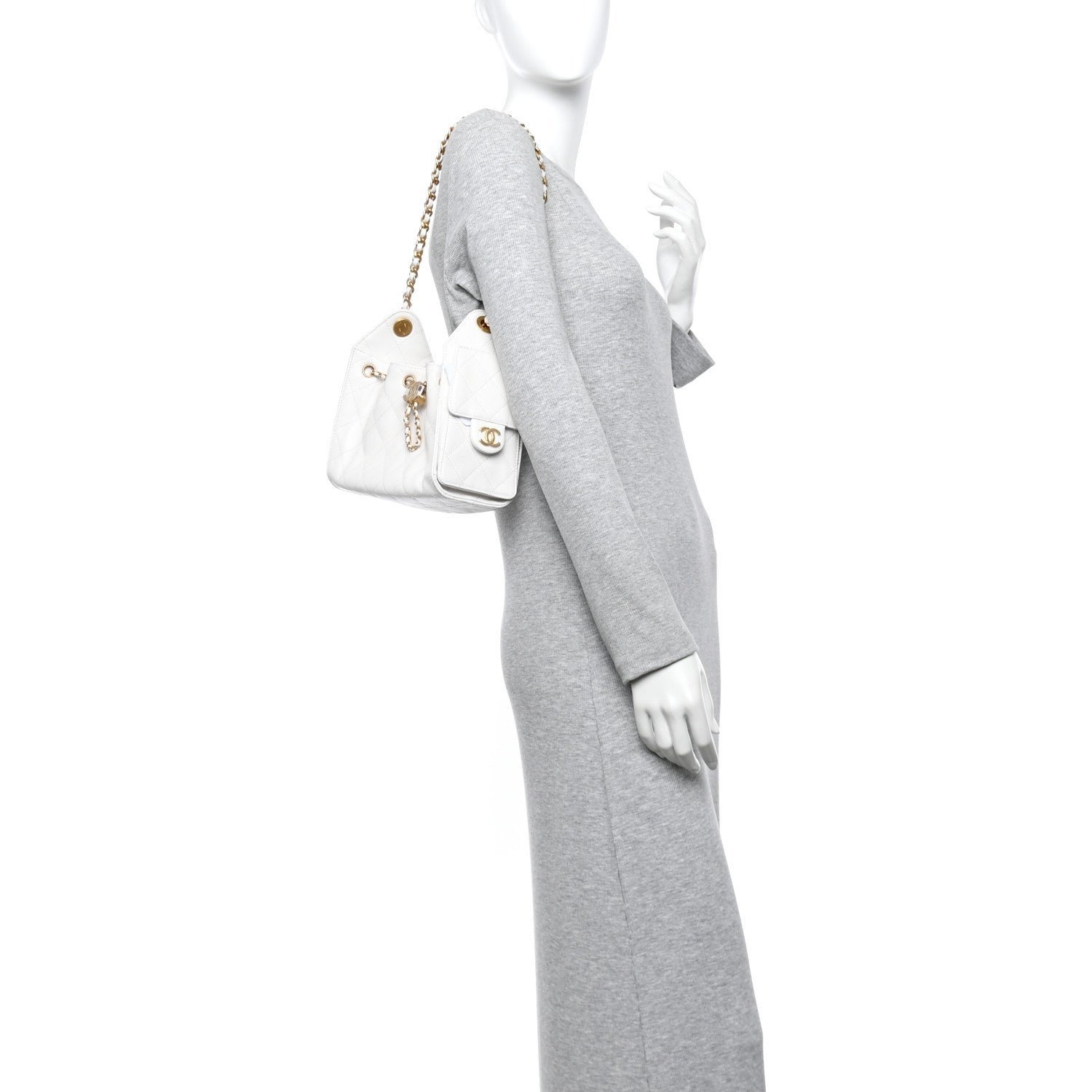 Shoulder Carry: It is equipped with a single, chunky interwoven gold-tone chain and white leather strap designed for shoulder carry. Note that the chain is generally not long enough for crossbody wear.