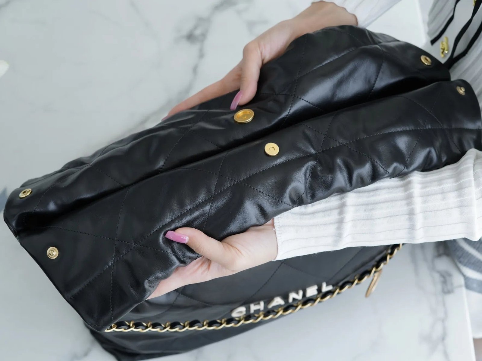 Described as a “genuine ally for daily life,” the CHANEL 22 bag combines a hobo-inspired silhouette with high-fashion codes. It features a practical magnetic button and drawstring closure that creates its characteristic “chic trash bag” aesthetic a playful nod to elevated functionality. The bag is equipped with a long interwoven chain strap that allows for comfortable shoulder wear, and the large version provides a particularly spacious interior, making it ideal for those who need to carry more, including a laptop or daily essentials.