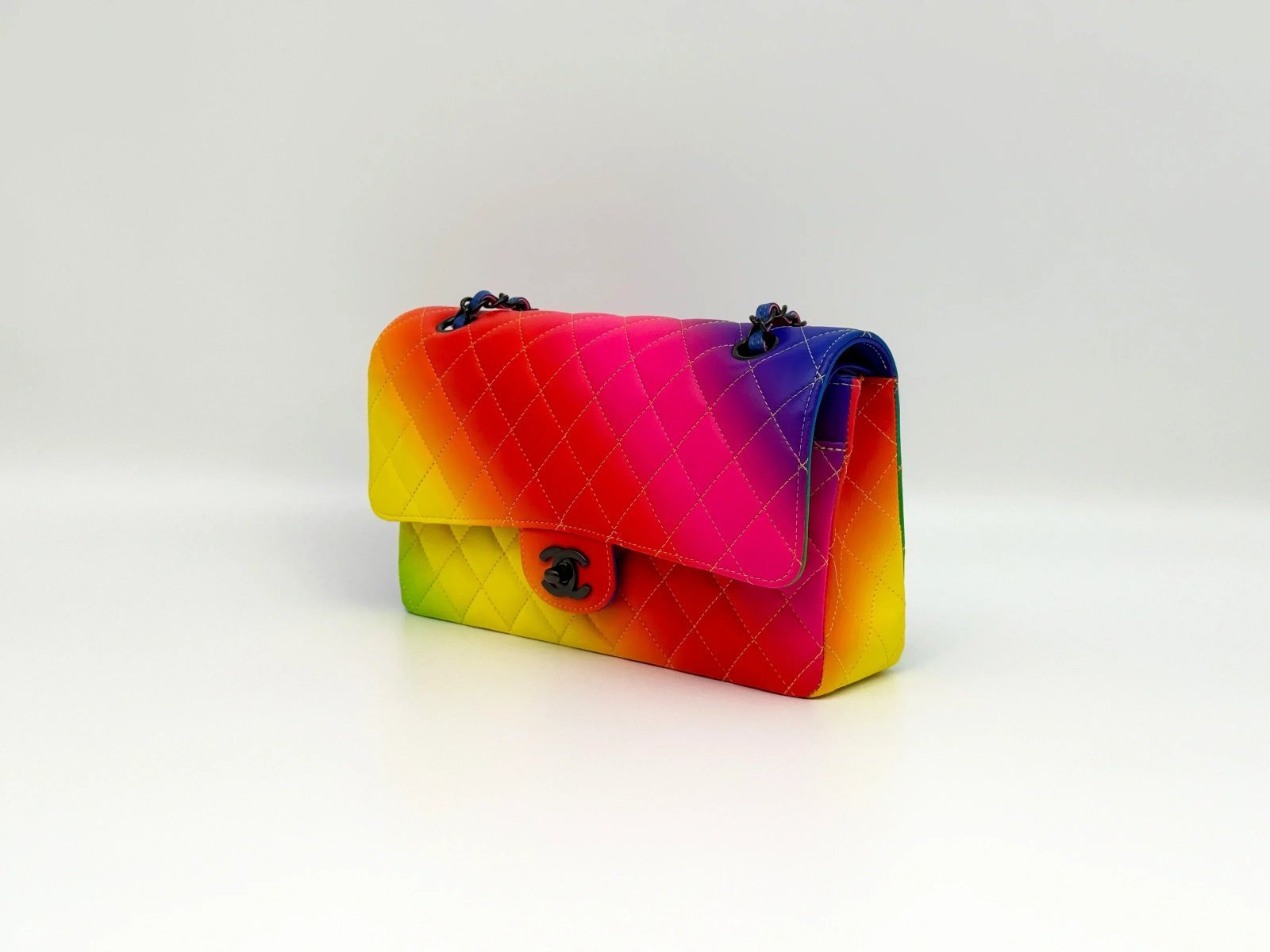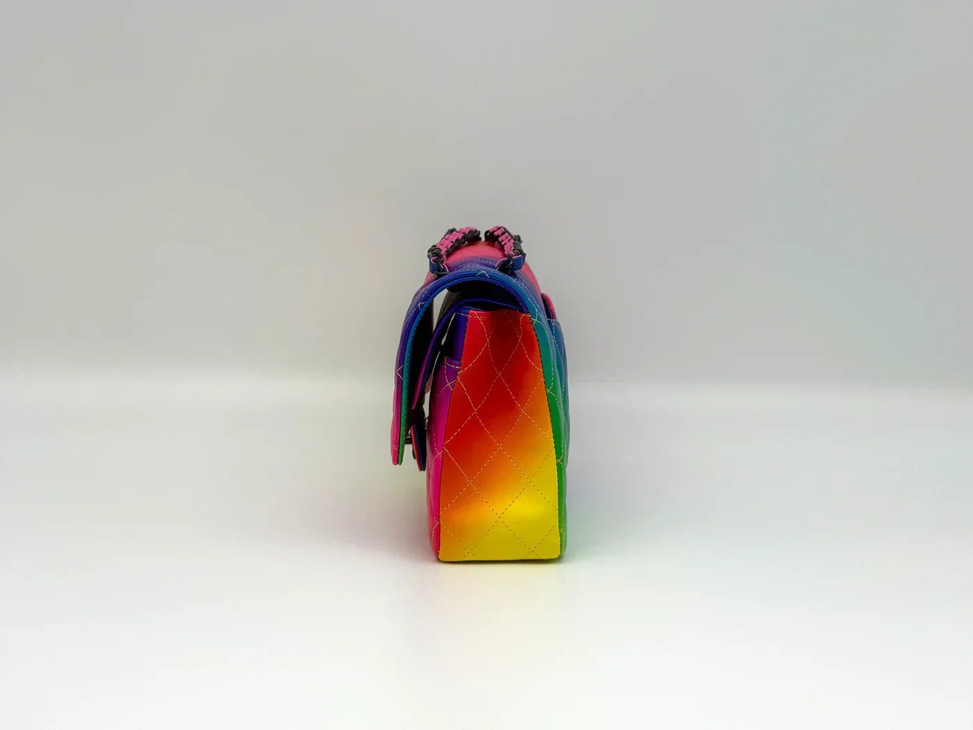 This specific model is crafted from quilted lambskin leather in a vibrant, multi-colored rainbow ombré. It features a seamless gradient of pastel hues including shades of pink, yellow, blue, and green that transition fluidly across the diamond-quilted body. The signature design element is the gunmetal (black-tone) hardware, which offers a sharp, modern contrast to the soft, colorful palette of the leather.