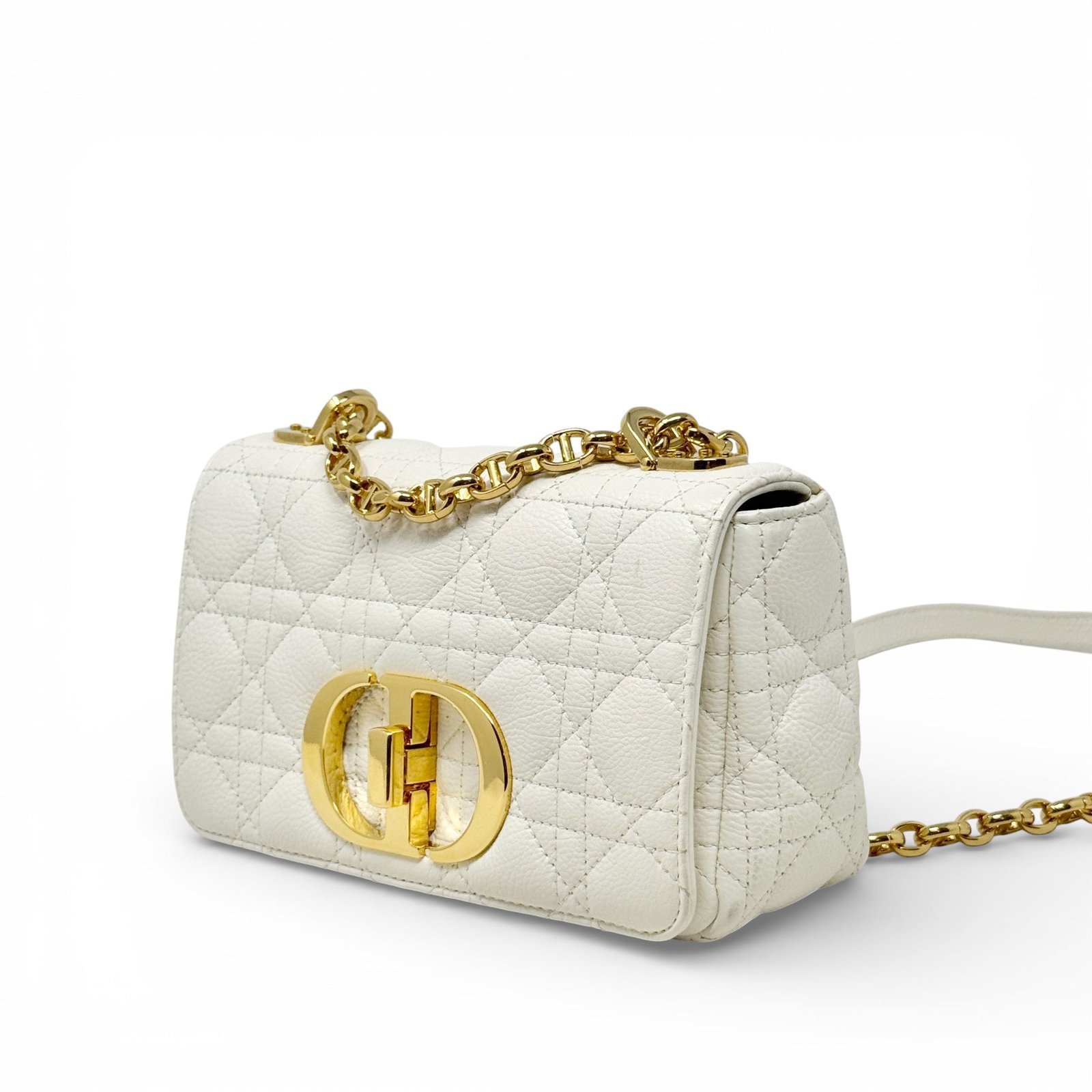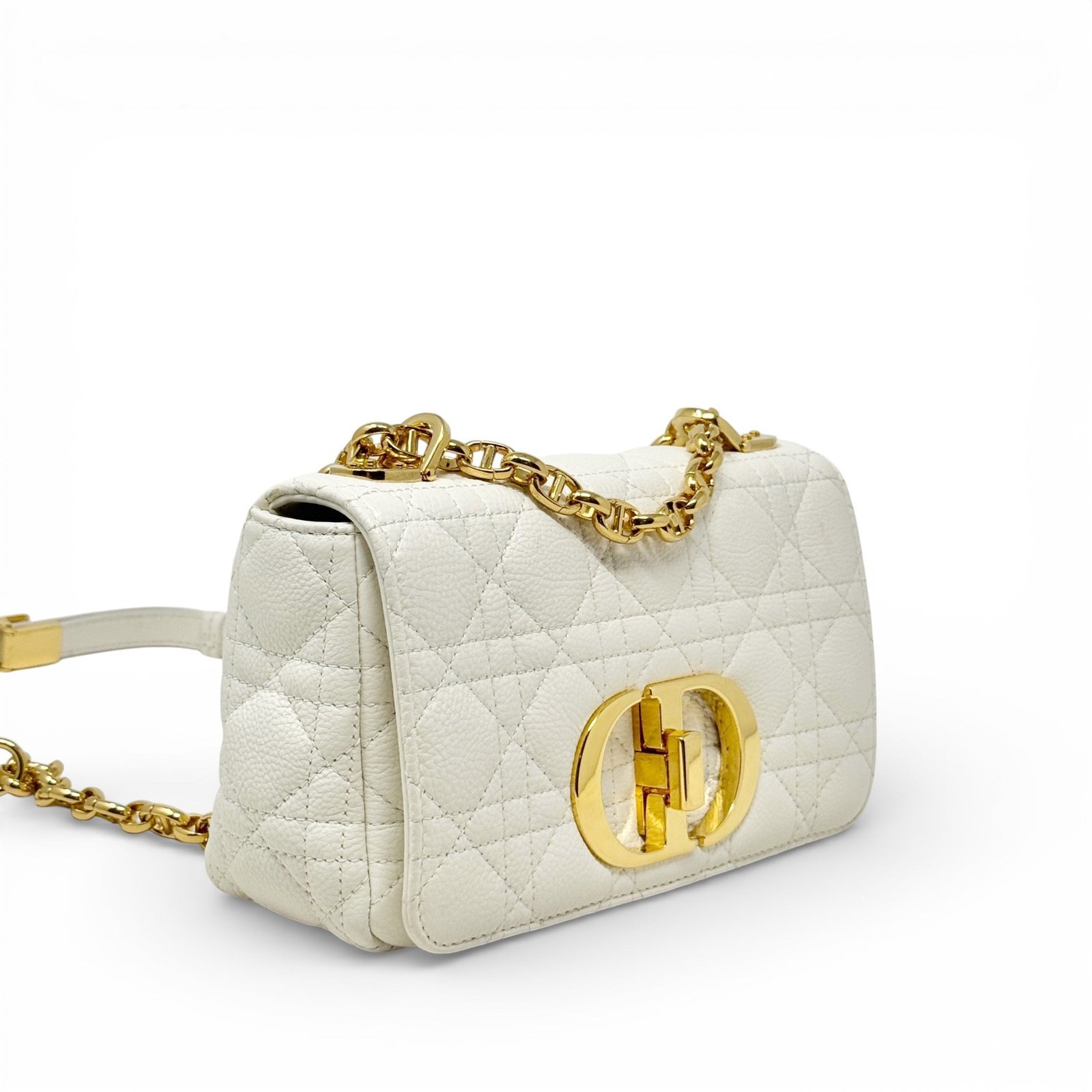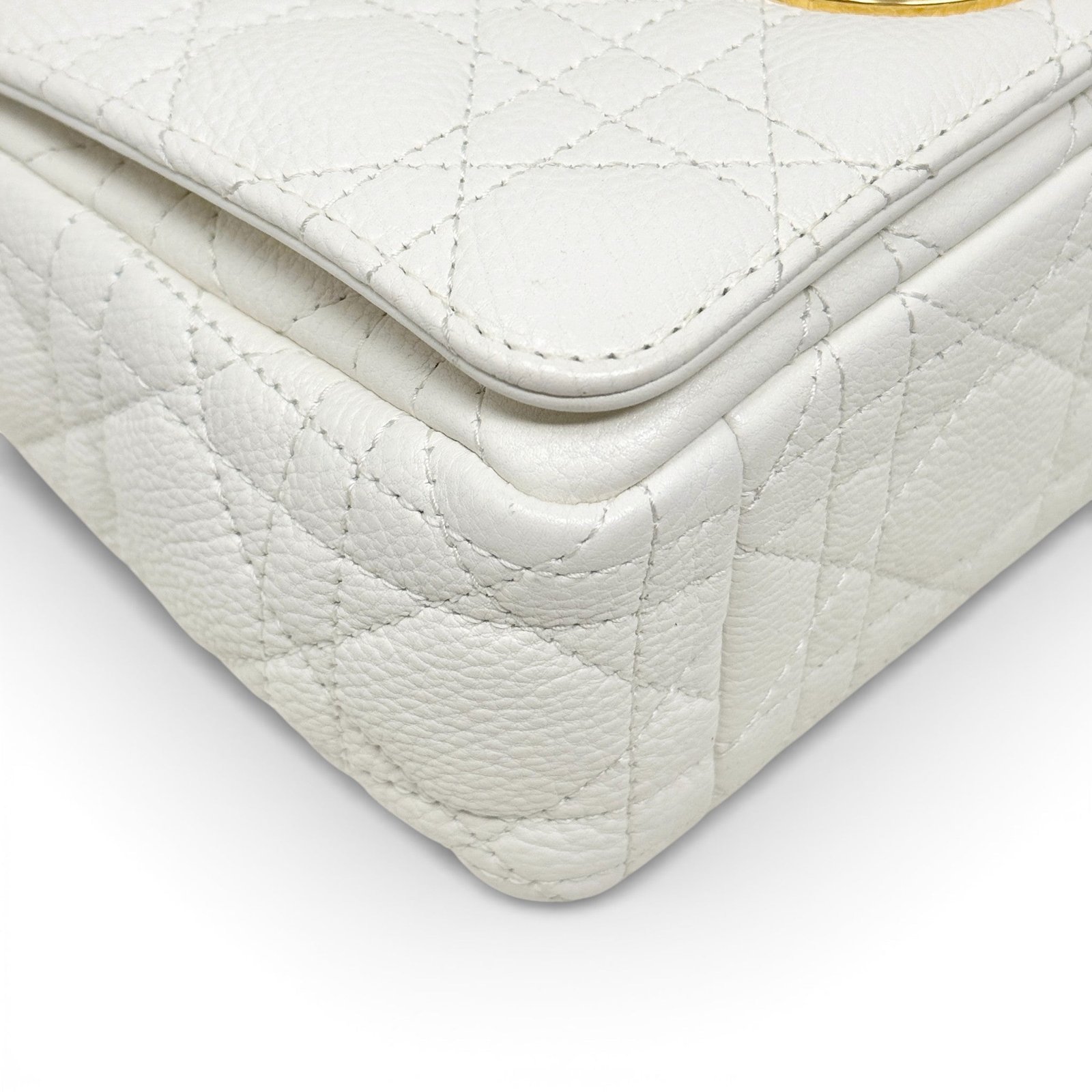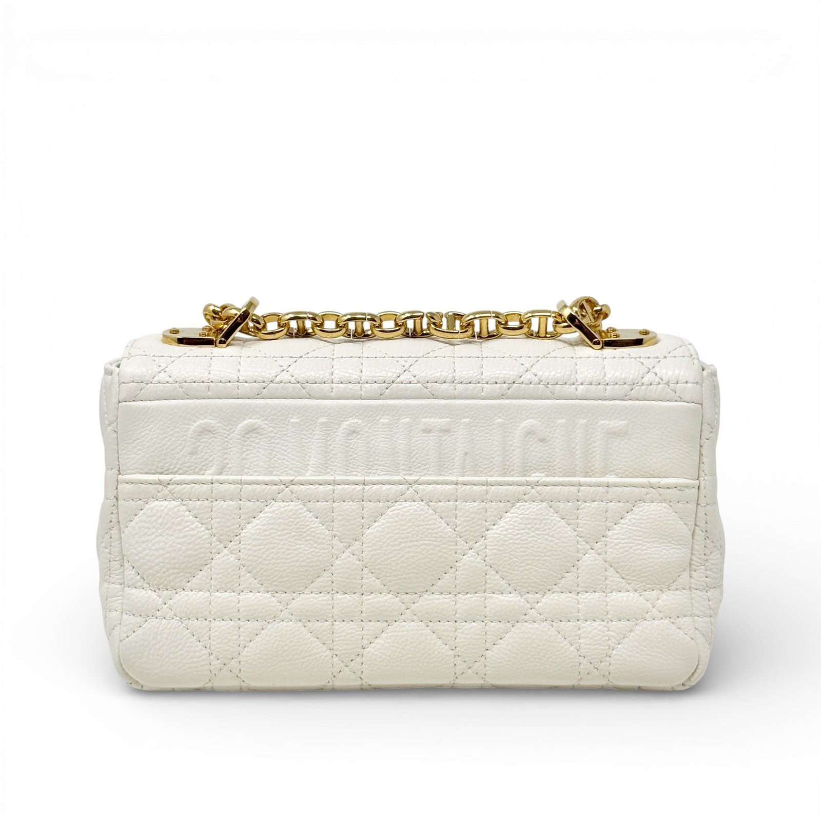 The Dior Caro bag combines modernity with timeless elegance. The design is crafted in latte calfskin with Cannage stitching. The supple bag features a flap adorned with an antique gold-finish metal ‘CD’ twist clasp, inspired by the seal of a Christian Dior perfume bottle.