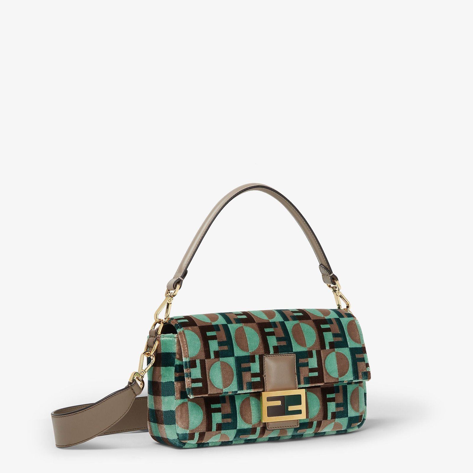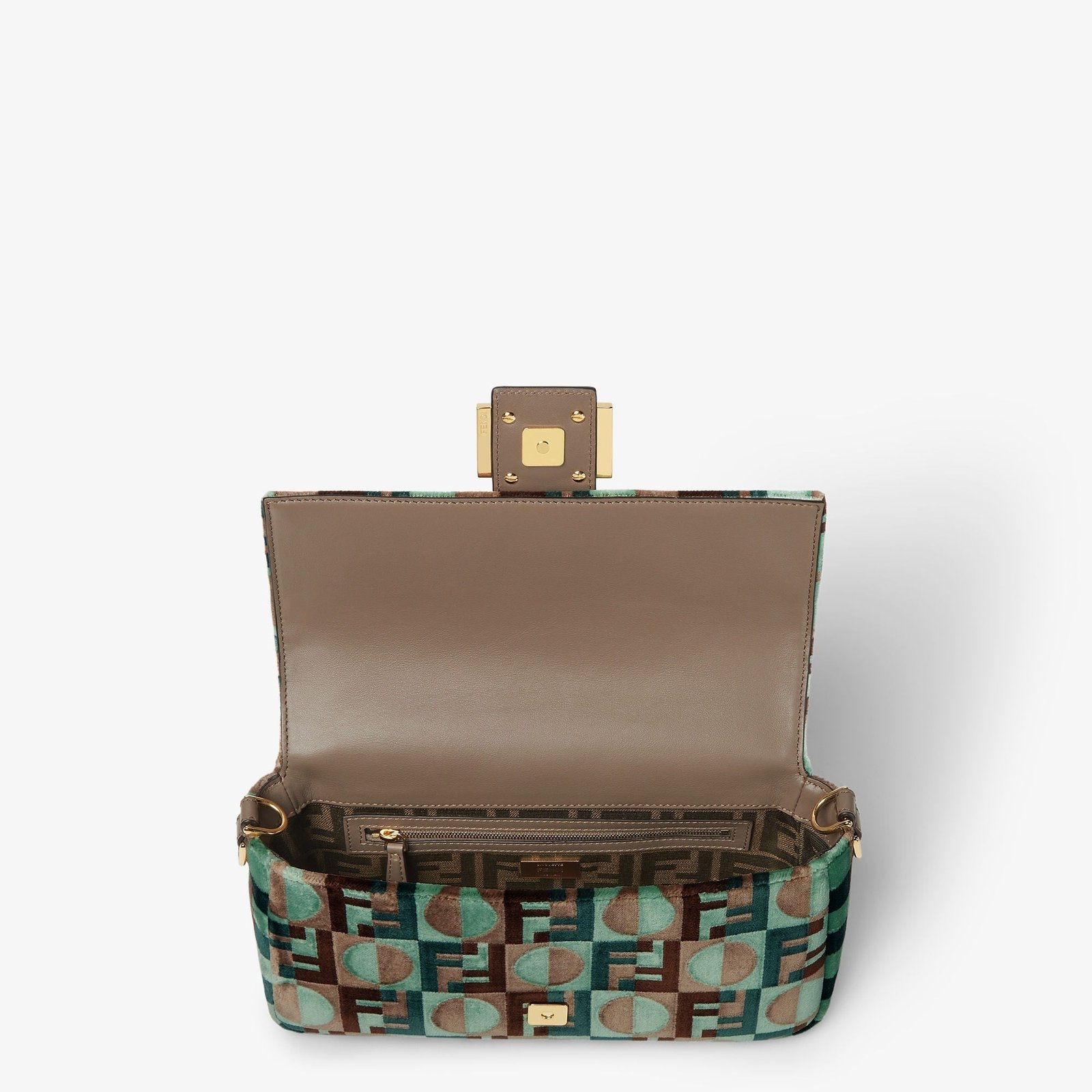 Featuring a front flap, magnetic clasp, internal compartment lined in the iconic tobacco brown FF jacquard with a zip pocket, and gold-finish metalware.