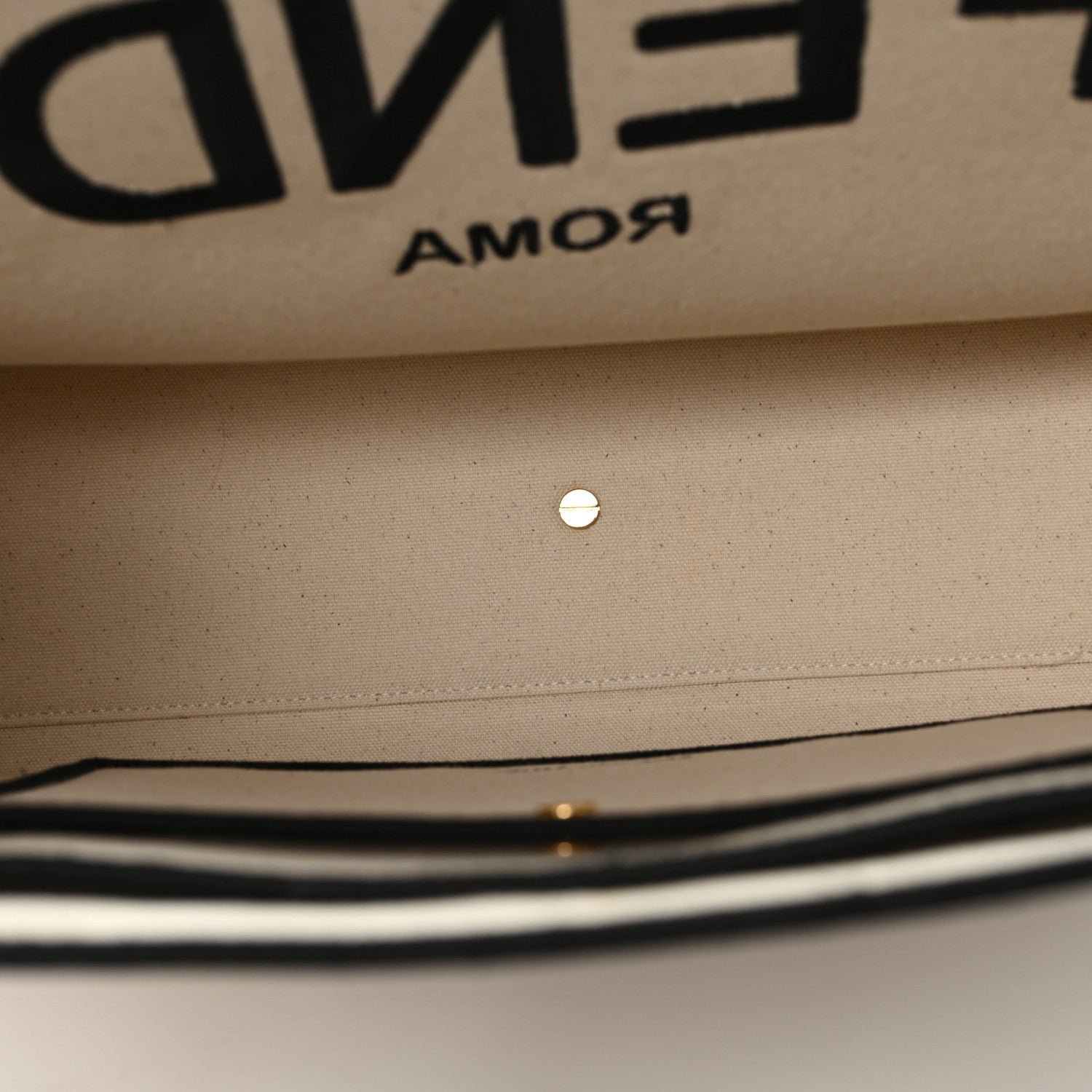 The Large Shopping Tote is a structured carryall crafted from durable Grezzo-colored canvas (a natural cream or off-white fabric). It features a large, boldly embossed Fendi logo on the front, accented by intricate black stitched detailing that emphasizes its geometric shape.