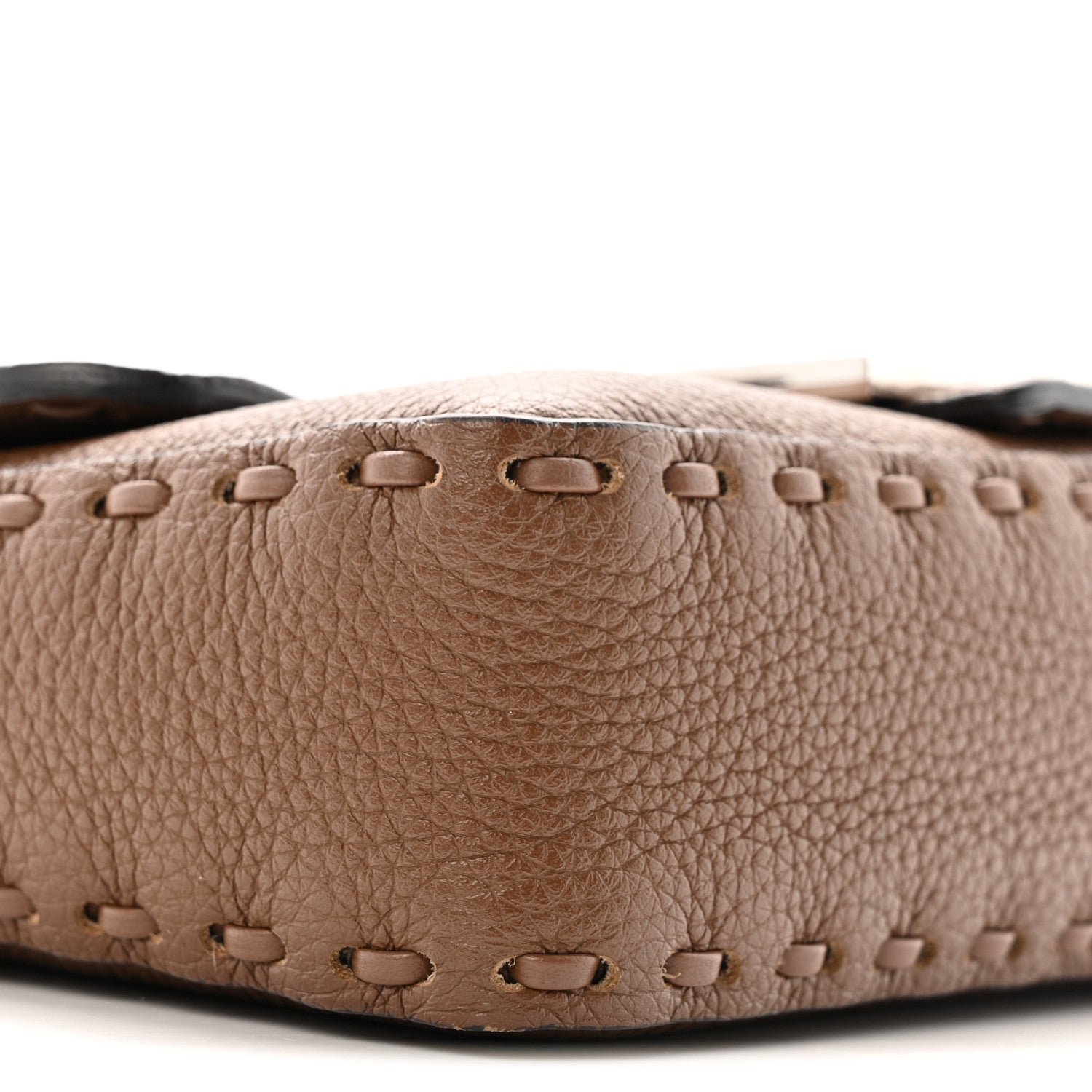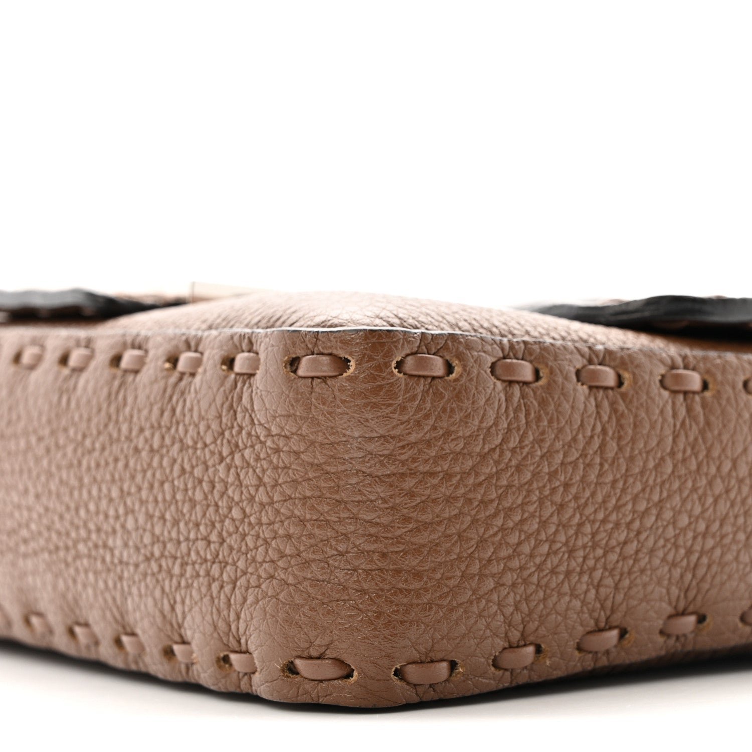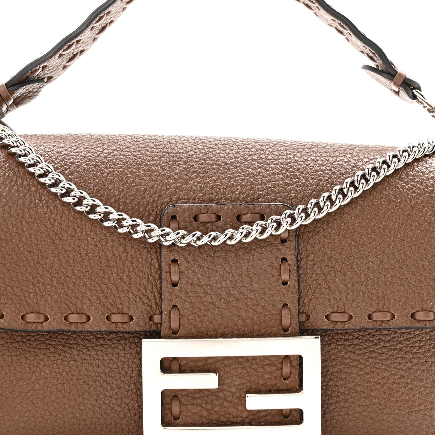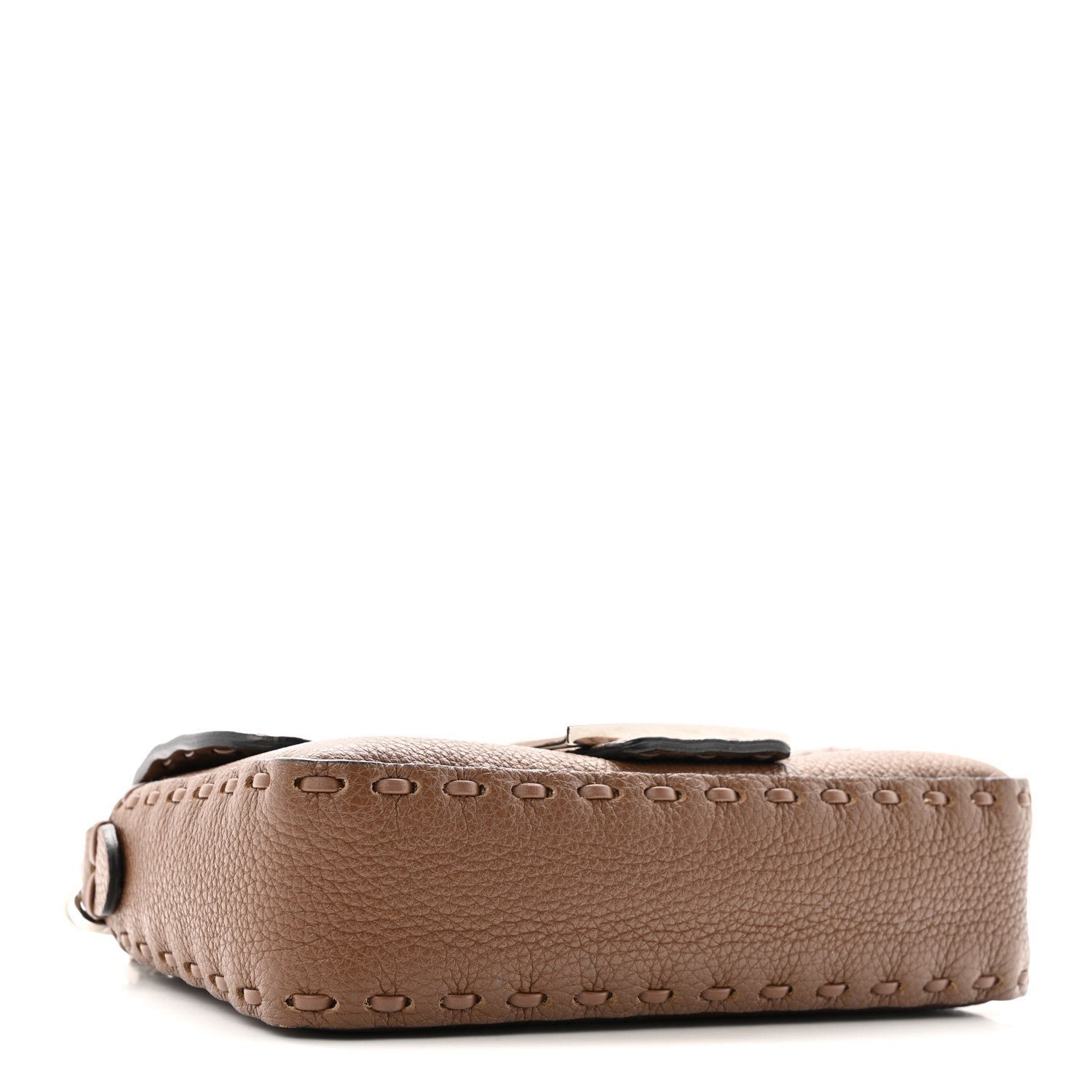 This Mini Baguette is a high-craft iteration of the iconic Fendi silhouette. It is crafted from Cuoio Roma grained calfskin, a material prized for its soft texture and durability. The “Sellerissima” designation highlights the use of specialized, macro Nappa Sintetica Tape Stitching a thick, ribbon-like (fettuccia) leather stitch that creates a bold, geometric frame along the bag’s borders and seams.
