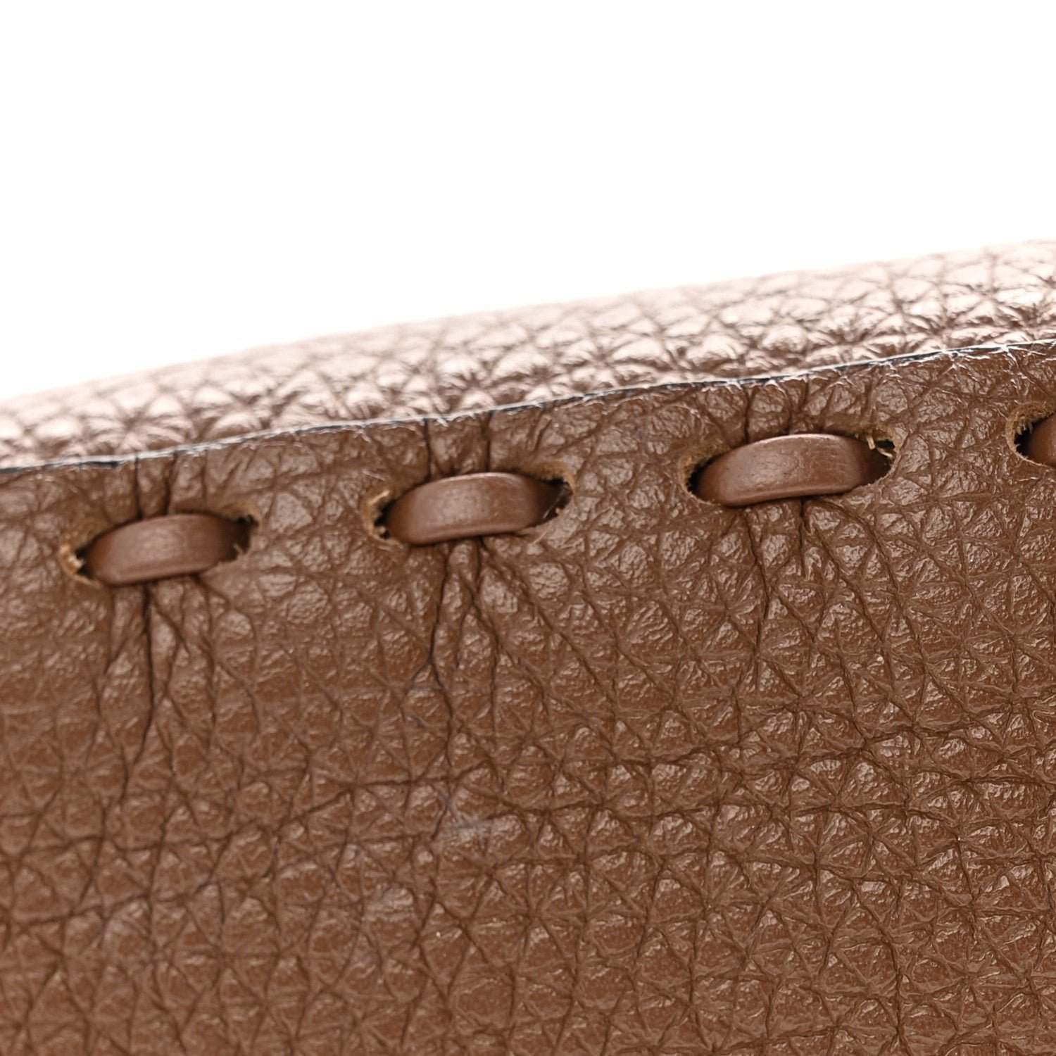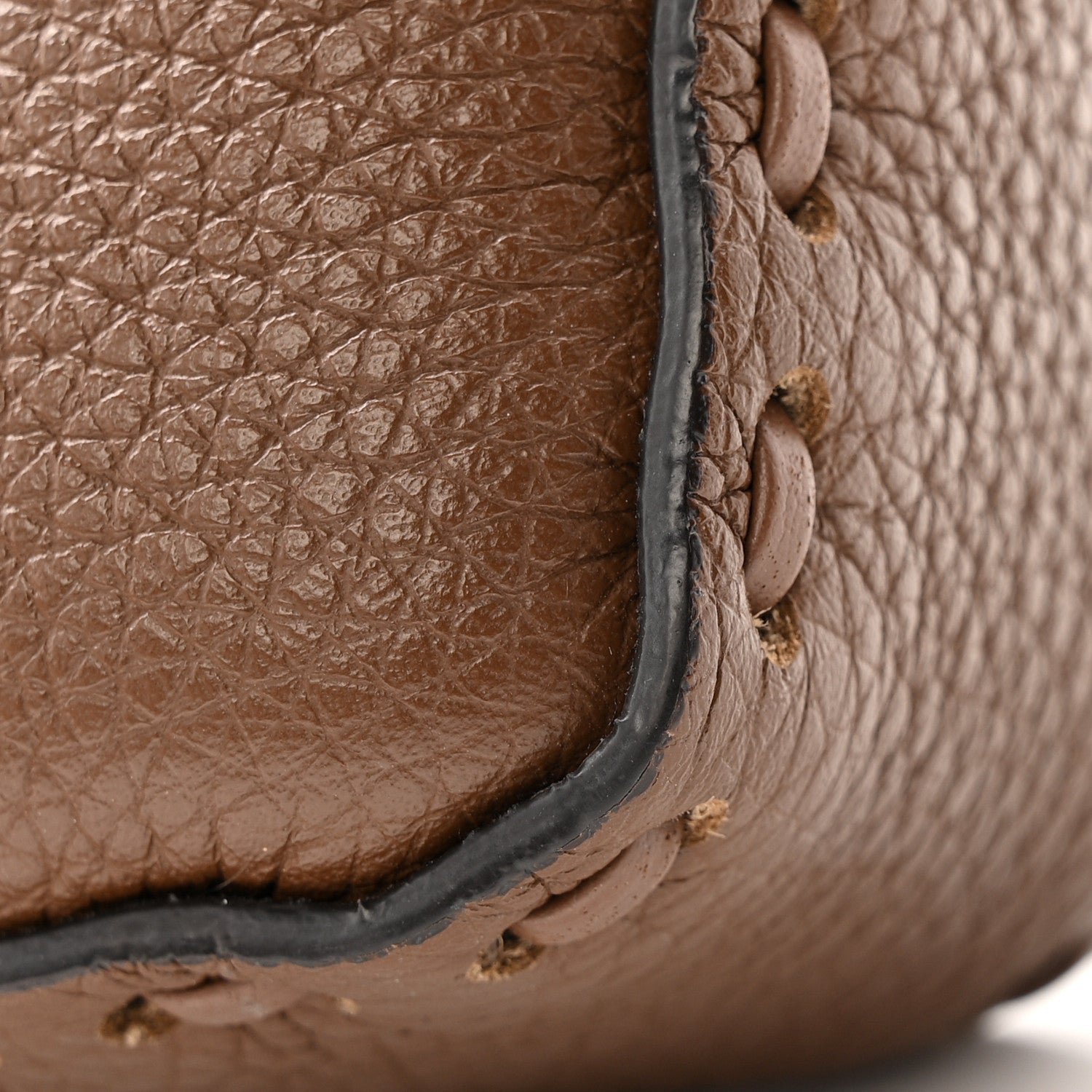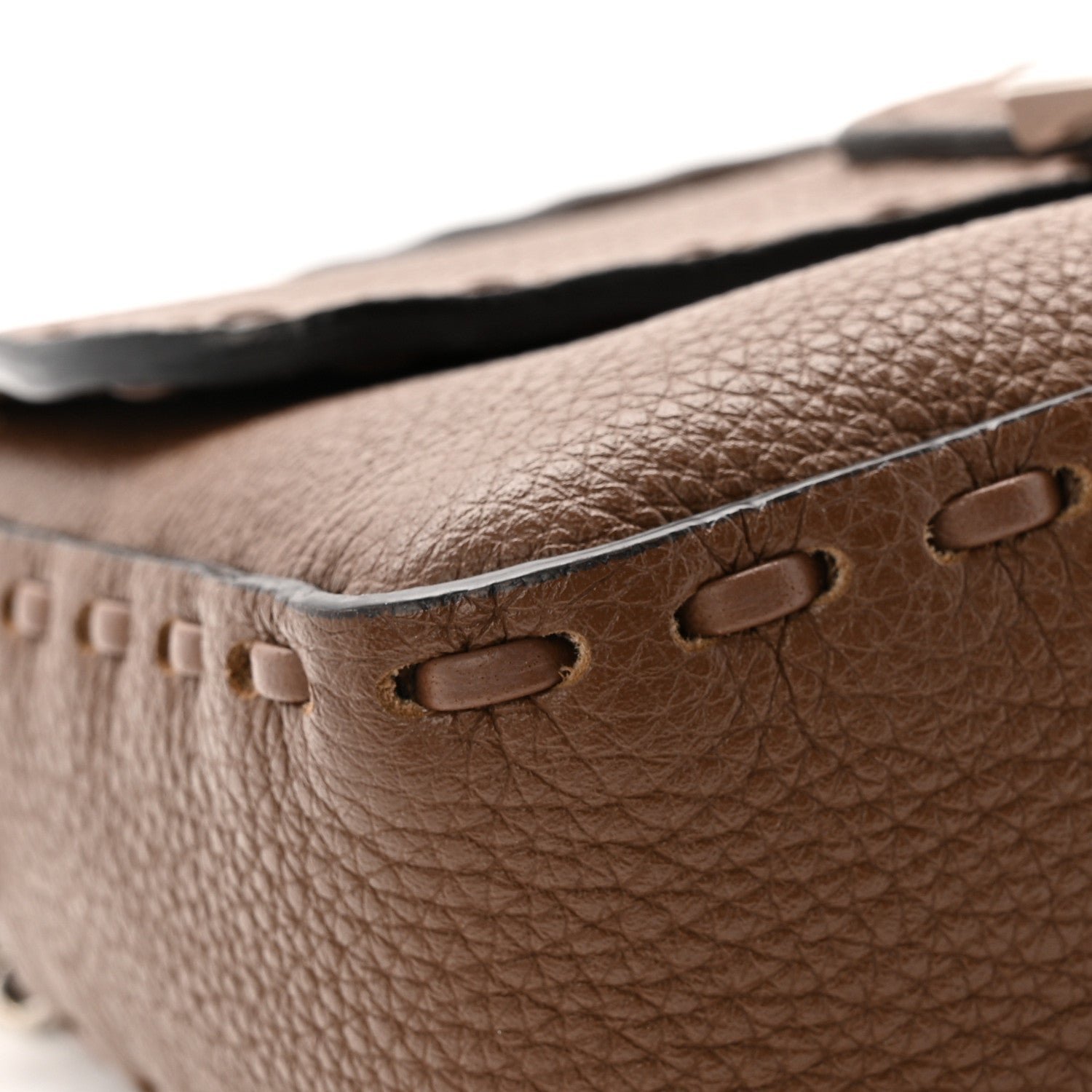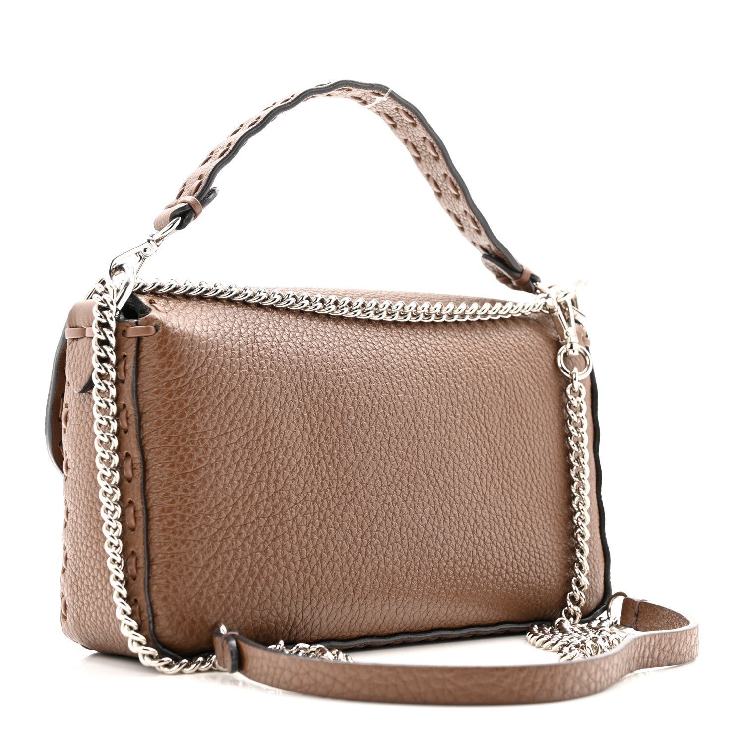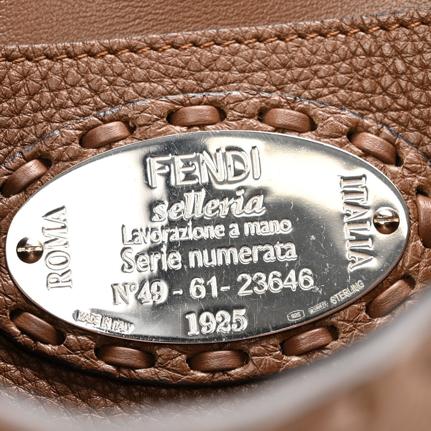 This Mini Baguette is a high-craft iteration of the iconic Fendi silhouette. It is crafted from Cuoio Roma grained calfskin, a material prized for its soft texture and durability. The “Sellerissima” designation highlights the use of specialized, macro Nappa Sintetica Tape Stitching a thick, ribbon-like (fettuccia) leather stitch that creates a bold, geometric frame along the bag’s borders and seams.