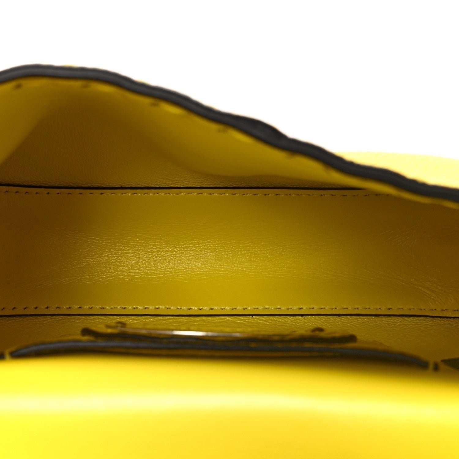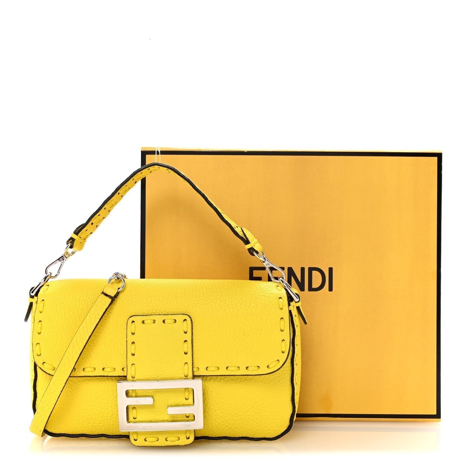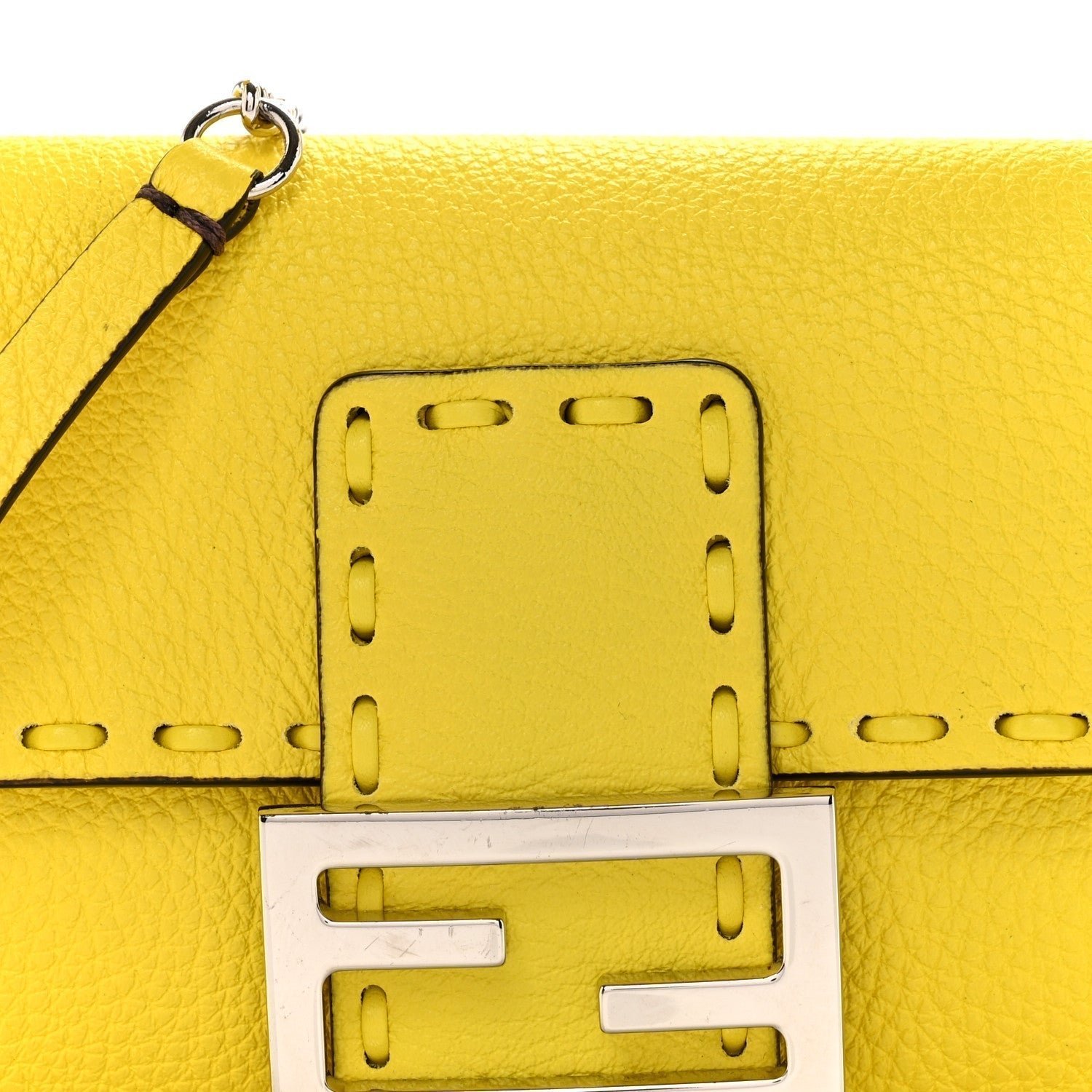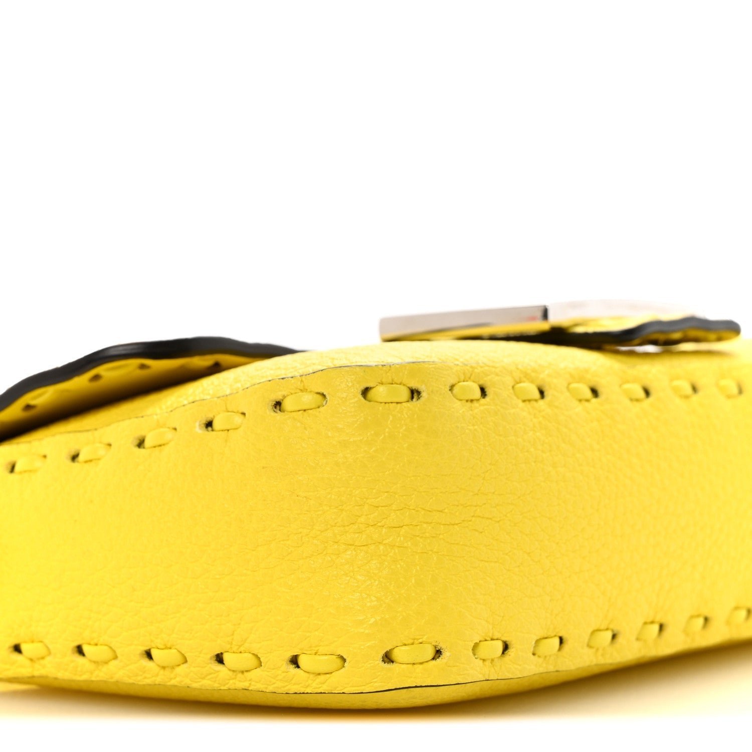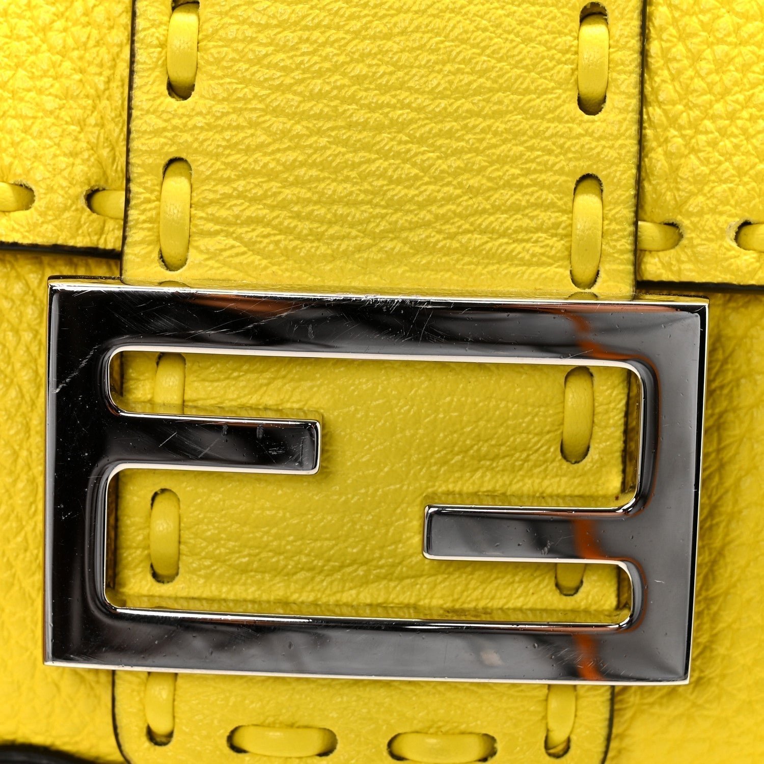 This Mini Baguette is meticulously crafted from Cuoio Roma grained calfskin leather, known for its supple texture and durability. The bag is defined by its Nappa Sintetica Tape Stitching, a decorative trim where thick, yellow macro topstitches hand-sewn by Fendi artisans highlight the edges and borders of the bag.