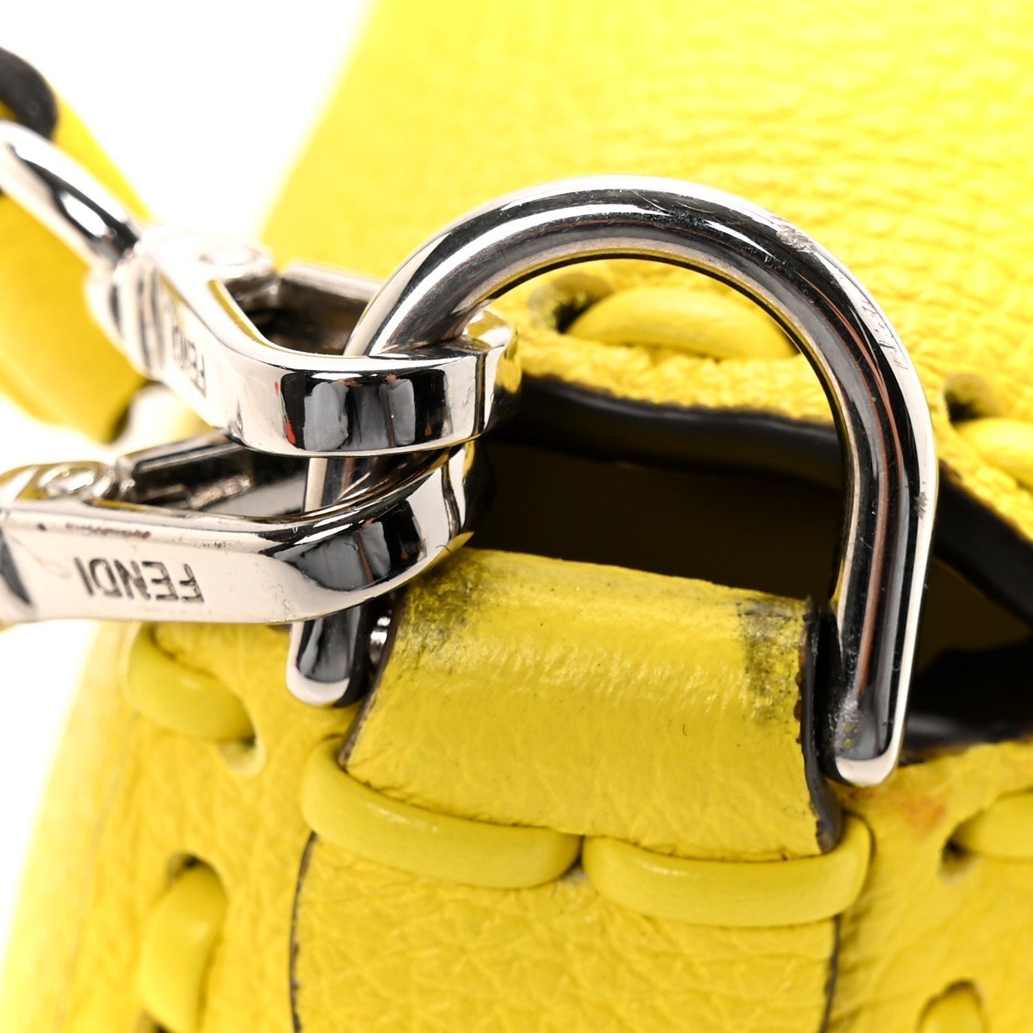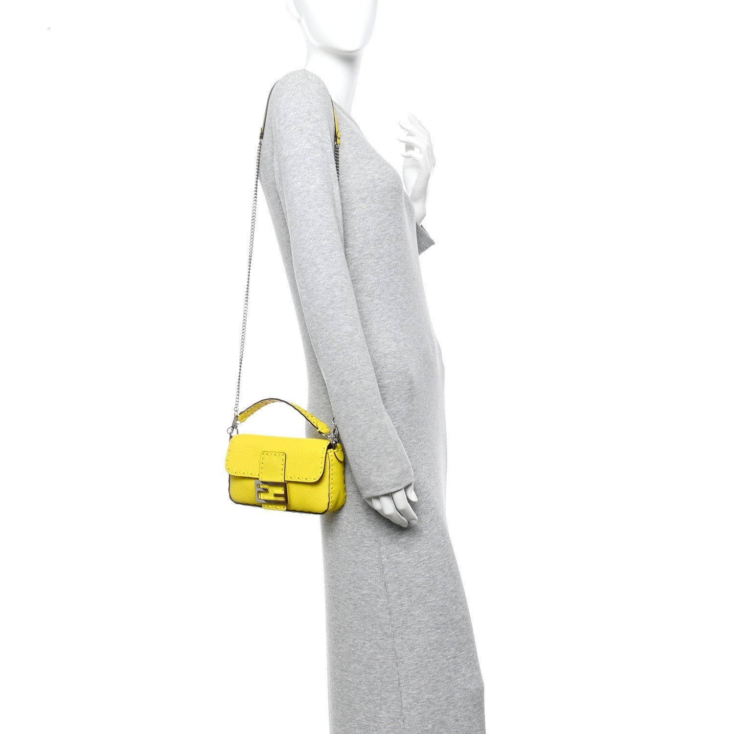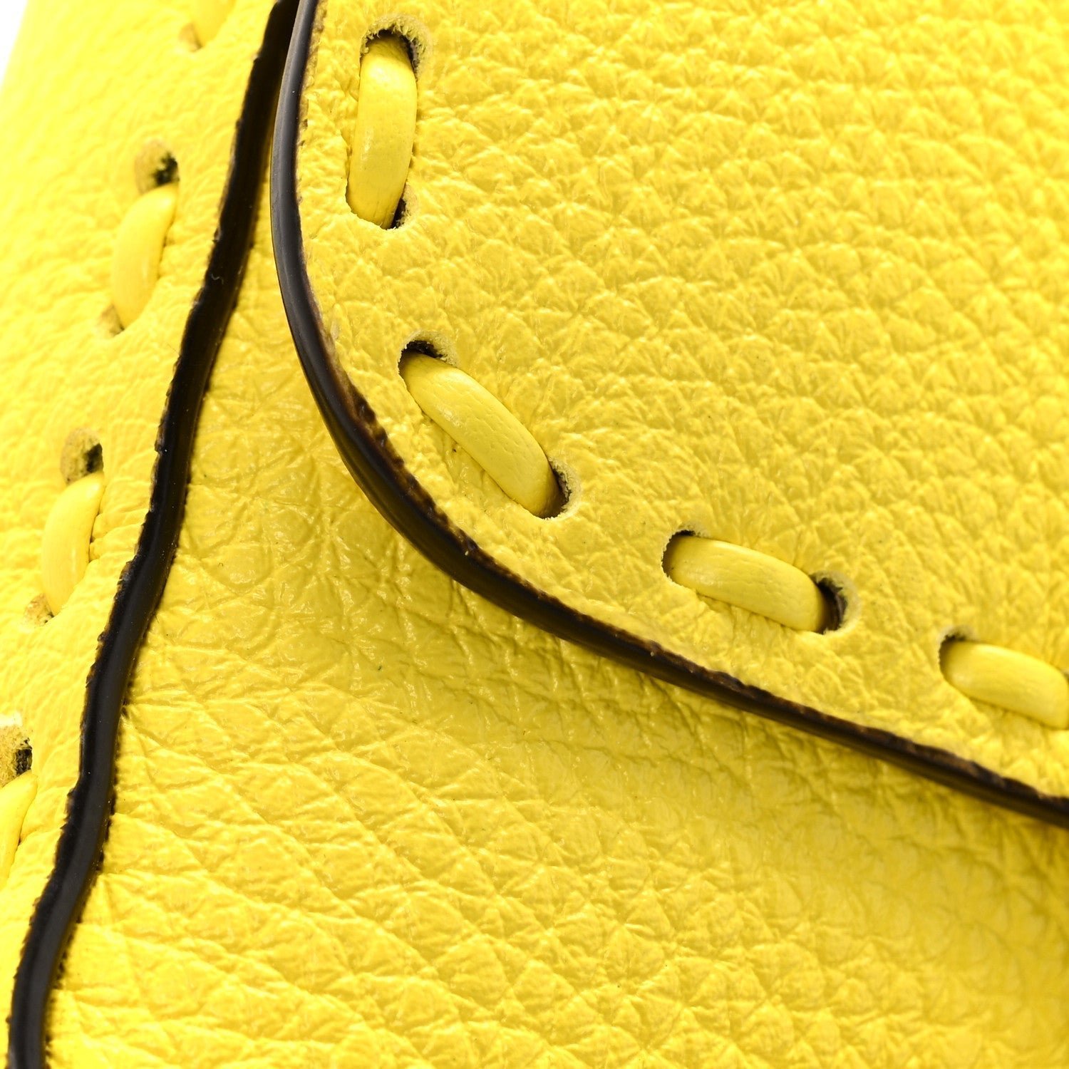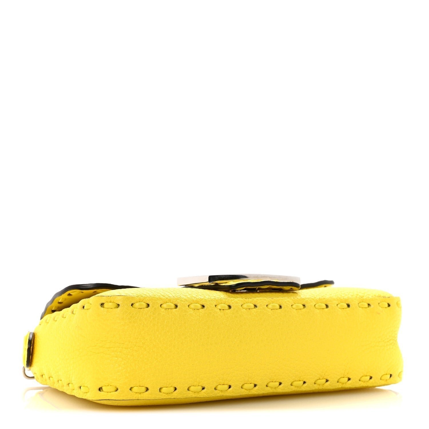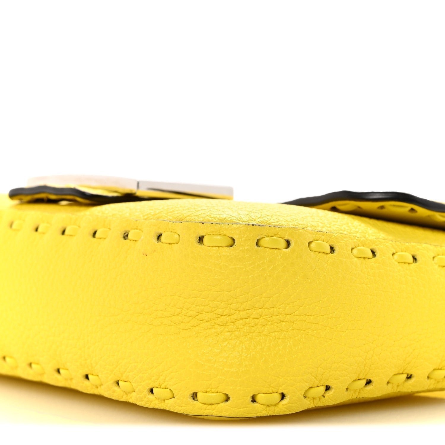 This Mini Baguette is meticulously crafted from Cuoio Roma grained calfskin leather, known for its supple texture and durability. The bag is defined by its Nappa Sintetica Tape Stitching, a decorative trim where thick, yellow macro topstitches hand-sewn by Fendi artisans highlight the edges and borders of the bag.