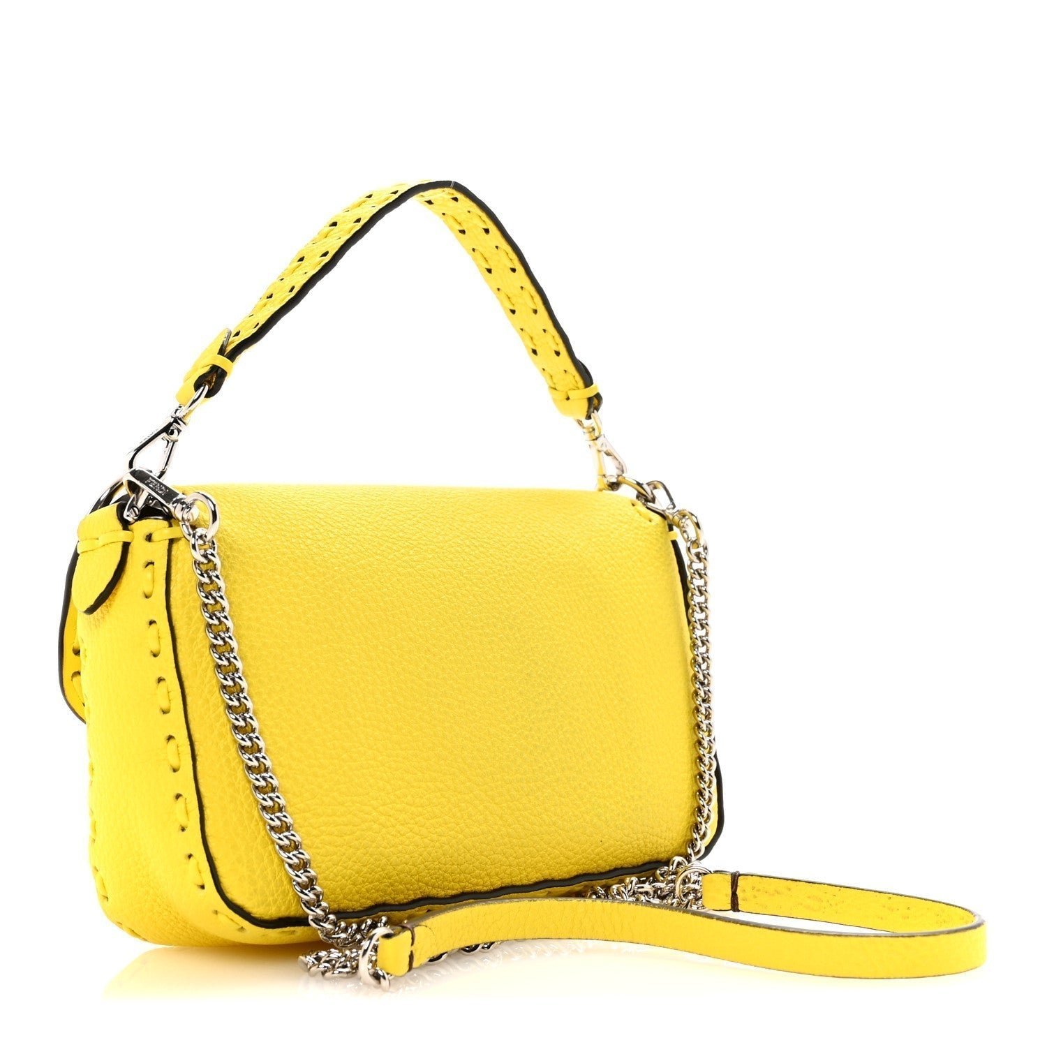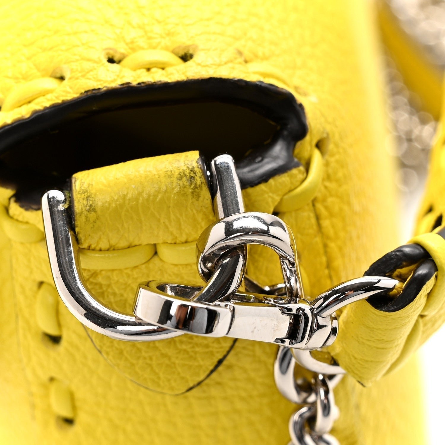 Strap/Handle: Features a detachable yellow leather top handle and an optional silver chain shoulder strap with a leather shoulder pad.