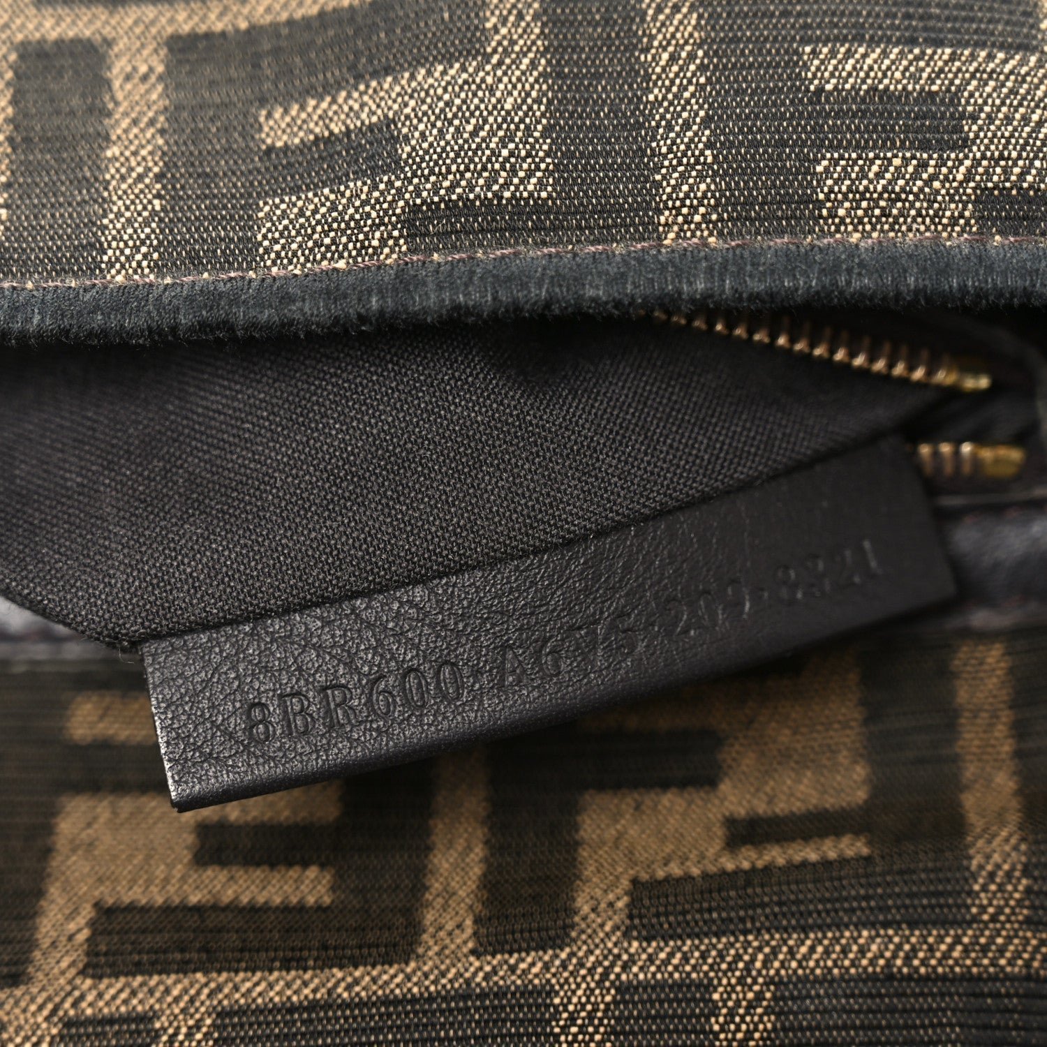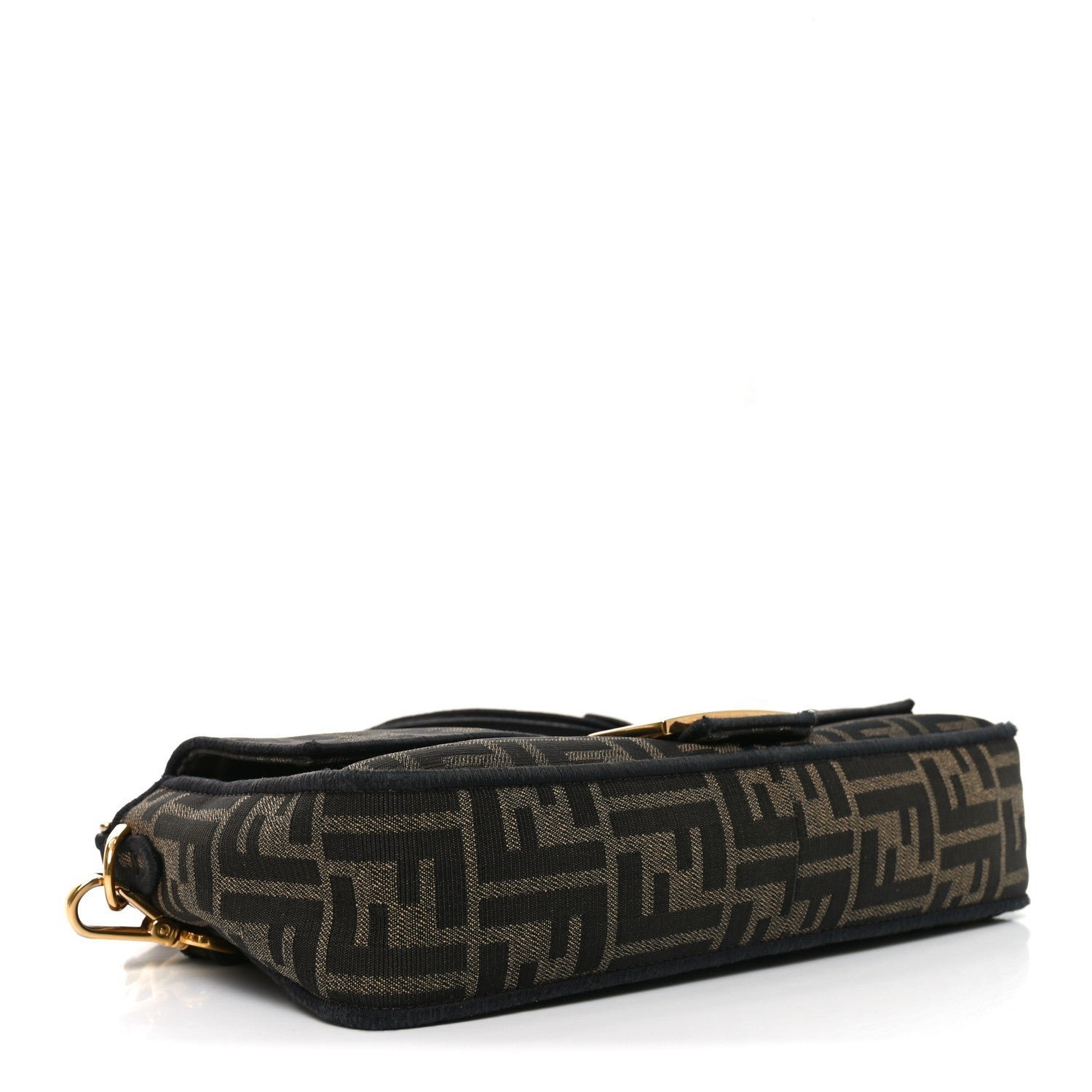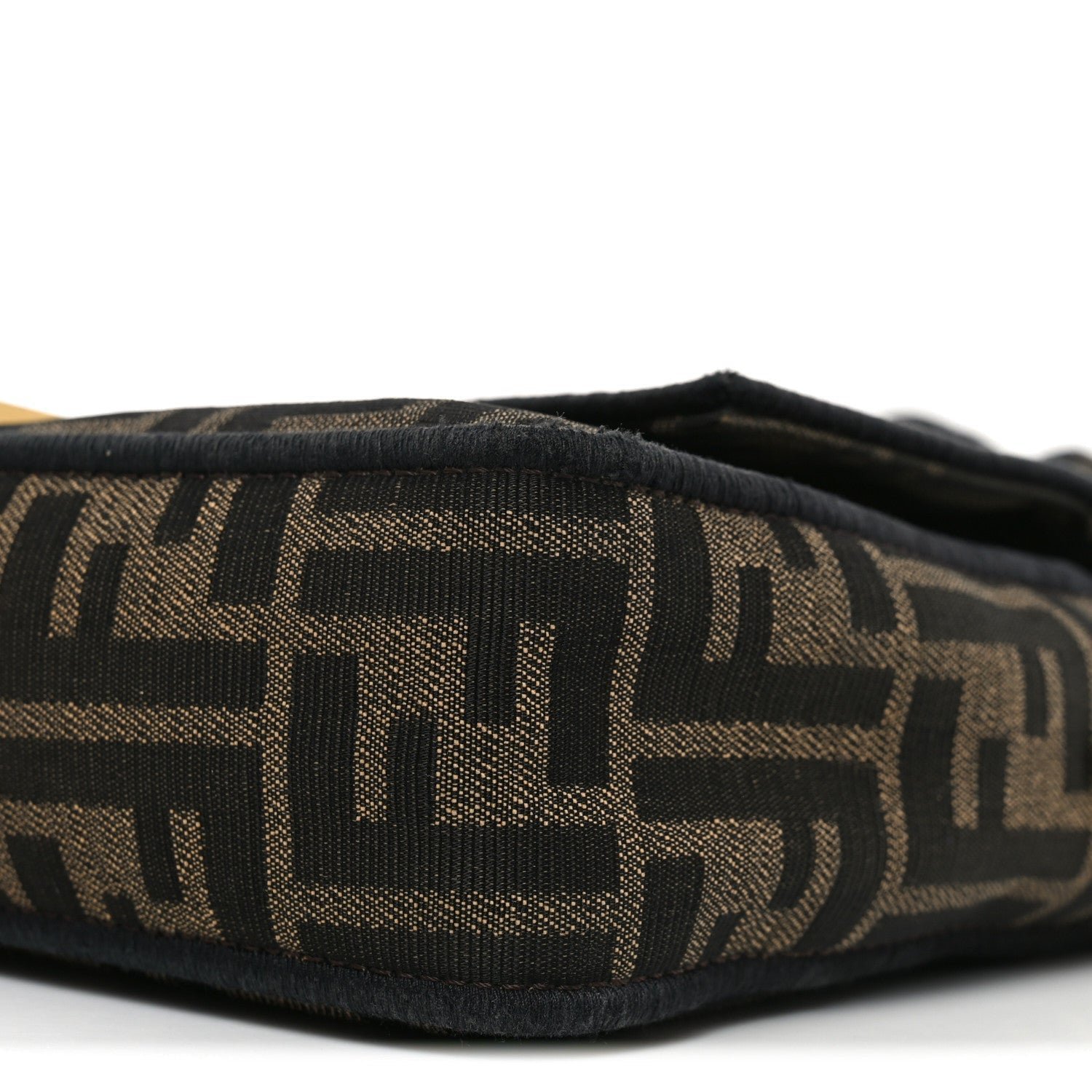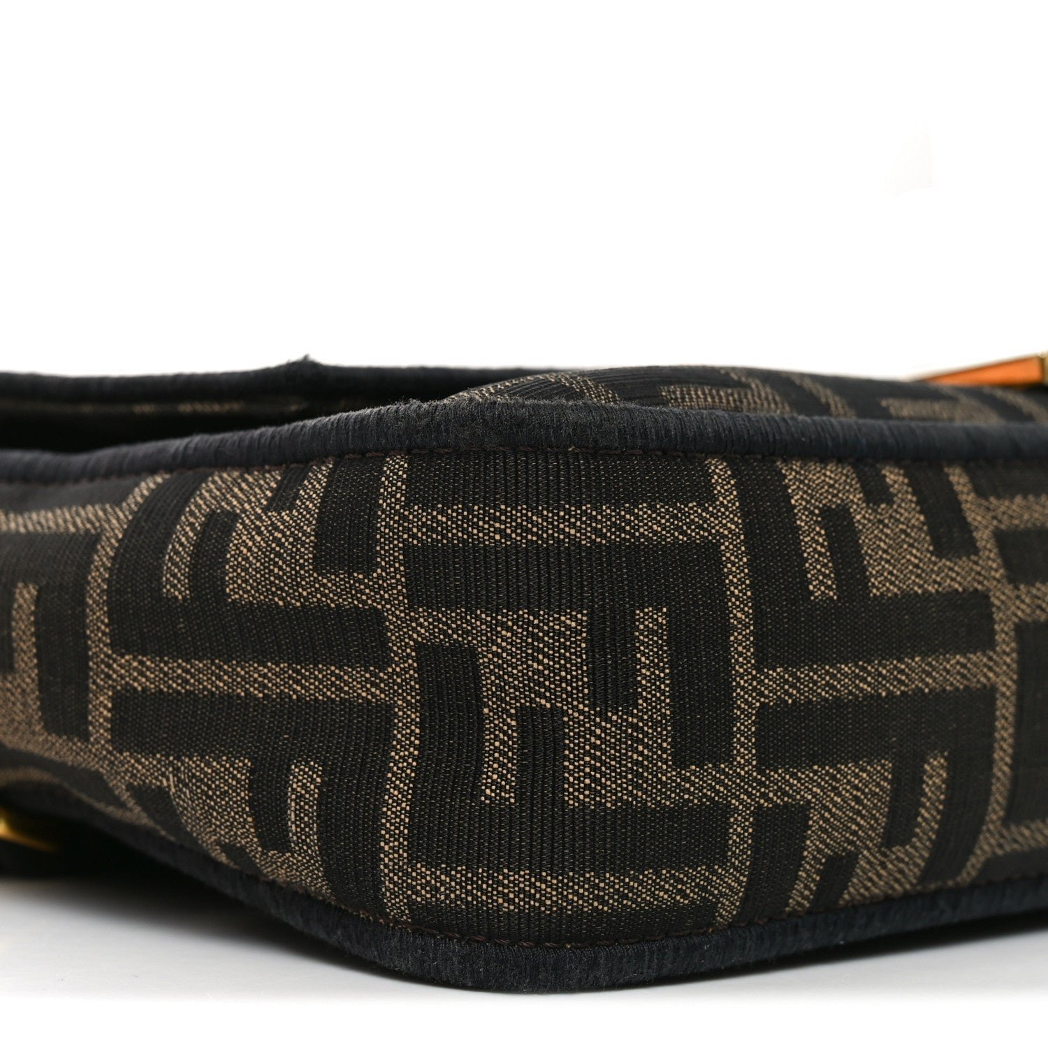 The Medium Baguette is distinguished by its iconic underarm silhouette and soft construction. This iteration is meticulously crafted from tobacco-brown FF jacquard fabric, featuring a black-and-brown monogram pattern.