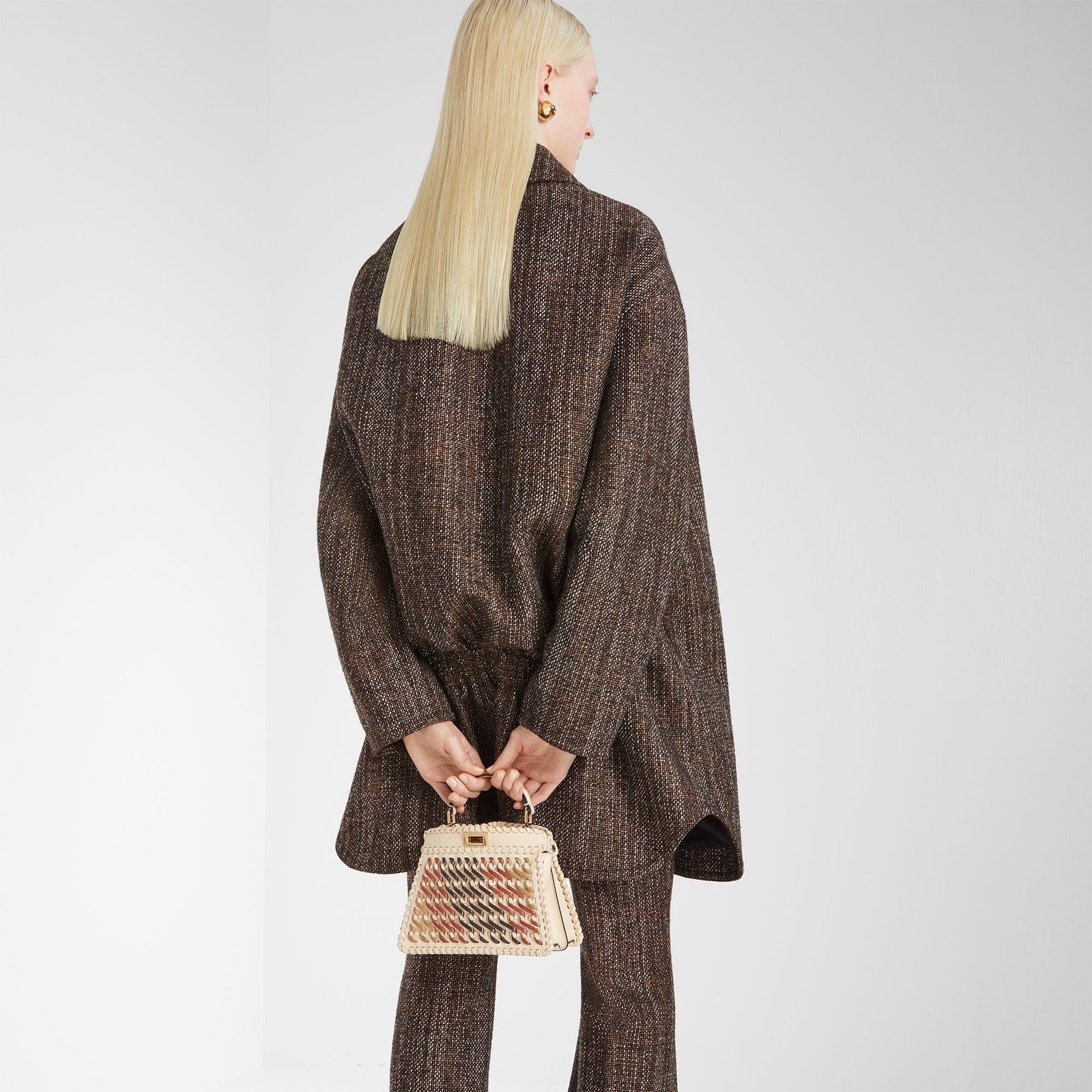 Made of beige calfskin, embellished with hand-woven leather and suede strips in cappuccino, sienna brown and dark brown tones.