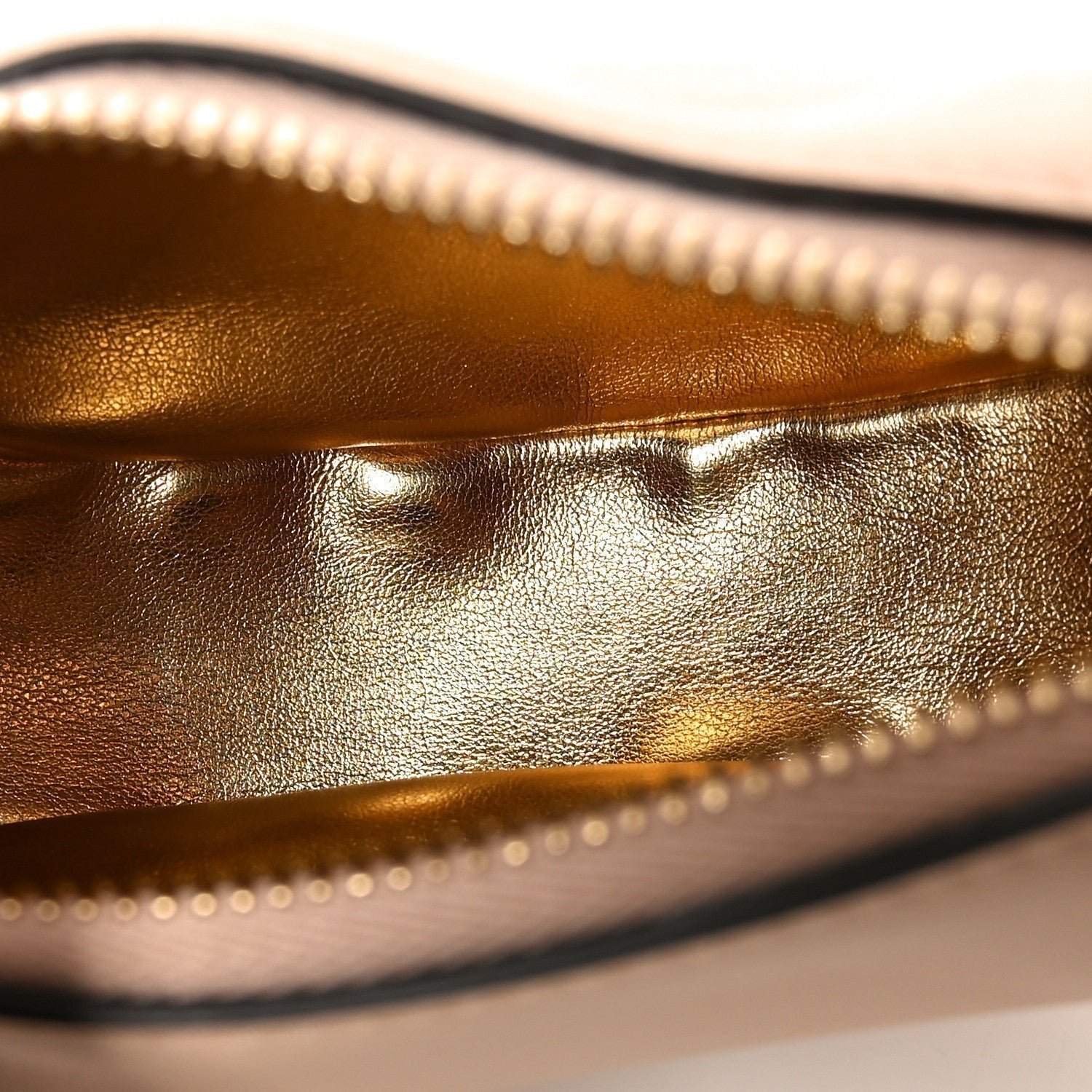 The charm’s defining feature is the oversized vintage gold-finish metal FENDI lettering applied to the base, which is prominently displayed when the bag is carried. It features a secure top zip closure that opens to reveal a gold leather interior. Designed for maximum versatility, it includes an adjustable strap with a clip, allowing it to be attached to larger totes as a decorative charm or worn around the wrist.