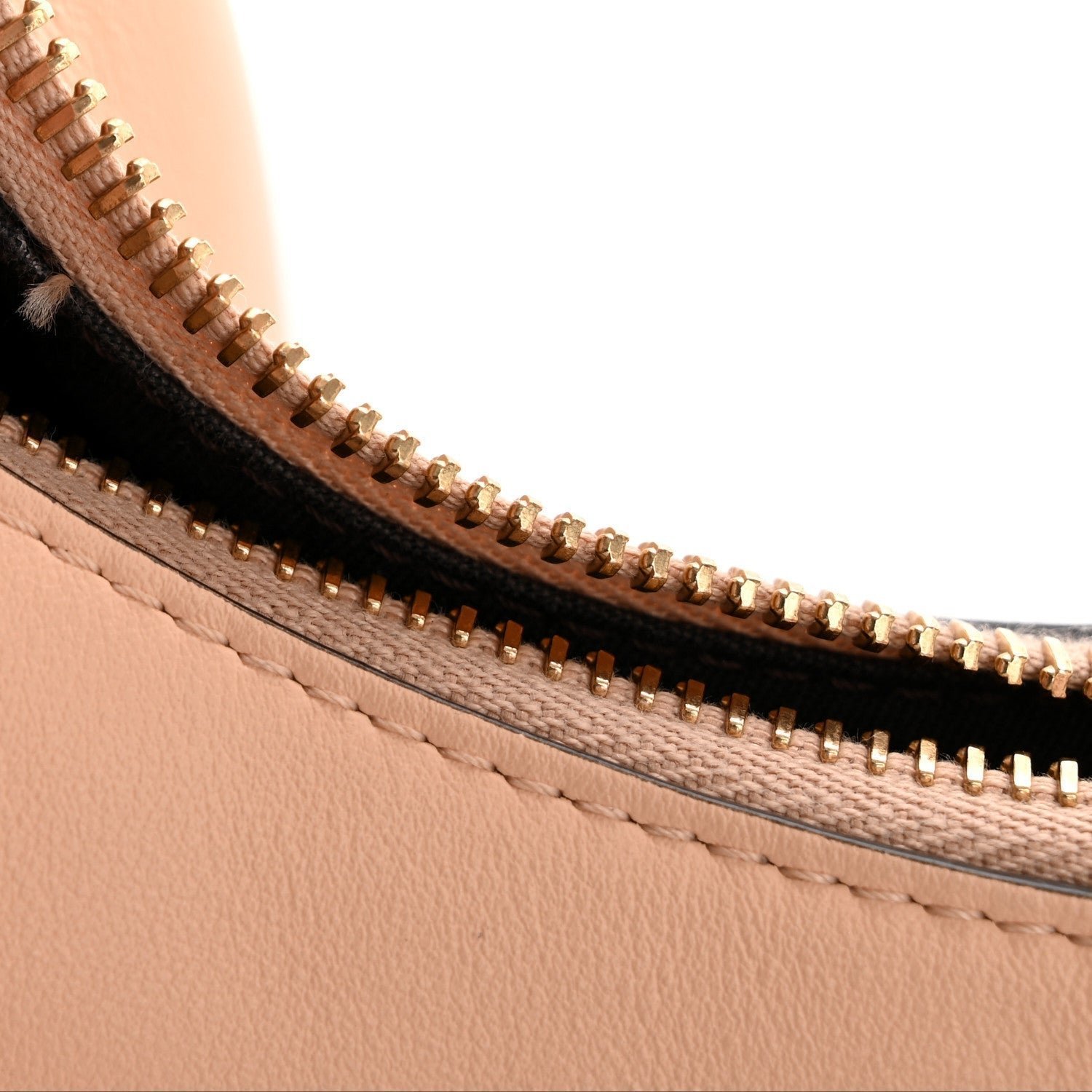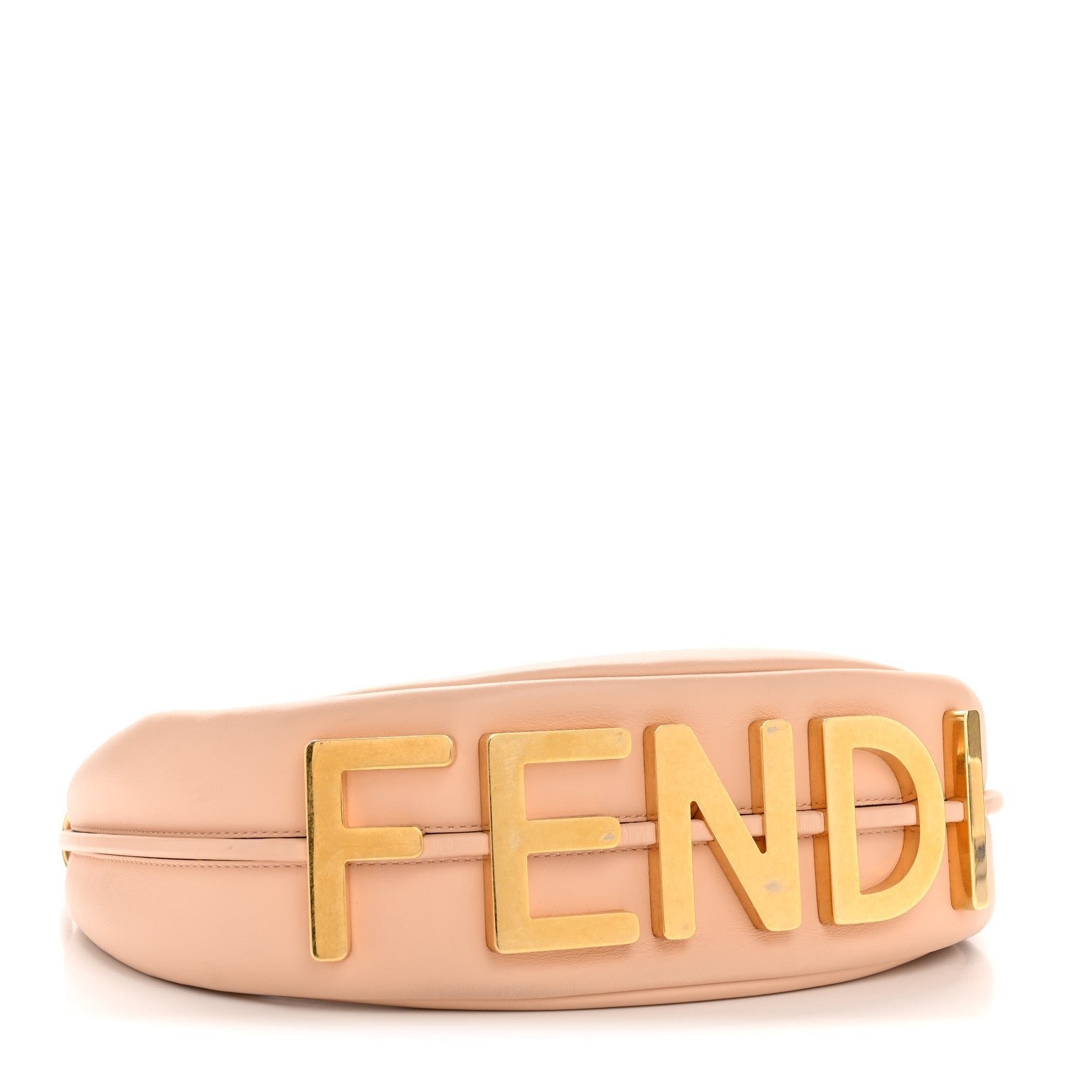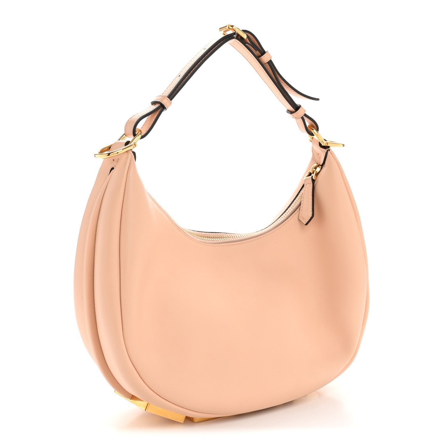 The Small Fendigraphy is a chic hobo bag characterized by its architectural shape and refined aesthetic. This iteration is crafted from Light Rose Vitello Grace leather, a soft, pastel pink that complements its minimalist design.