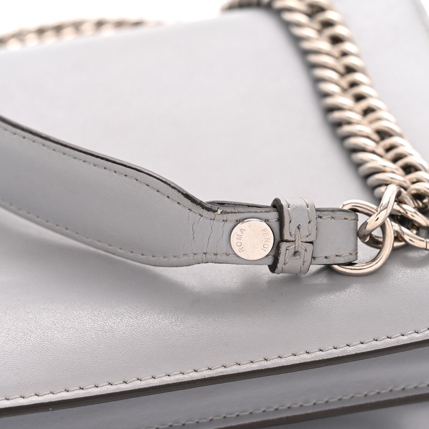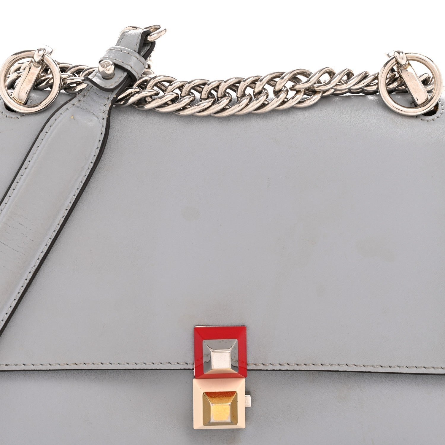 The Small Kan I is a structured, sophisticated shoulder bag that serves as a canvas for Fendi’s boldest creative expressions. This iteration is crafted from Vitello Liberty—a supple, full-grain calfskin leather known for its smooth finish and durability—in the elegant Ardesia (Slate Gray) hue.