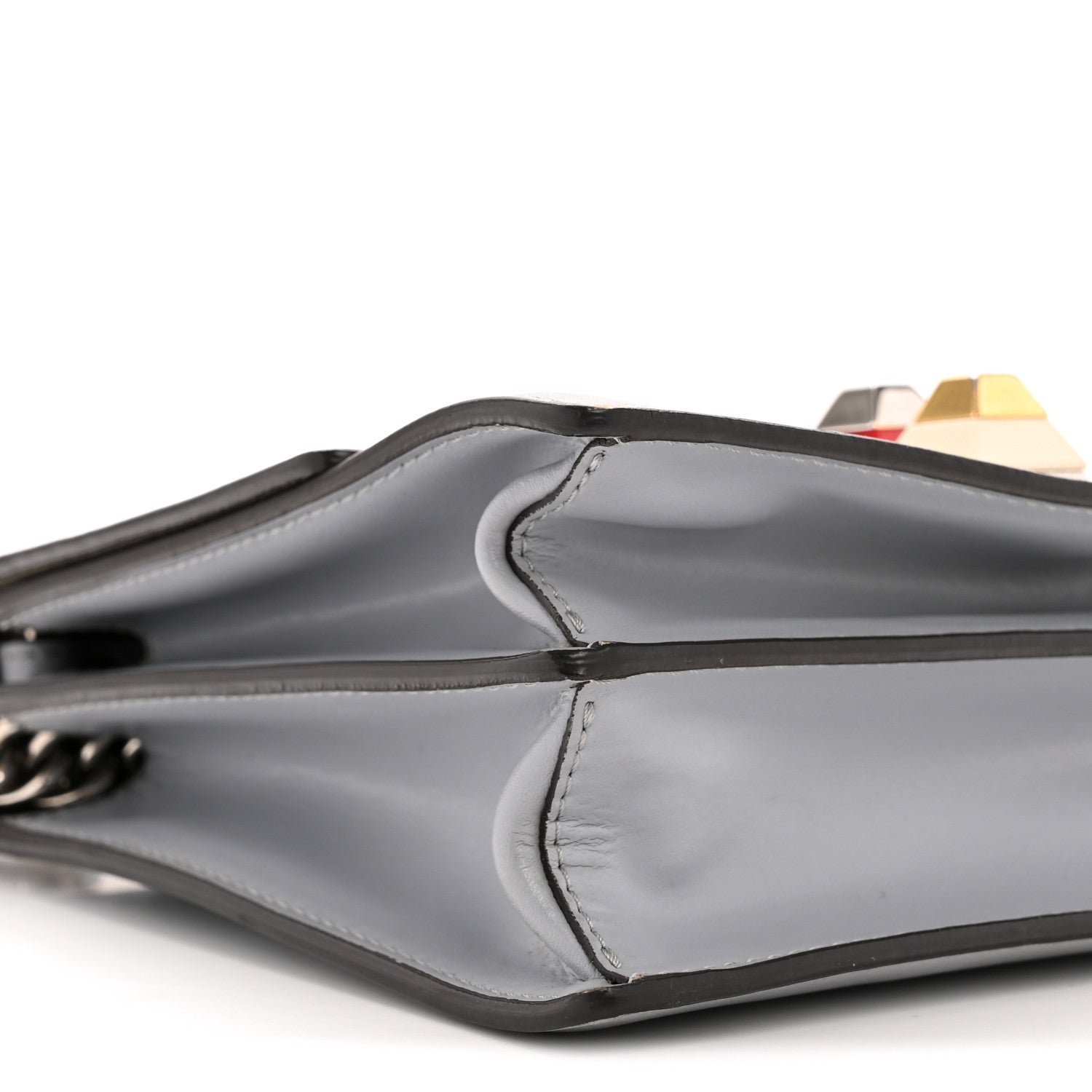 The bag is defined by its playful, multi-colored scalloped edges and a vibrant array of signature plexiglass pyramid studs on the front flap. The dual-stud “F is Fendi” logo closure adds a contemporary architectural touch. Designed for maximum versatility, it features a sliding chain shoulder strap with a leather insert, allowing it to be worn at two lengths: long for crossbody wear or doubled up for a short shoulder drop.