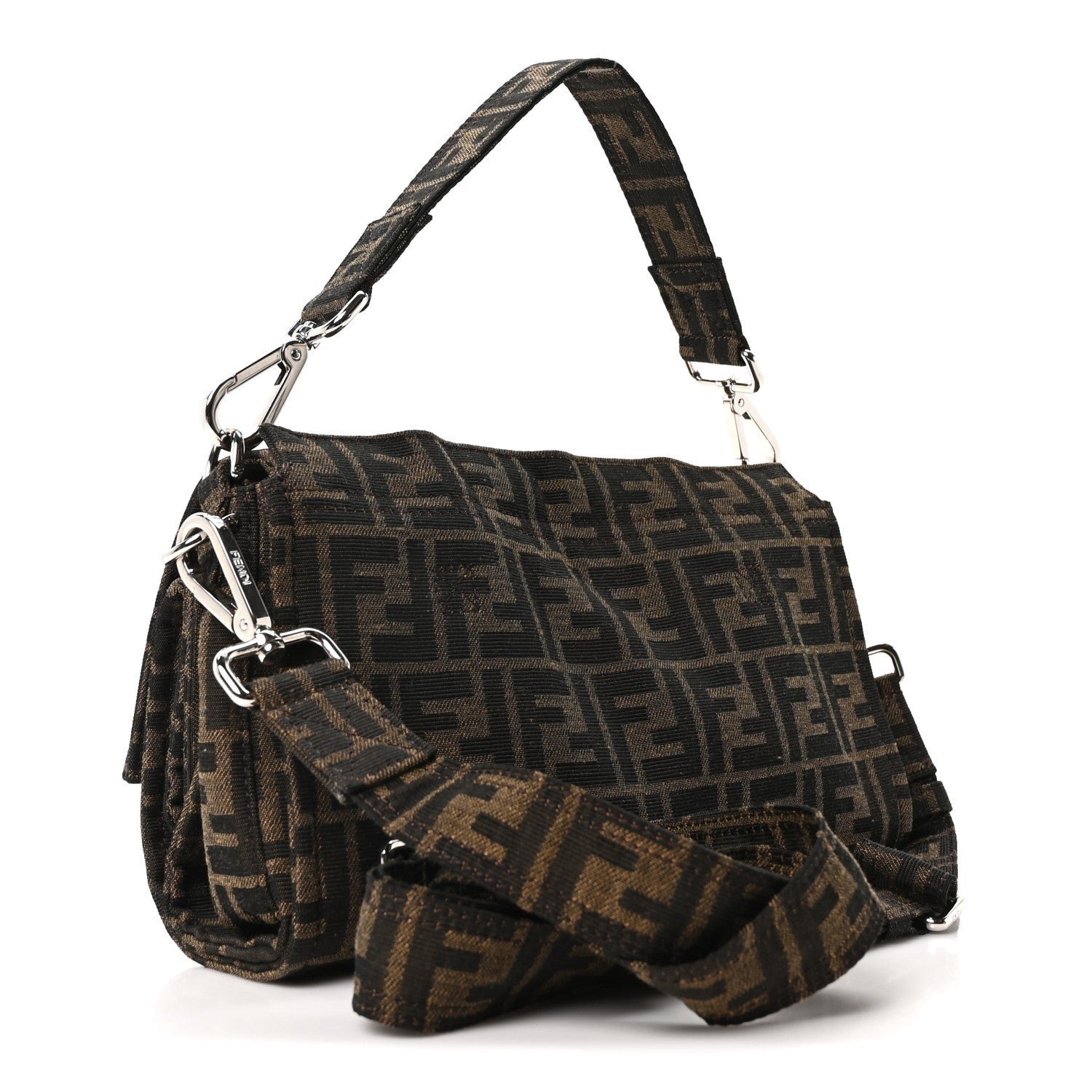 Crafted from the signature FF jacquard fabric in Tobacco and Moro (dark brown), the bag is distinguished by a bold “FRAGMENT” logo overlay embroidered across the front flap. The bag is finished with polished silver-finish metalware and features a versatile carrying system, including a detachable top handle and a leather shoulder strap.