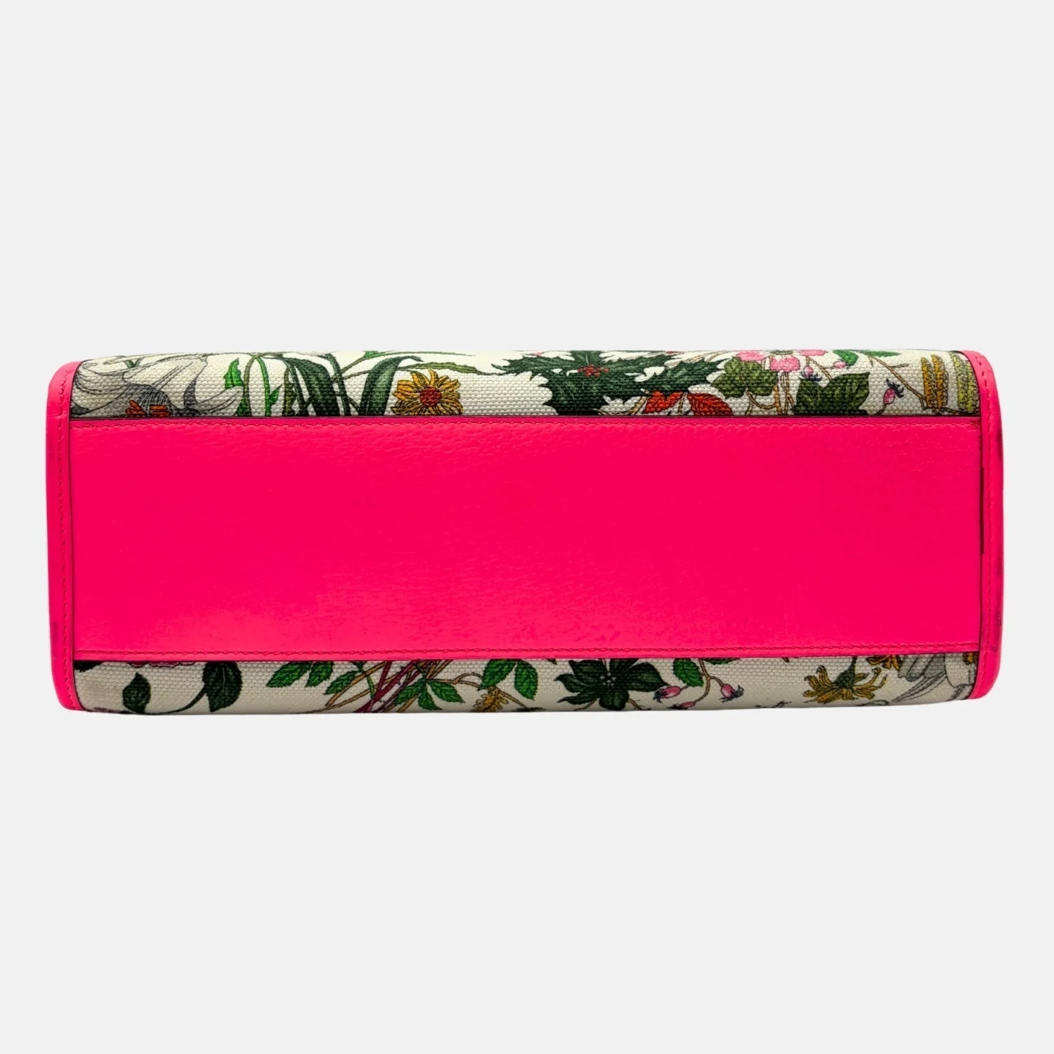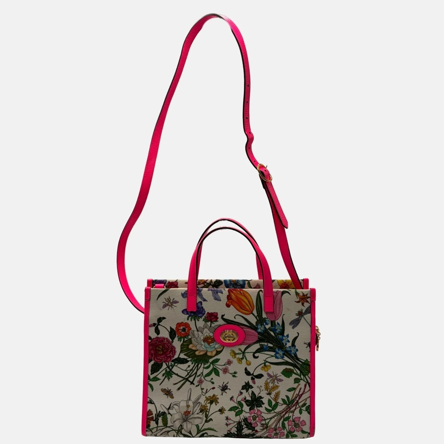 This Gucci tote showcases the brand’s iconic Flora print on coated canvas, a vibrant botanical motif that celebrates color and nature. Accented with bright pink leather trim and the signature GG oval logo detail, this bag perfectly balances playful elegance with classic Gucci craftsmanship. Spacious and structured, it’s ideal for daily use or as a standout travel piece.