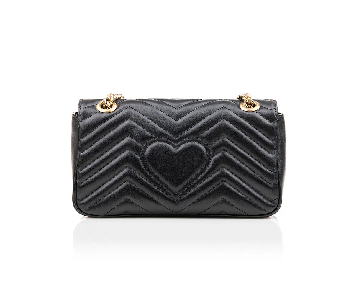 The small GG Marmont camera bag has a softly structured shape and a flap closure with Double G hardware. The sliding chain strap can be worn multiple ways, changing between a shoulder and a top handle bag. Made in matelassé chevron leather with a heart on the back.