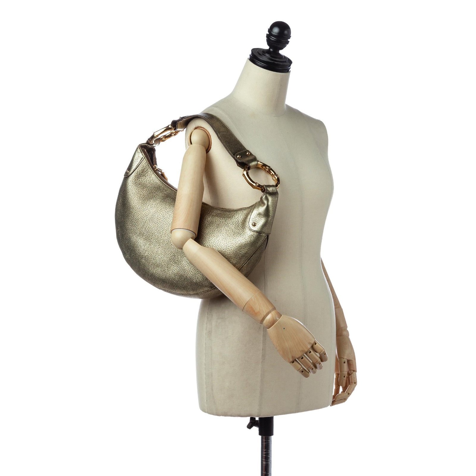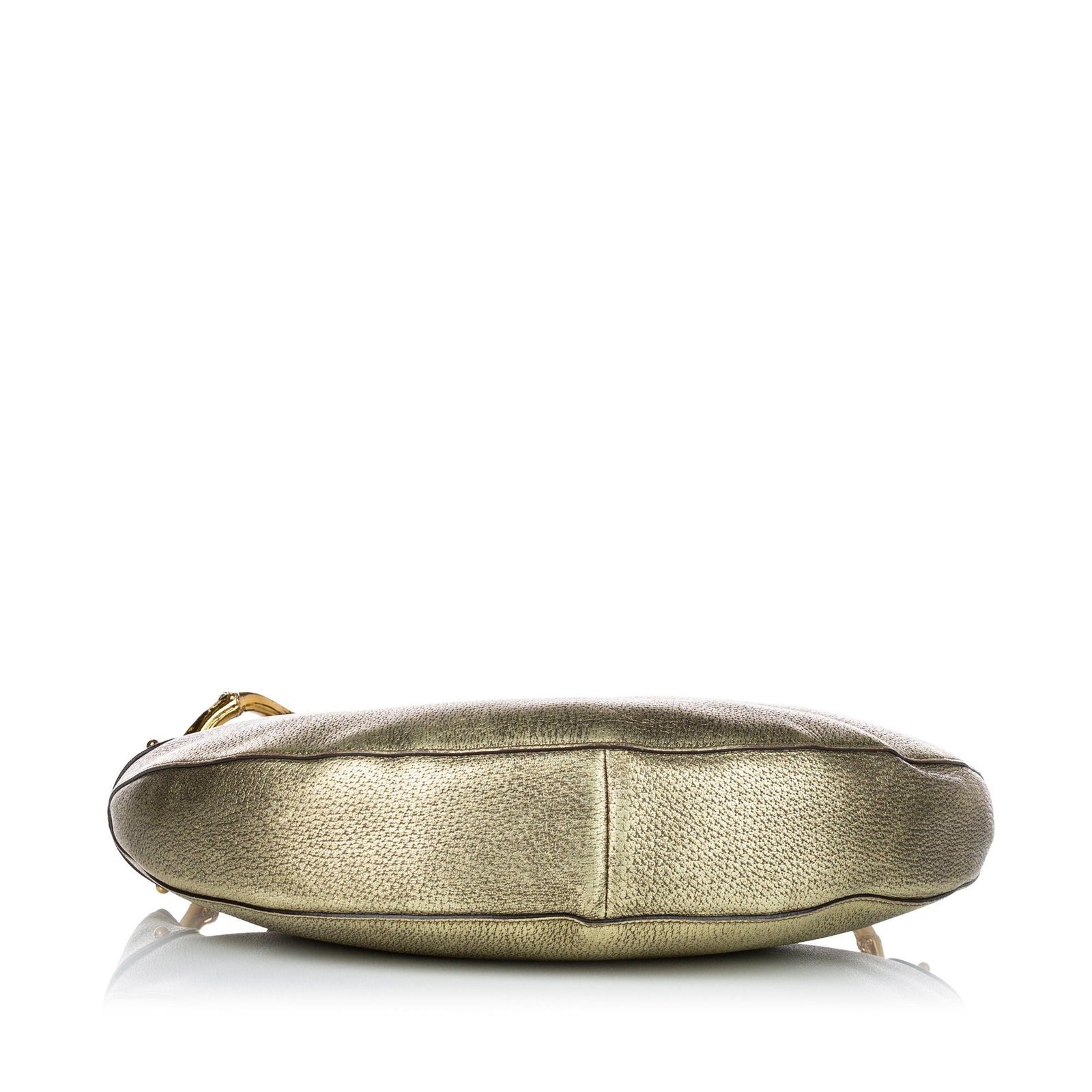 The Gucci Bamboo Ring Leather Hobo Bag is a sophisticated and elegant accessory that combines iconic Gucci design with modern functionality. Crafted from smooth calfskin leather in a luxurious gold tone, this hobo bag features the signature bamboo ring detail, creating a distinctive and stylish focal point.