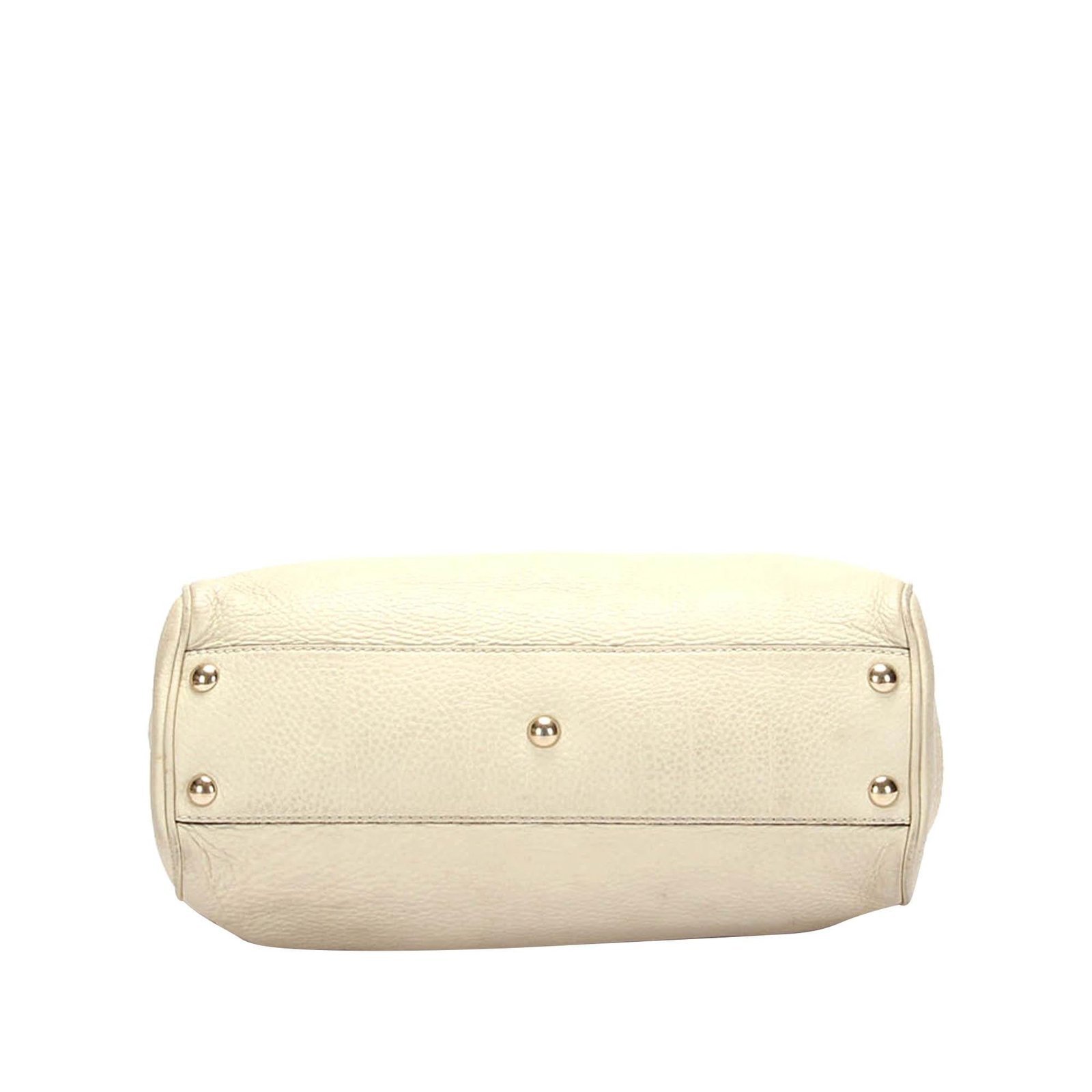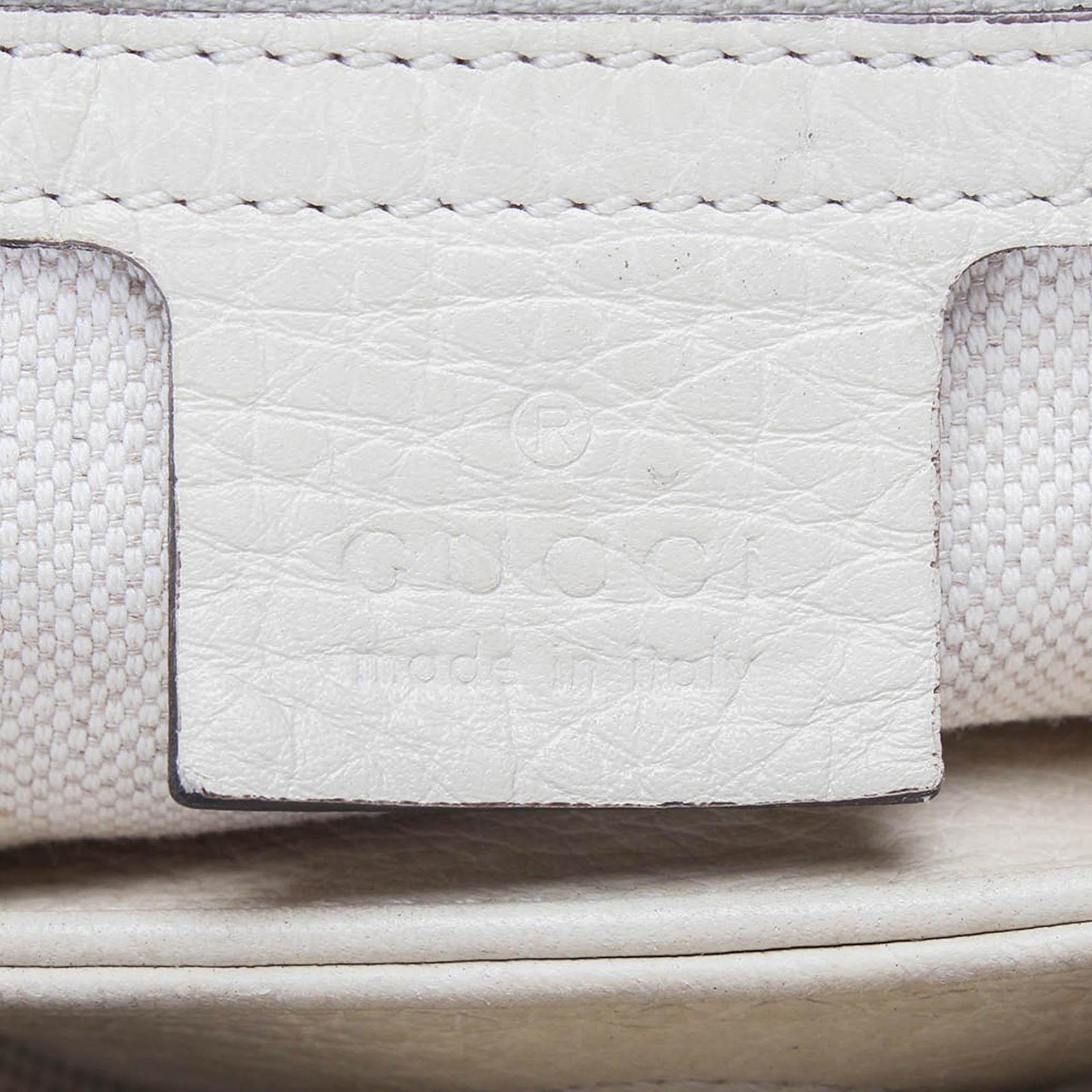 The Gucci Bamboo Shopper Leather Satchel is a chic and versatile accessory that blends classic Gucci craftsmanship with modern practicality. Crafted from a combination of smooth leather and pony-style calfskin, this satchel features the signature bamboo handles and a striking white color, creating a bold and elegant statement.