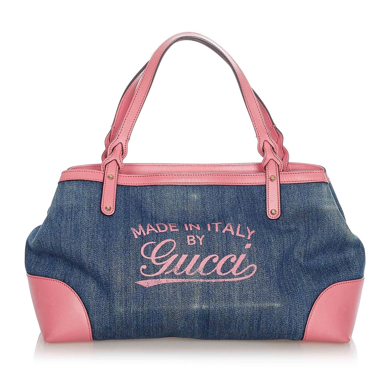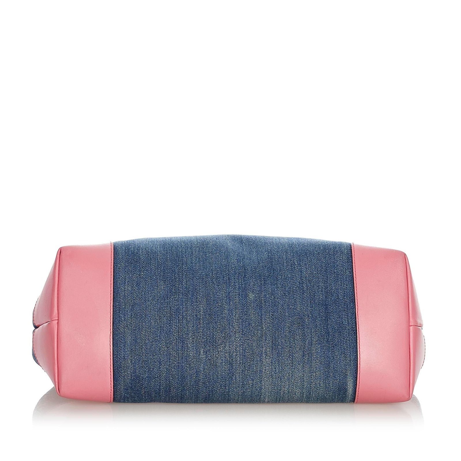 - Blue denim exterior with leather trim for added durability and elegance