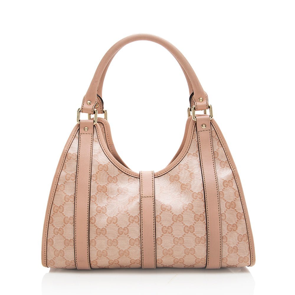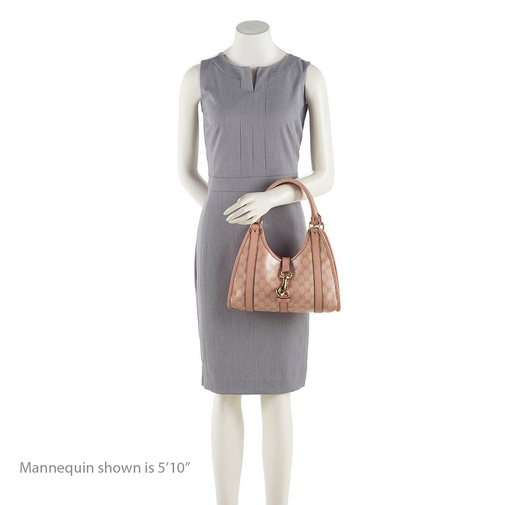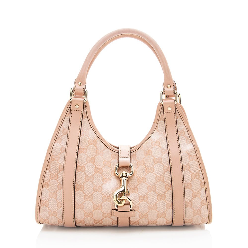 The Gucci Small Joy shoulder bag is a stunning, statement accessory that blends elegance with playful sparkle. Crafted from pink leather embossed with the iconic GG canvas motif, this bag is adorned with shimmering crystal detailing on the front, creating a luxurious, eye-catching finish. It features rolled leather handles for a comfortable handheld or shoulder carry and a lobster claw clasp closure for secure access to your belongings.