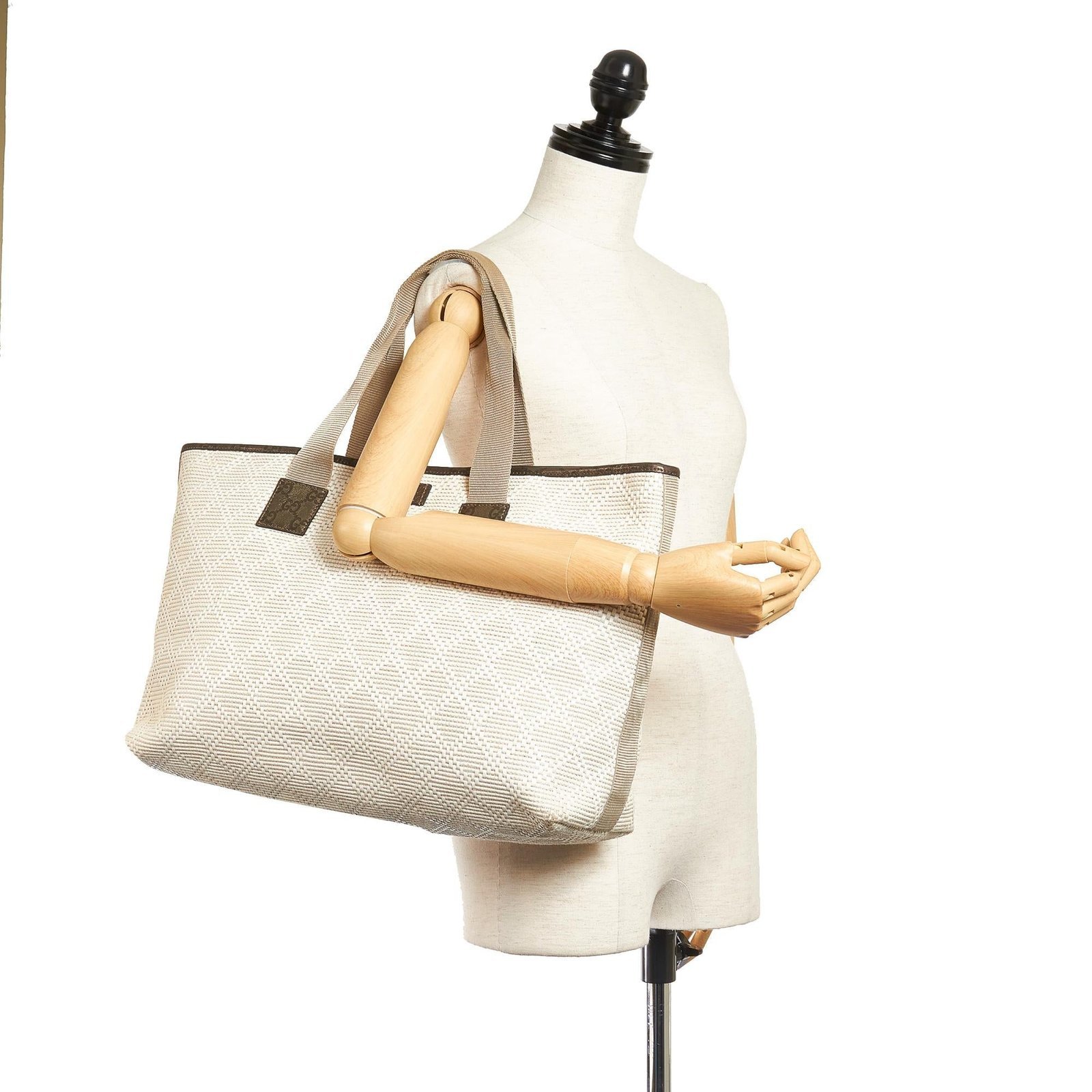 The Gucci Diamante Raffia Tote Bag is a chic and versatile accessory, perfect for everyday use or casual outings. Crafted from white Diamante canvas with raffia accents, this tote features a structured silhouette with flat handles and polished hardware for a refined designer finish.