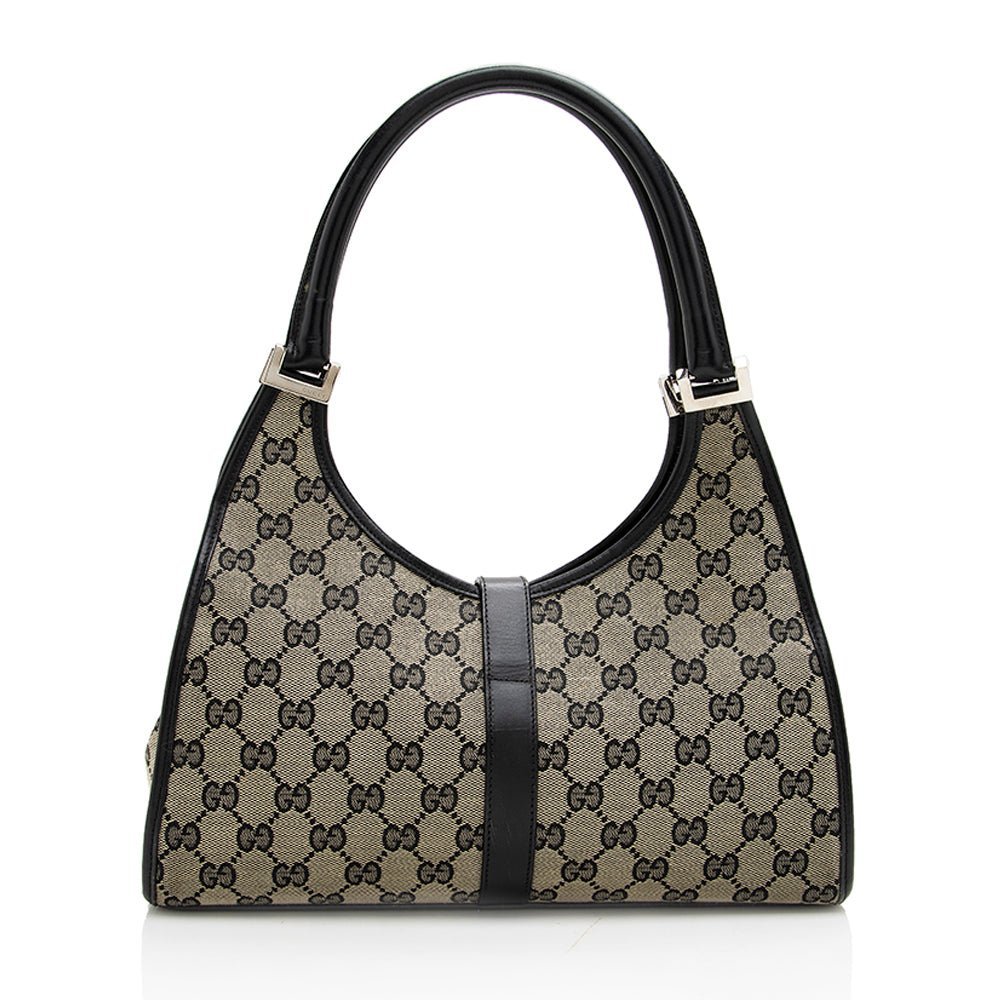 The Gucci GG Canvas Bardot Satchel is a stylish and compact hand bag crafted from GG canvas in black with gold accents. Its sleek silhouette and structured design make it perfect for elevating both casual and formal looks.
